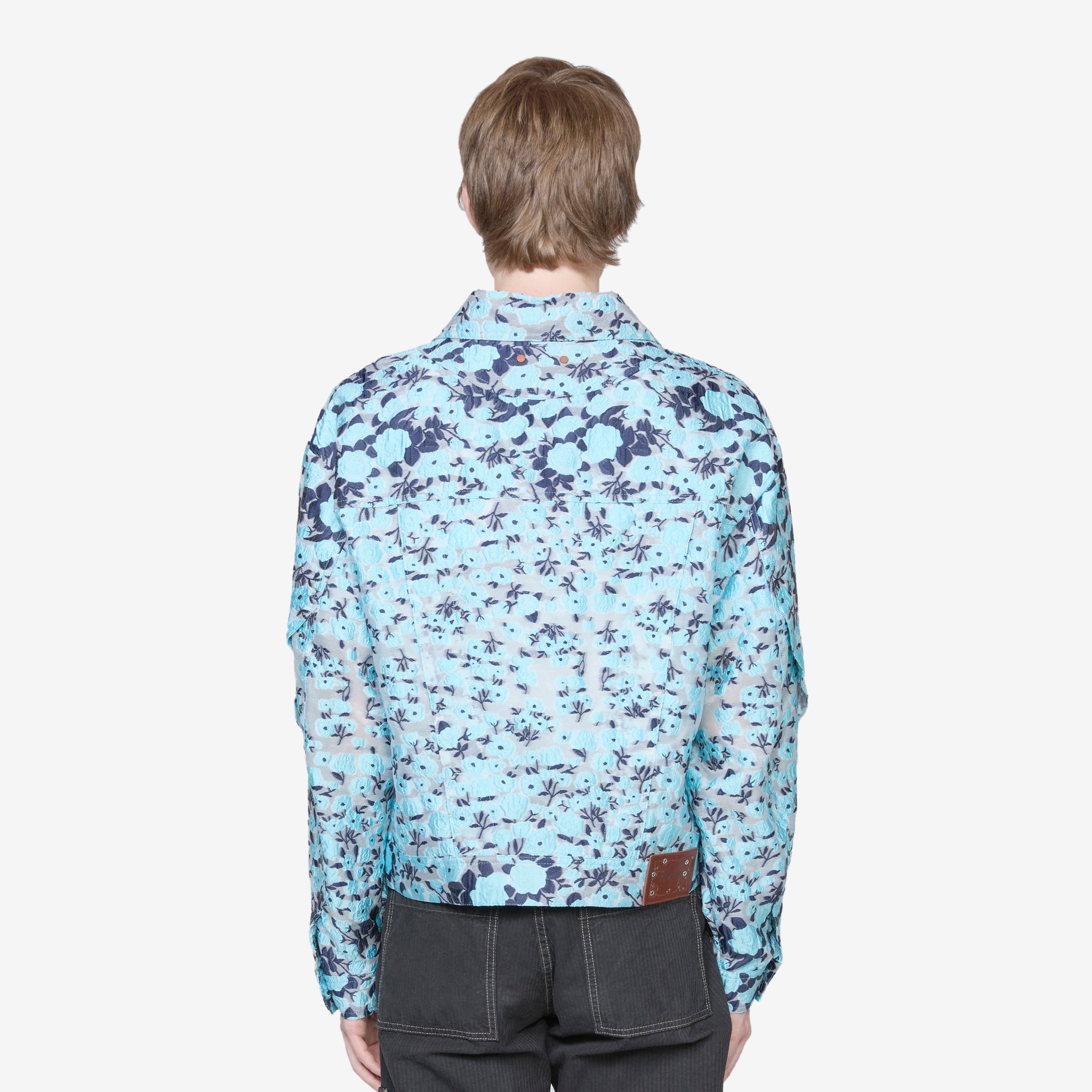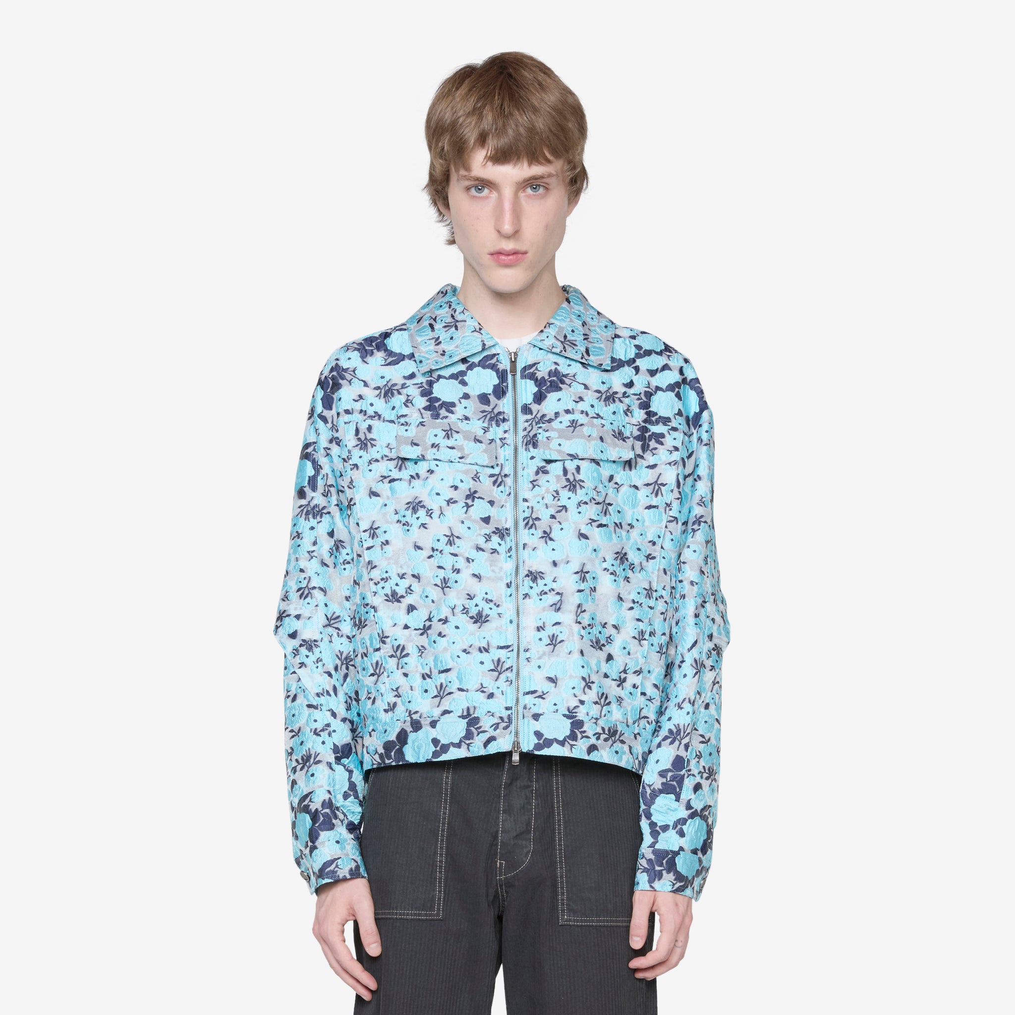 Men's Fabrian Flower Zip-Up Jacket in Sky Blue from Andersson Bell. Relaxed fit jacket with full two-way zip closure and buttoned cuffs. Crafted from a sheet floral lace fabric. Features two oversized patch pockets on the chest with button closure and finished with a leather jacron on the back waistband.
