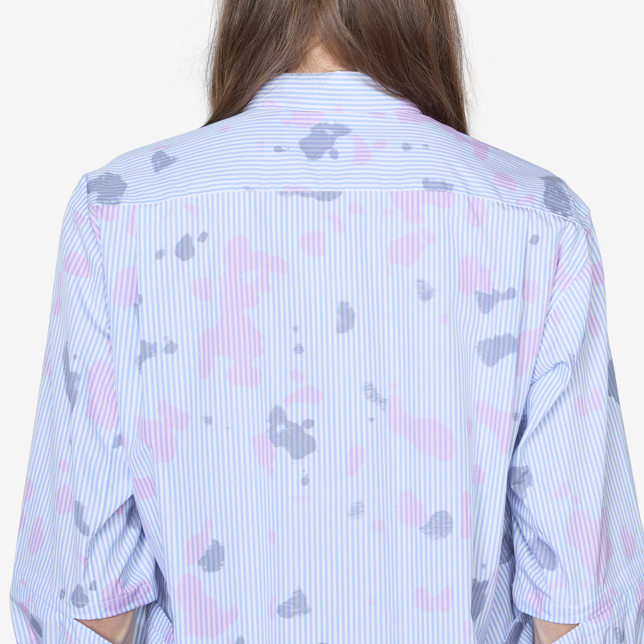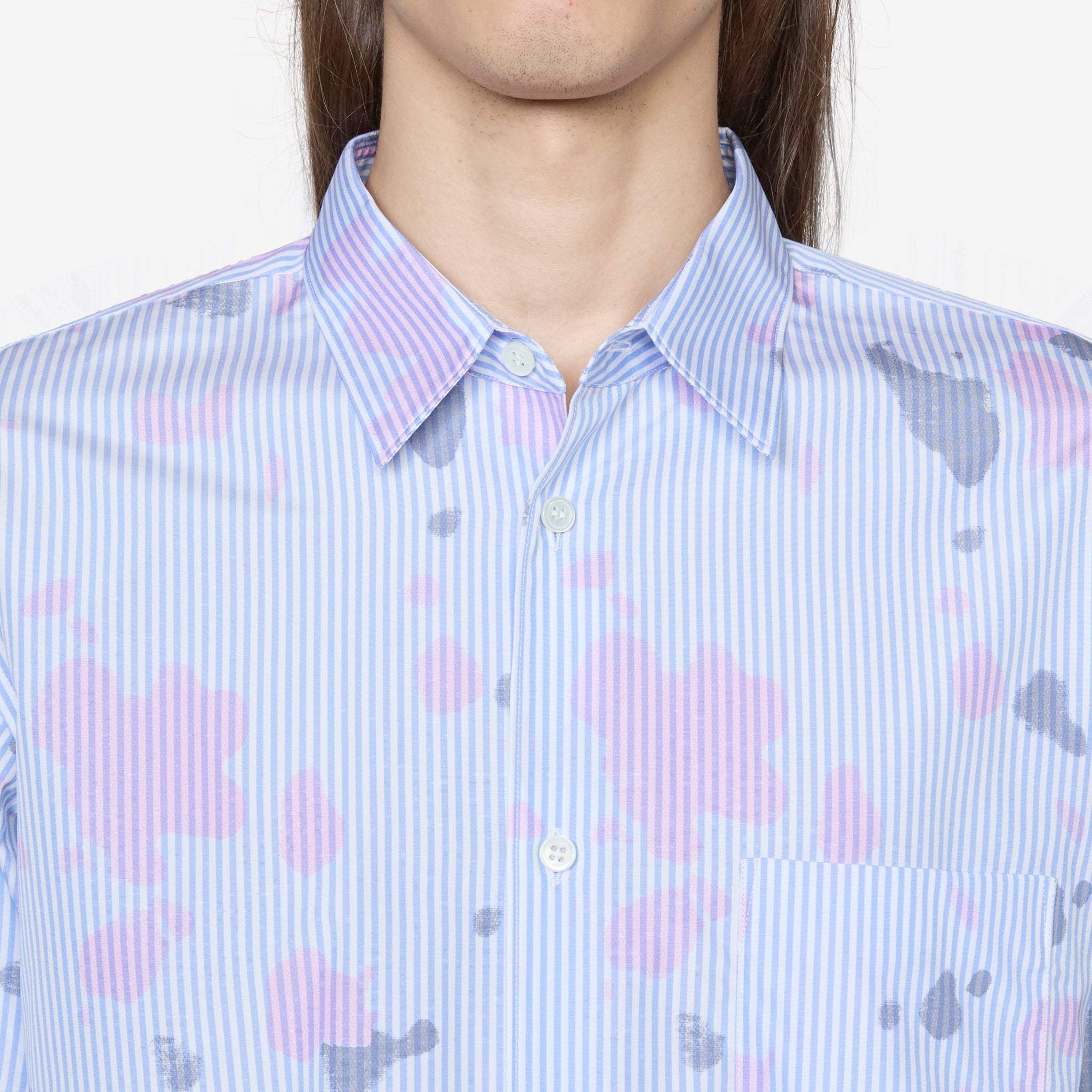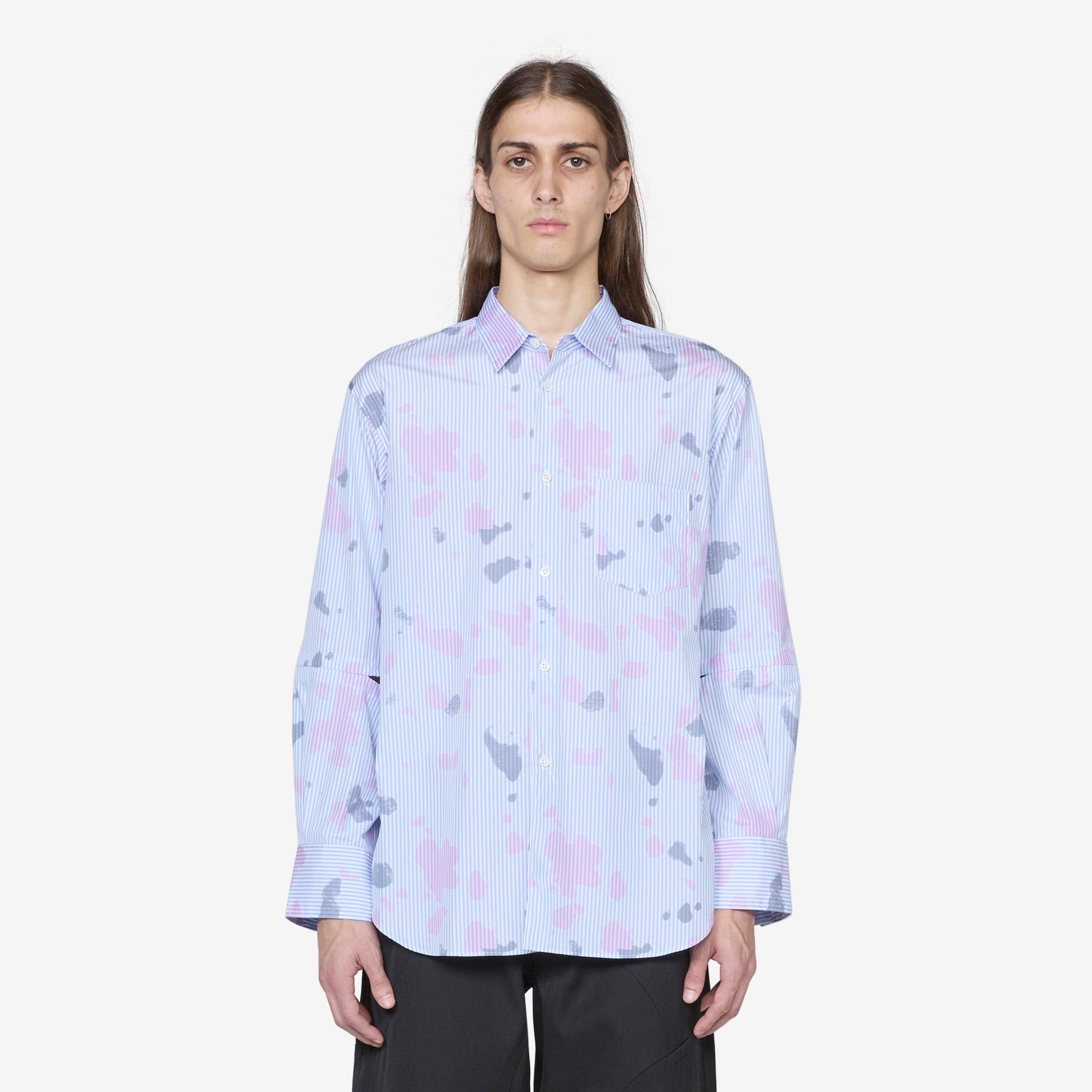 Men's Longsleeve Spray Paint Shirt in Stripe from Comme des Garçons SHIRT. Relaxed fit longsleeve shirt with a classic collar, full button closure, a curved hem and cut-outs on the sleeves. Crafted from striped cotton fabric with spray paint pattern all-over. Finished with a single patch pocket on the chest.
