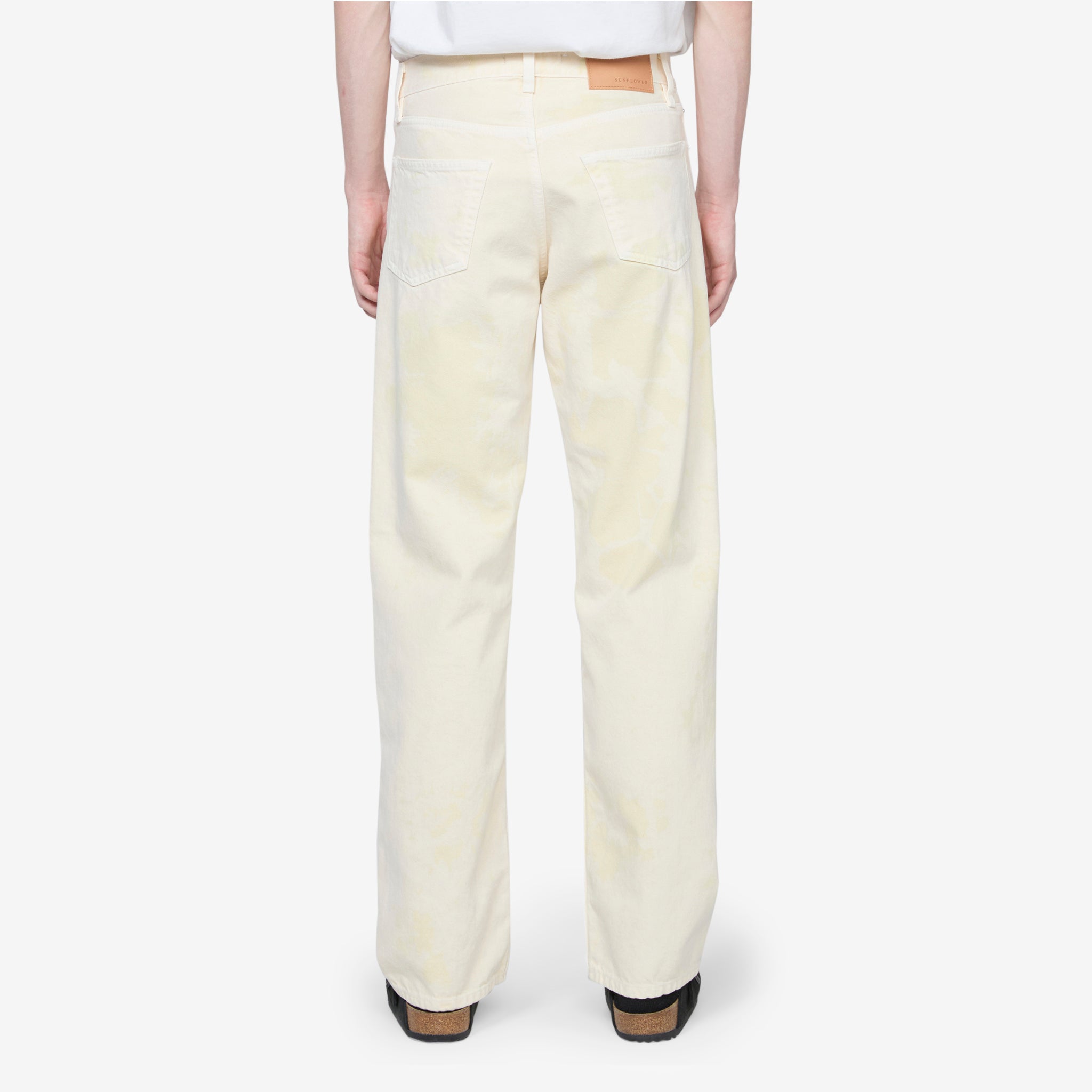 Men's Loose Jeans in Chalk from Sunflower. Loose fit jeans. Crafted from a traditional Italian 3x1 twill ecru denim which has been garment-dyed with  a bleach-spot effect all-over. 5 pocket styling. Finished with a branded leather jacron on the back waistband.