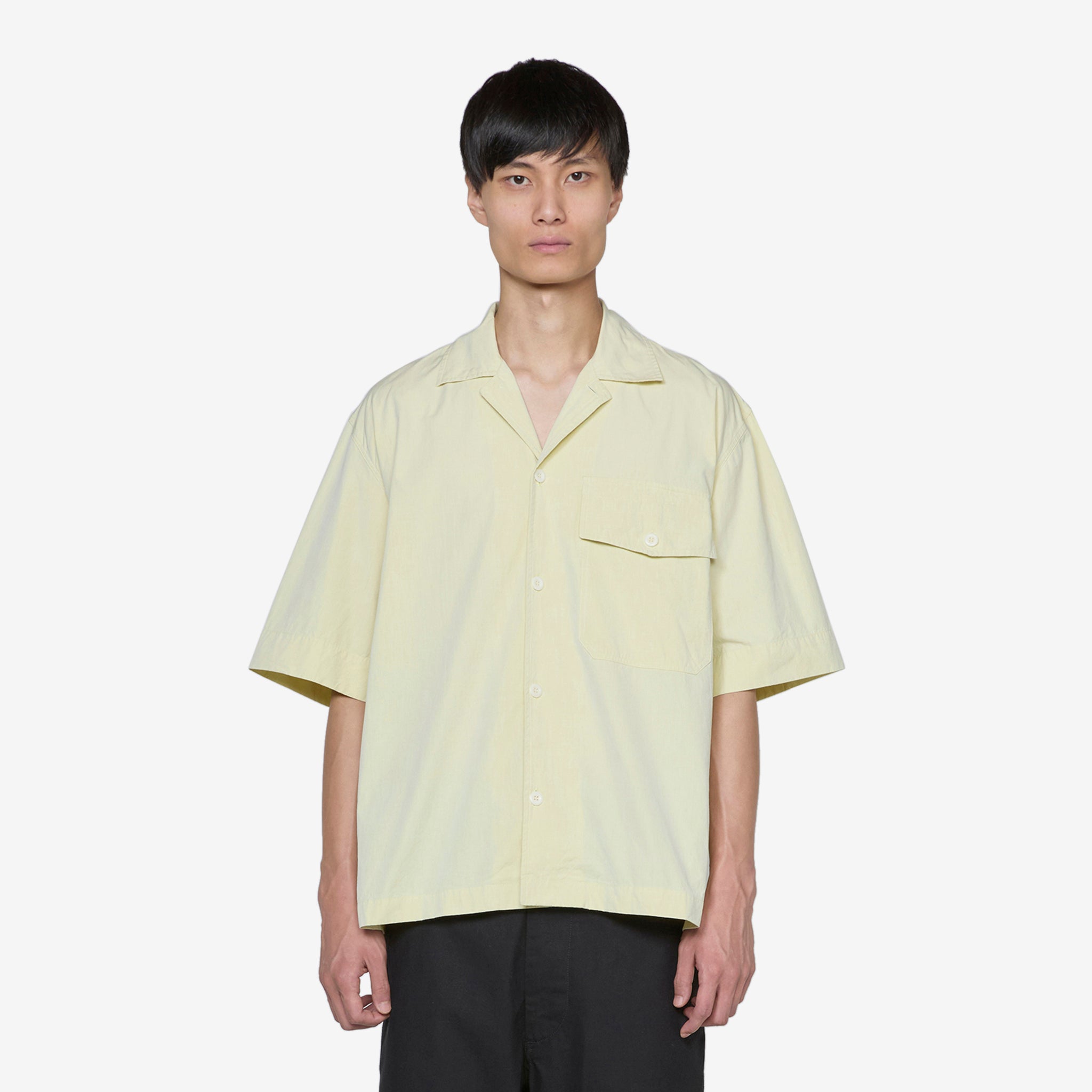 Men's MHL. Short Sleeve Flap Pocket Shirt in Pale Yellow from MHL. By Margaret Howell. Oversized fit short sleeve shirt with with full button closure, a straight hem and side split hem with herringbone tape detailing. Crafted from cotton canvas with corozo brace buttons.