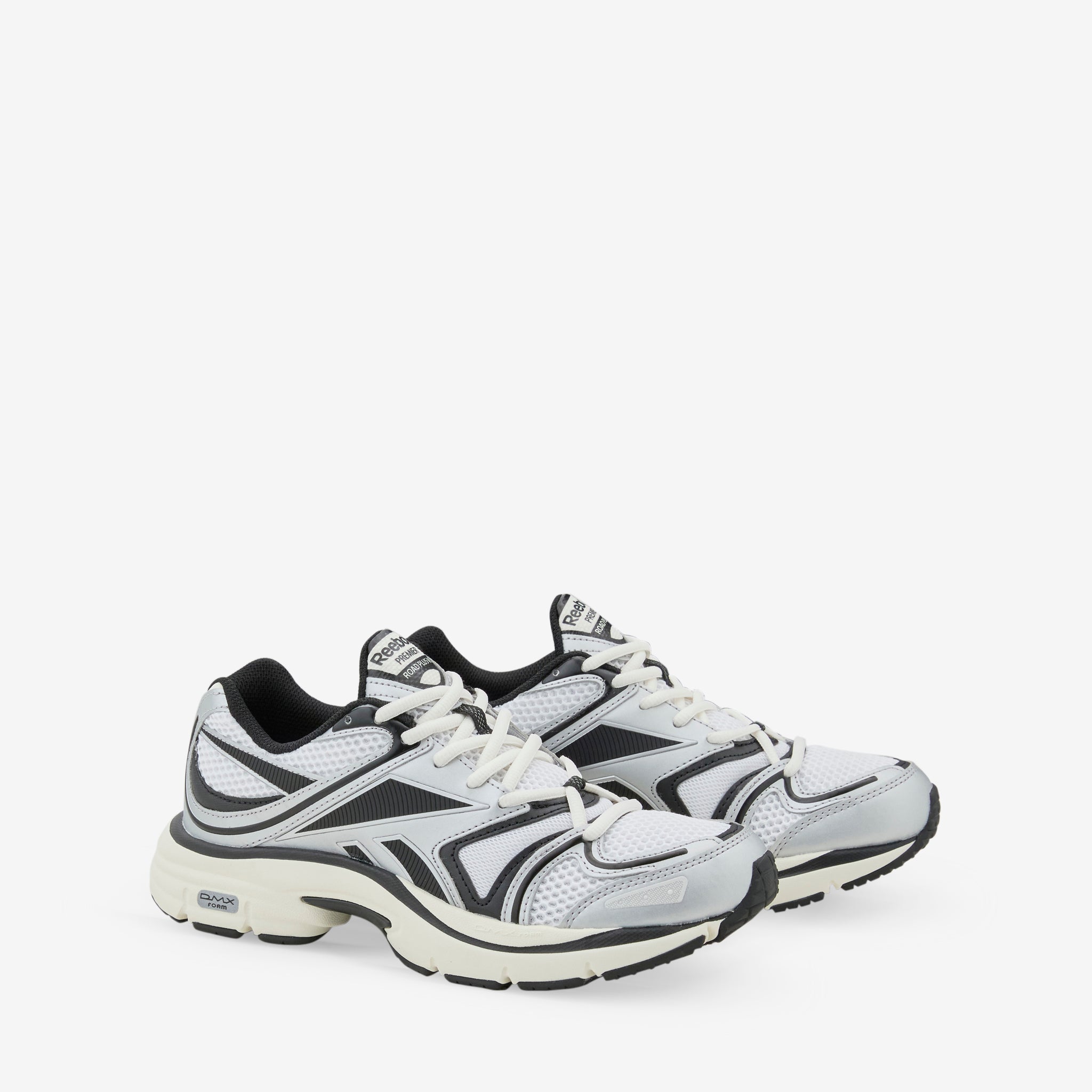 Men's RBK Premier Road Plus VI in Silver Metallic, White and Chalk from Reebok. Tonal, textile upper with synthetic leather overlays. Features a TPU midfoot transition plate and DMX foam cushioning for lightweight cushioning. Finished with a rubber outsole for traction.