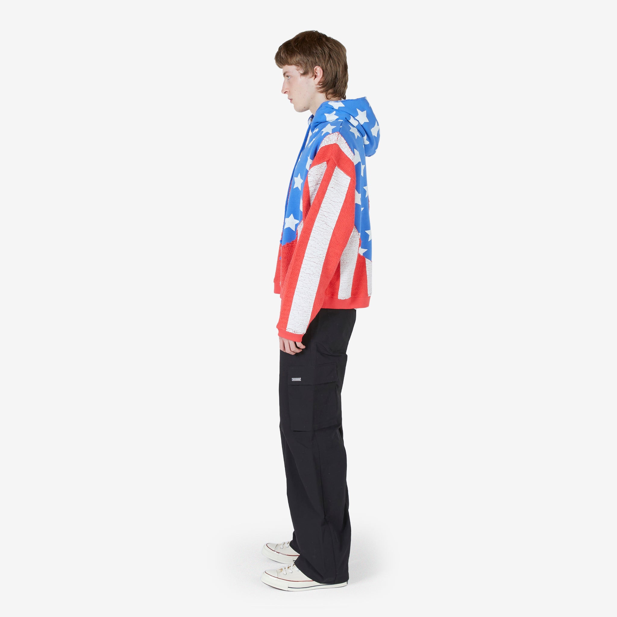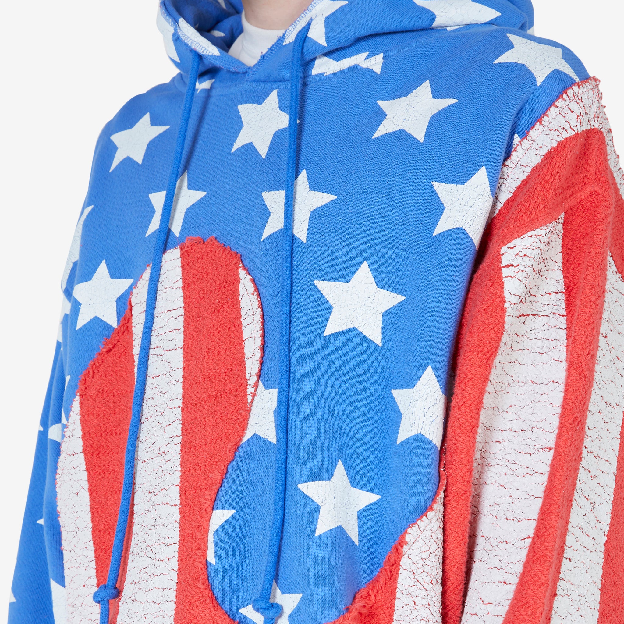 Unisex Stars and Stripes Swirl Hoodie in Blue from ERL. Boxy fit pullover hooded sweatshirt with a drawstring hood and ribbed cuffs and hem. Crafted from cotton with a swirl pattern and contrasting patterns. Finished with printed branding on the hood and distressing detailing throughout.