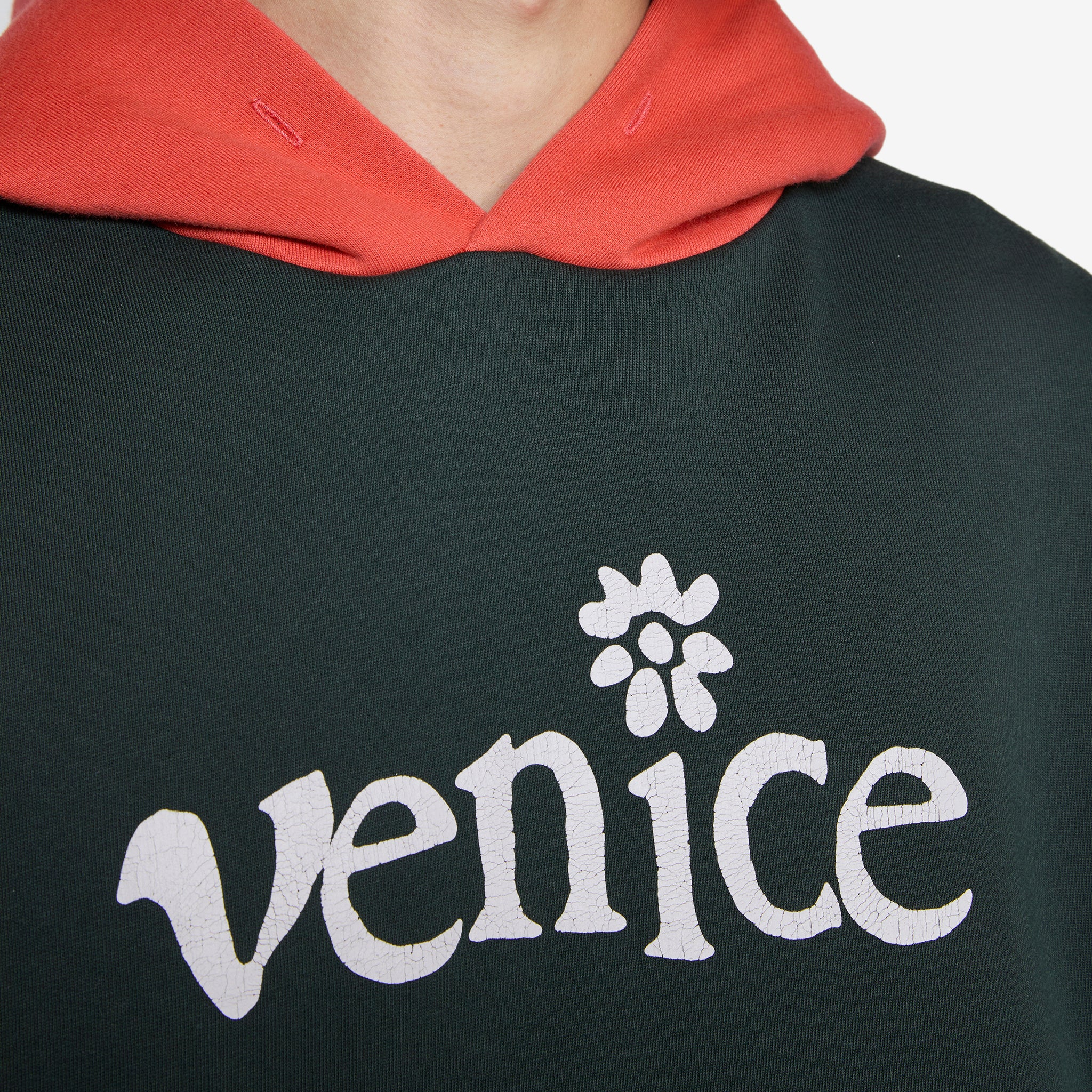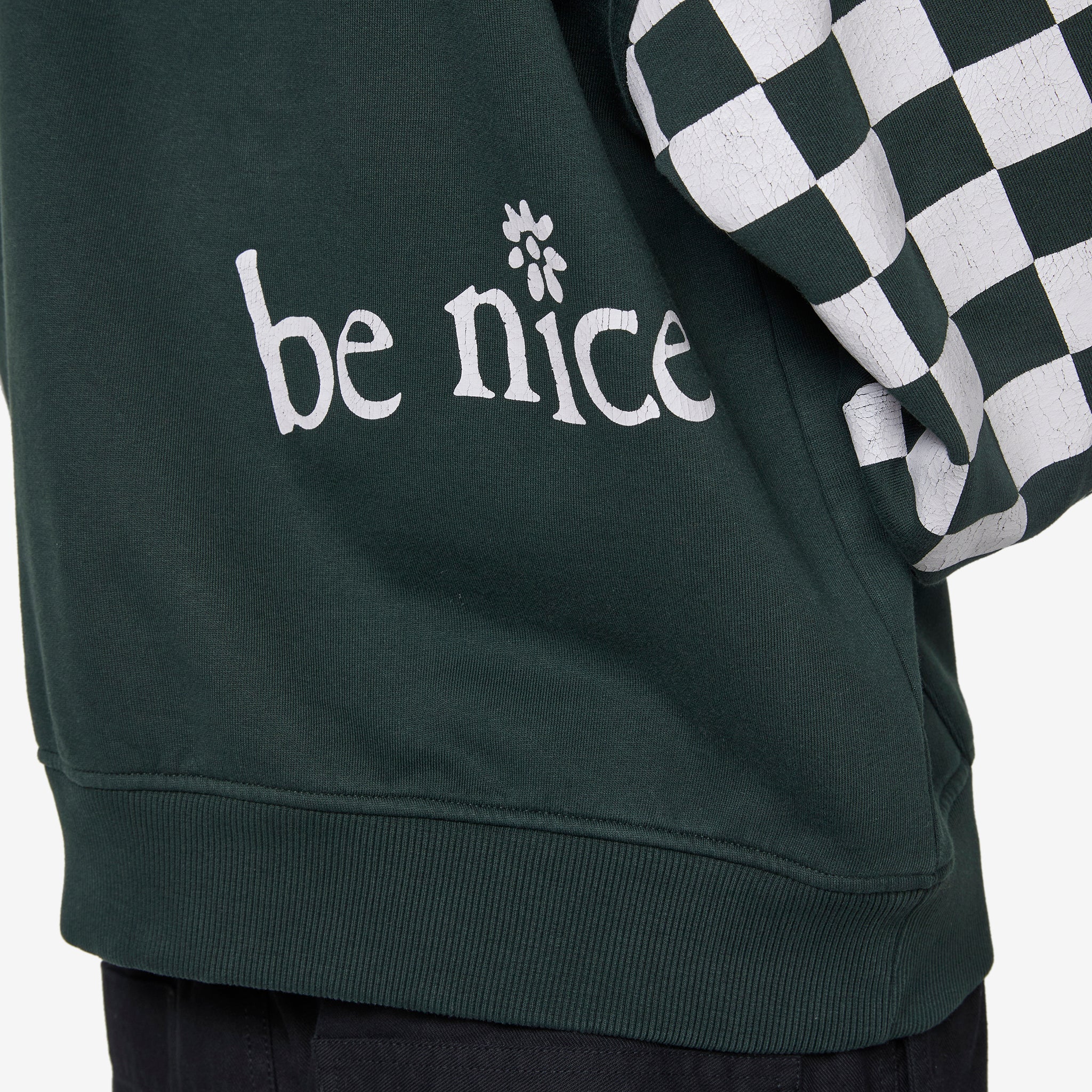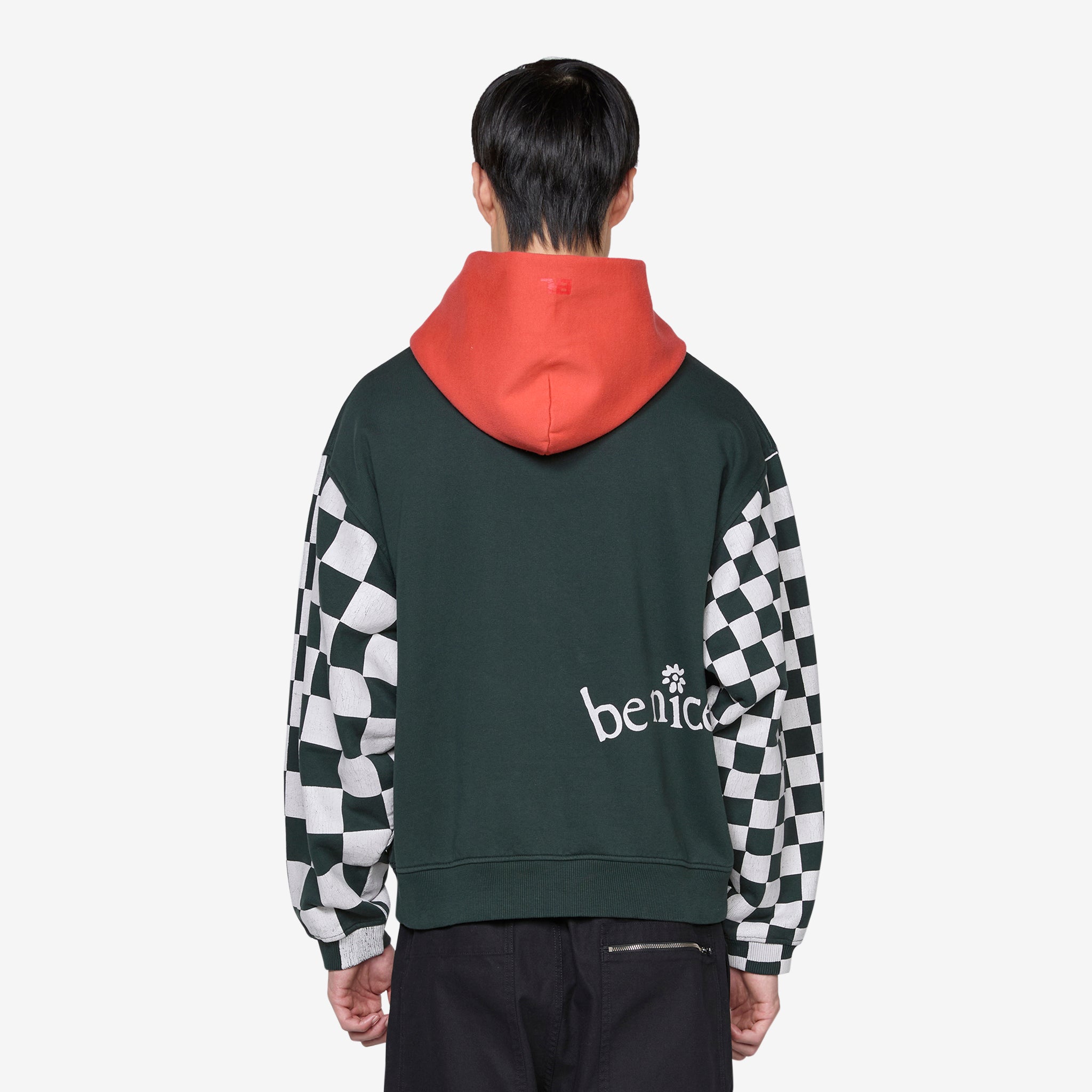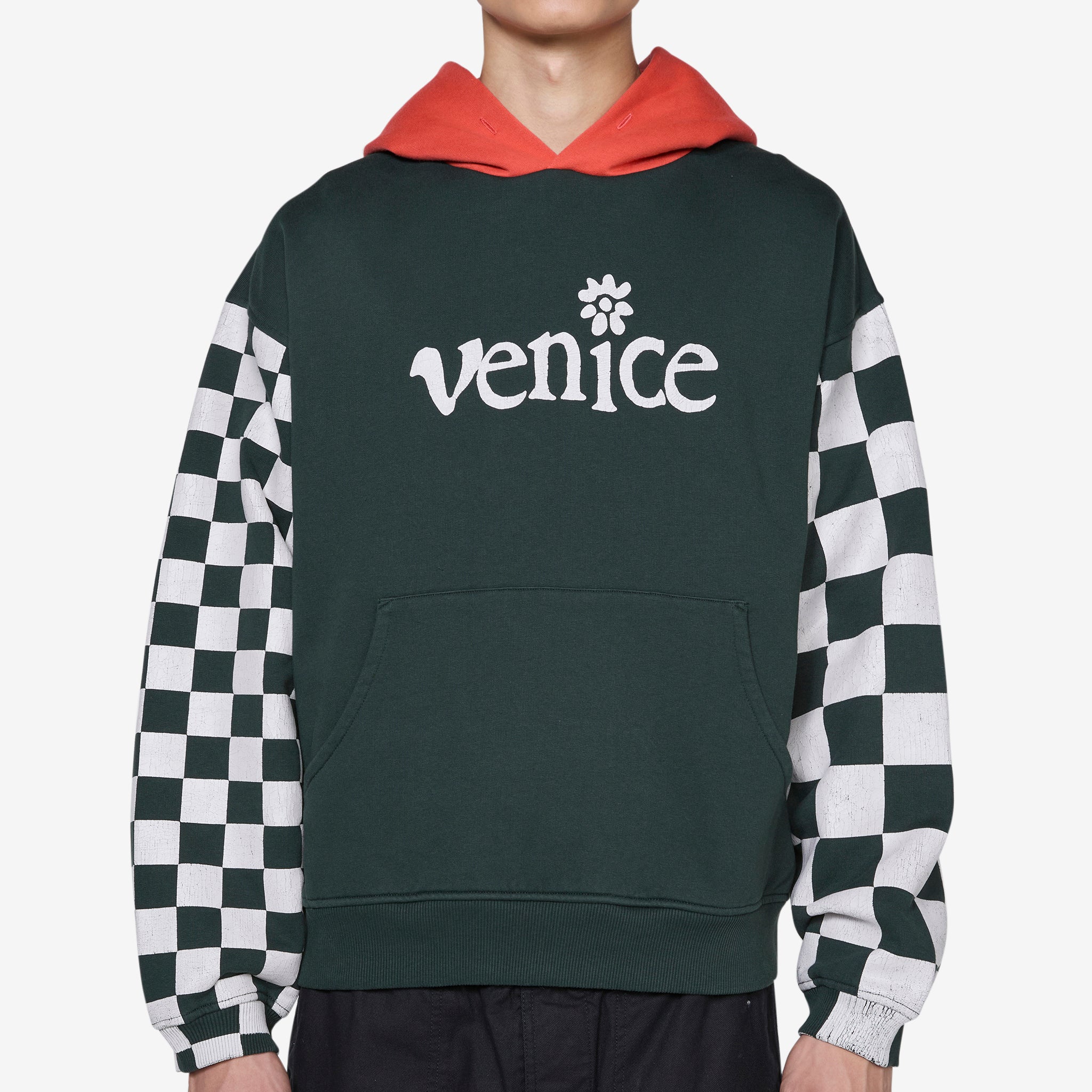 Men's Venice Checker Sleeve Hoodie in Black from ERL. Relaxed boxy fit hoodie with a contrasting double faced hood. Screen printed graphics on the front, rear and sleeves. Kangaroo pocket.