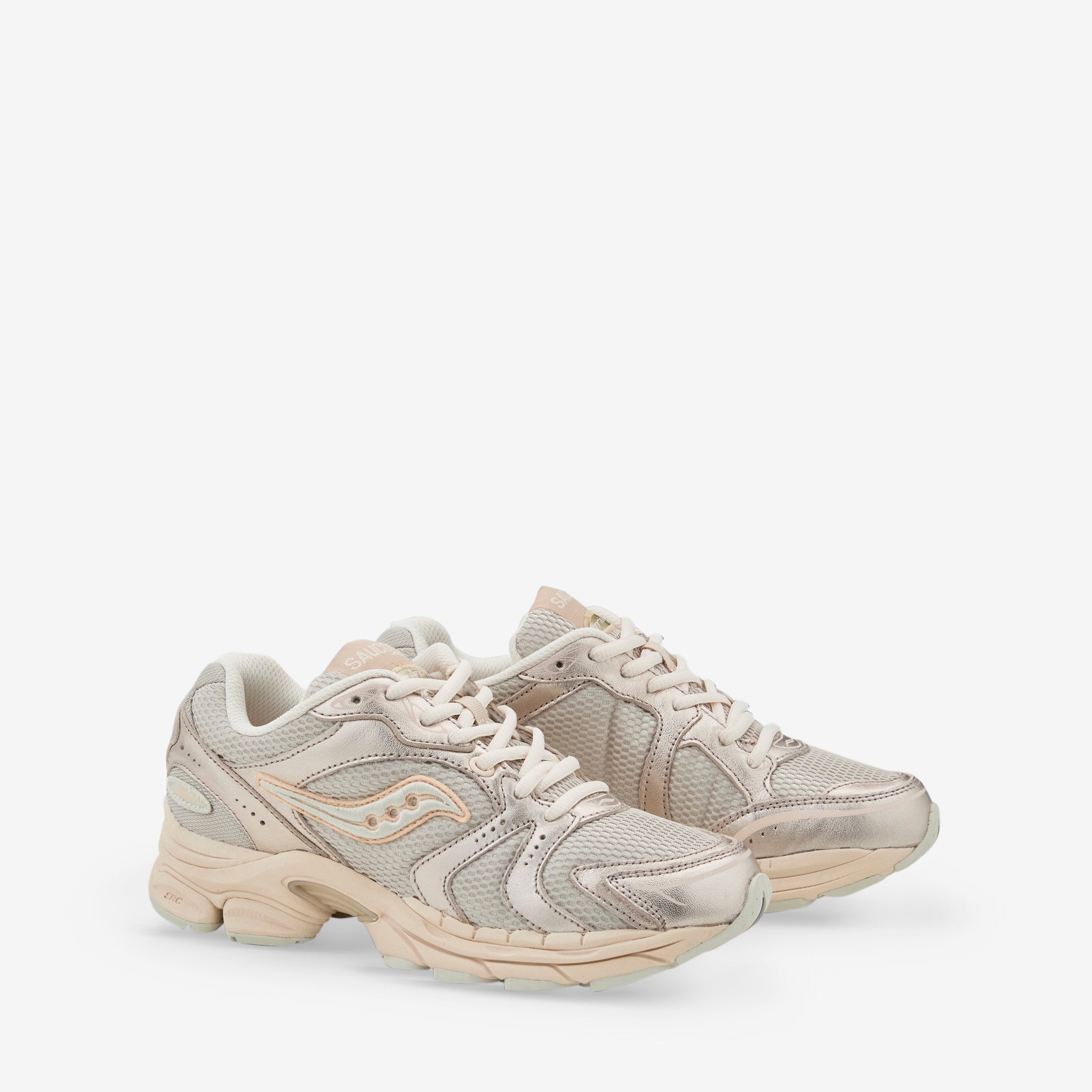 Women's Progrid Triumph 4 in Champagne from Saucony. Mesh upper with synthetic textile overlays. Cushioned sole and rubber outsole for traction.