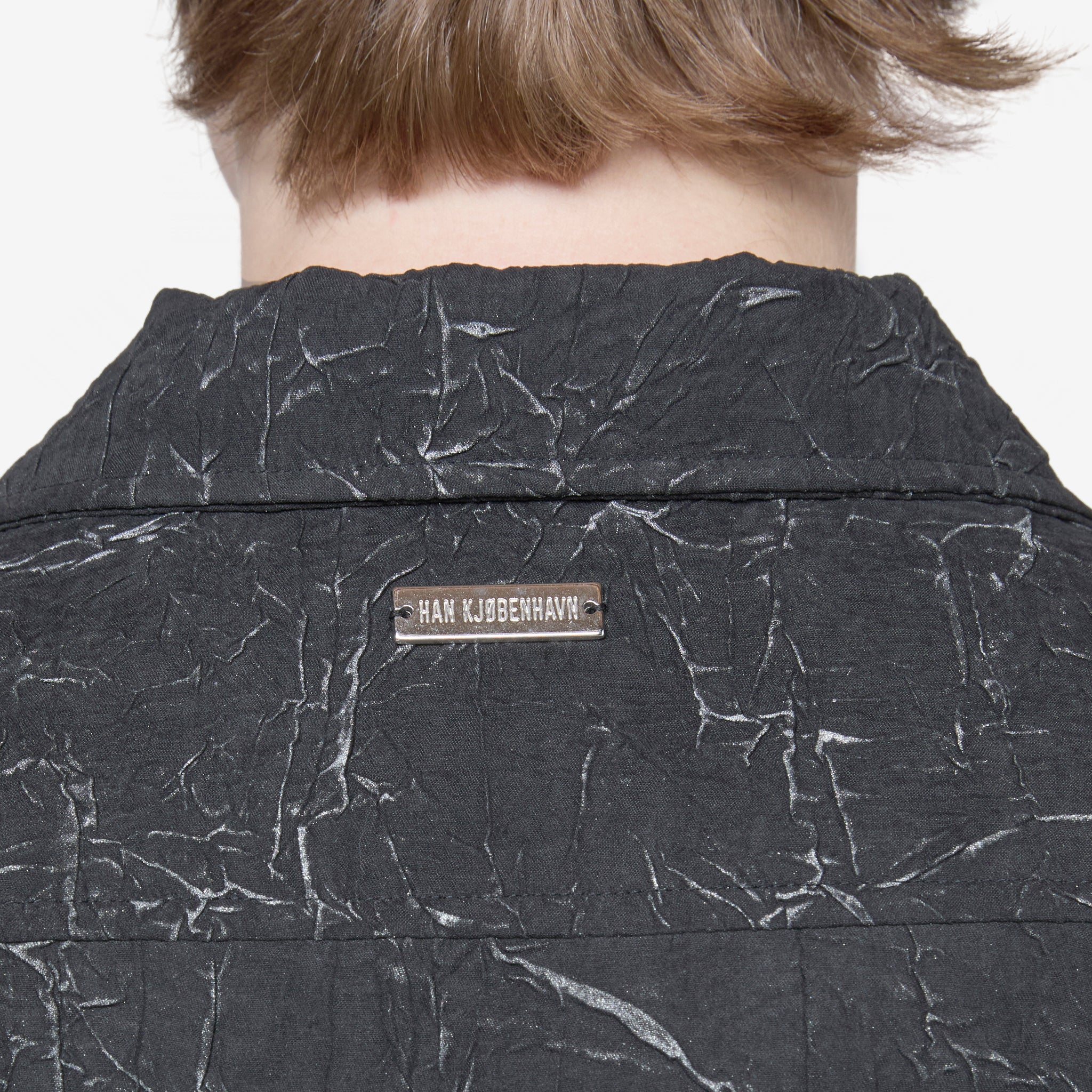 Men's Wrinkle Bowling Short Sleeve Shirt in Black from Han Kjøbenhavn. Boxy fit short sleeve shirt with full button closure and a spread collar. Crafted from a 3D-structured fabric with an all-over texture. Finished with branded metal hardware on the back neck.