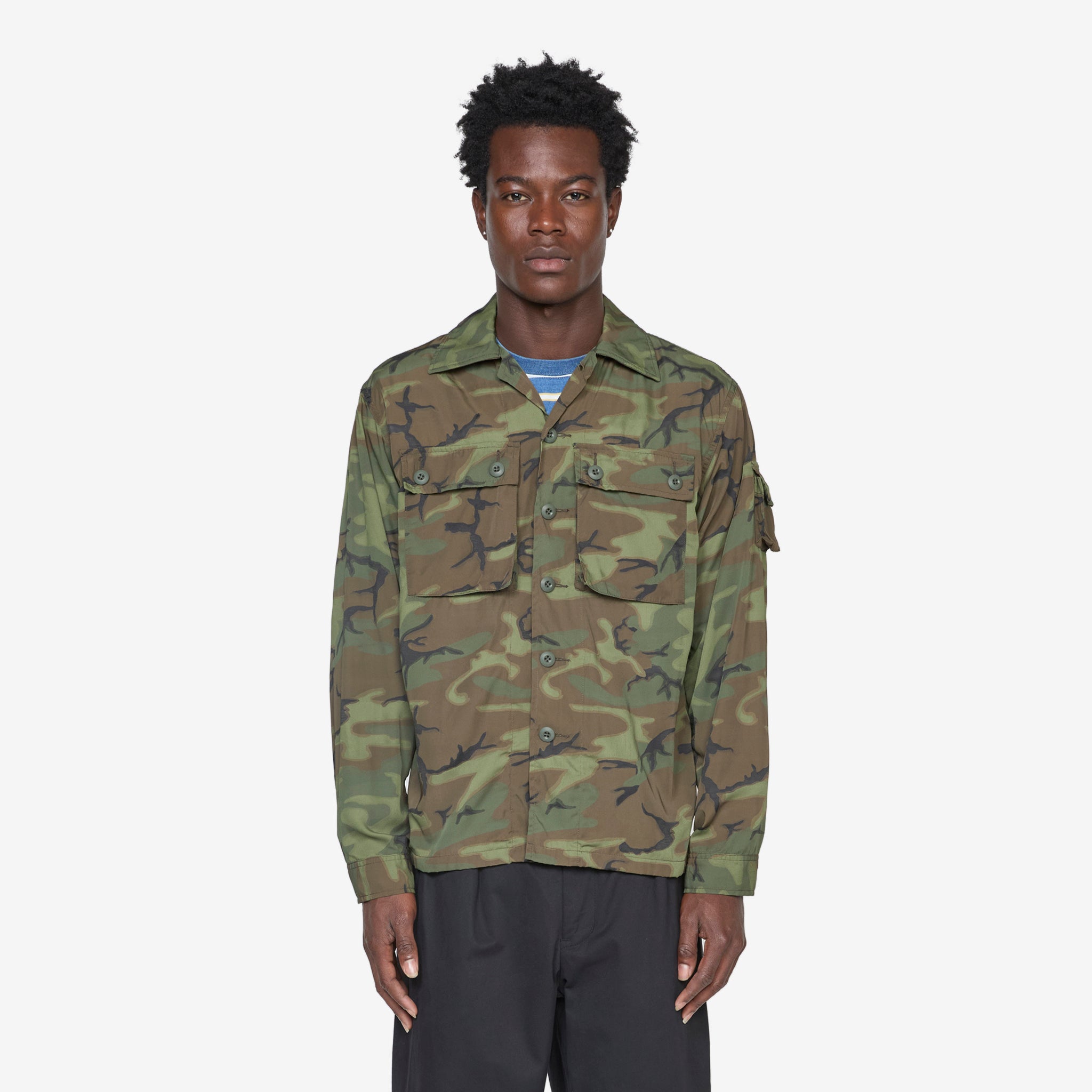 MIL-SHT Mesh Camo Jacquard Mapping Print in ERDL Camo from Beams Plus. Regular fit military-style jacket with an open collar, full-button closure and side slash pockets. Crafted from a lightweight, jacquard polyester in an ERDL camo print. Finished with button closure patch pockets at the chest and left arm.
