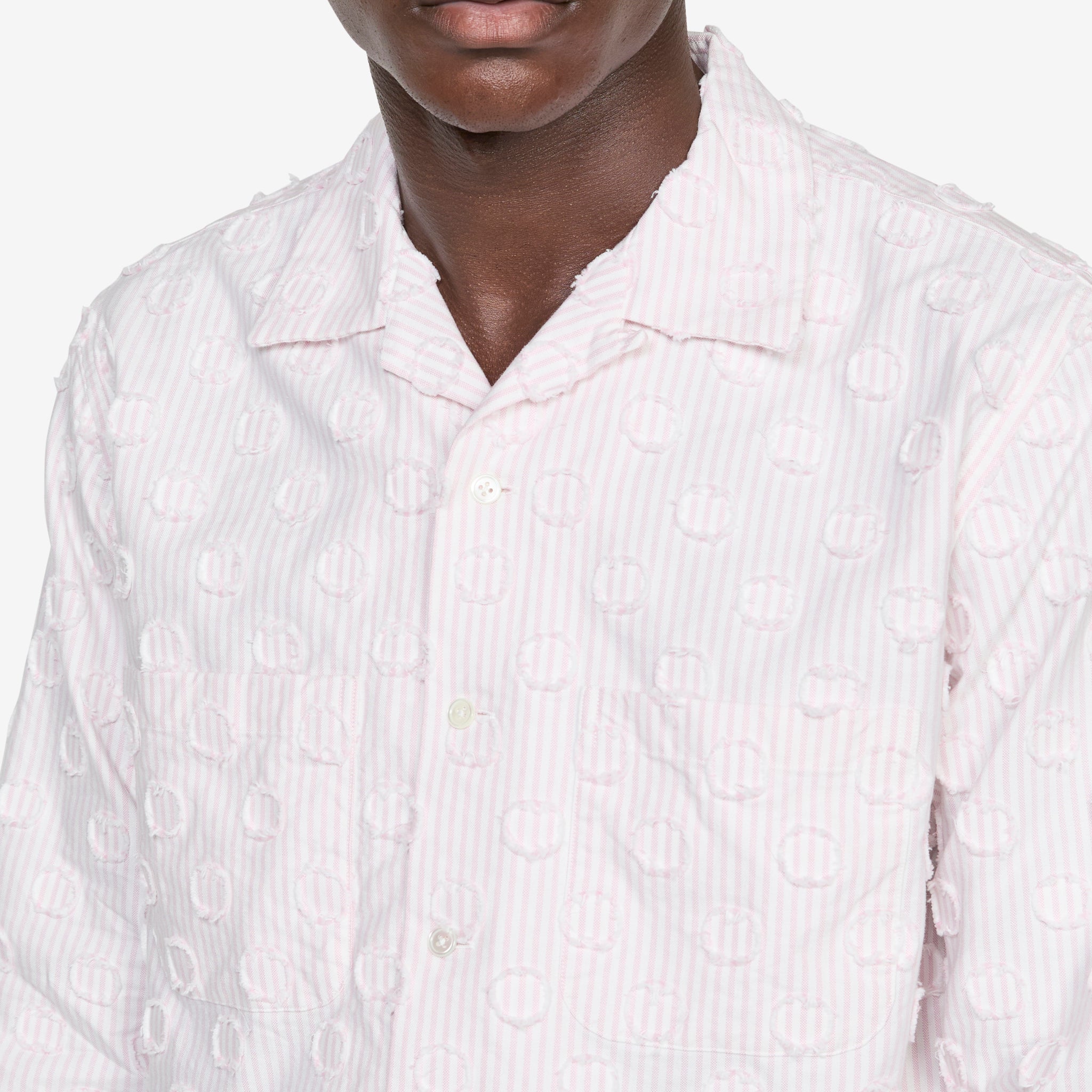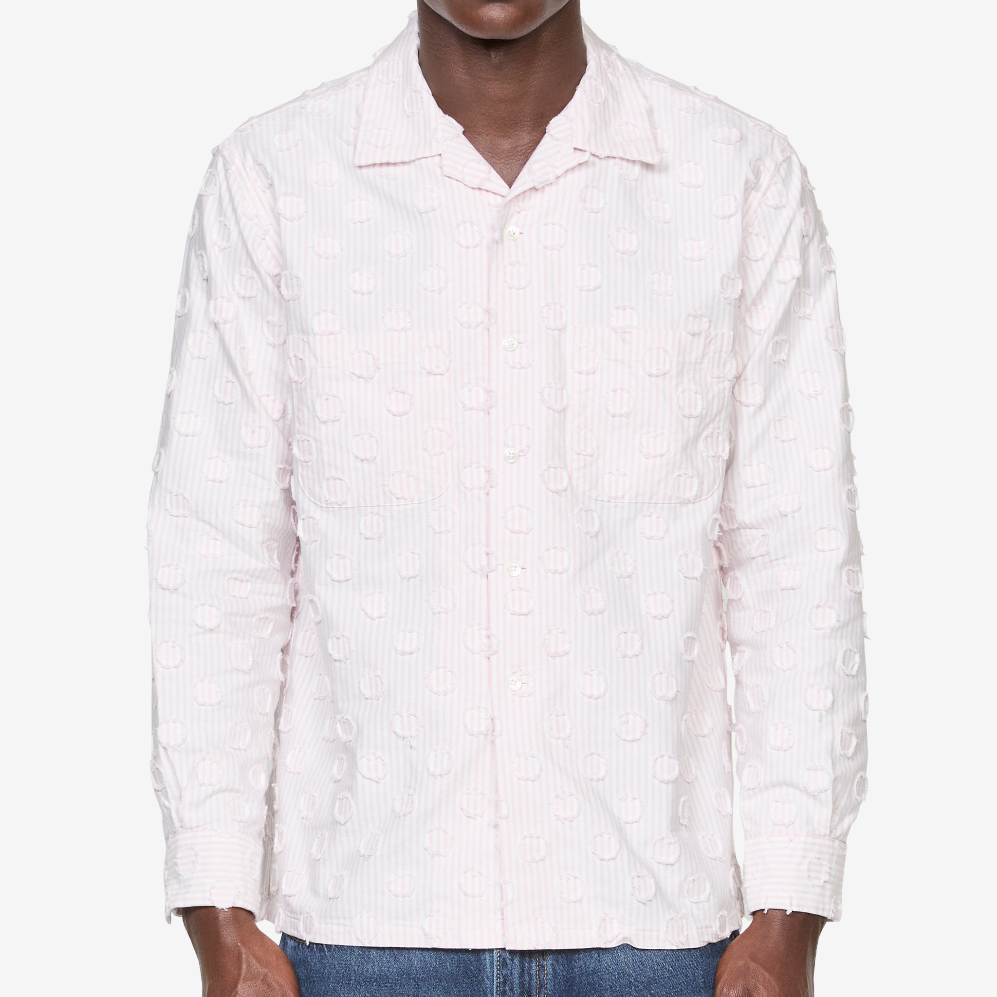 Open Collar Burnout Dot Candy Stripe Shirt in Pink Stripe from Beams Plus. Regular fit shirt with a camp collar, button-down closure, chest pockets and curved hem. Crafted from cotton in a pink stripe. Finished with raw hem applique dots all-over.