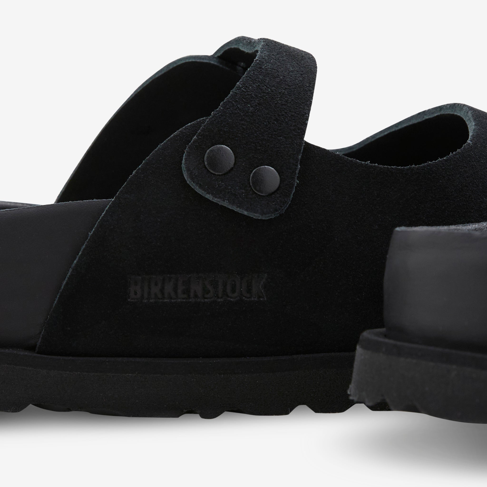 Unisex Maria 1774 Suede in Black from Birkenstock 1774. Hand crafted clogs with a premium suede upper and anatomical shaped Birkenstock footbed. Handcrafted in Germany with a Mary Jane-style open forefoot and buckle closure. Finished with subtle embossed branding.