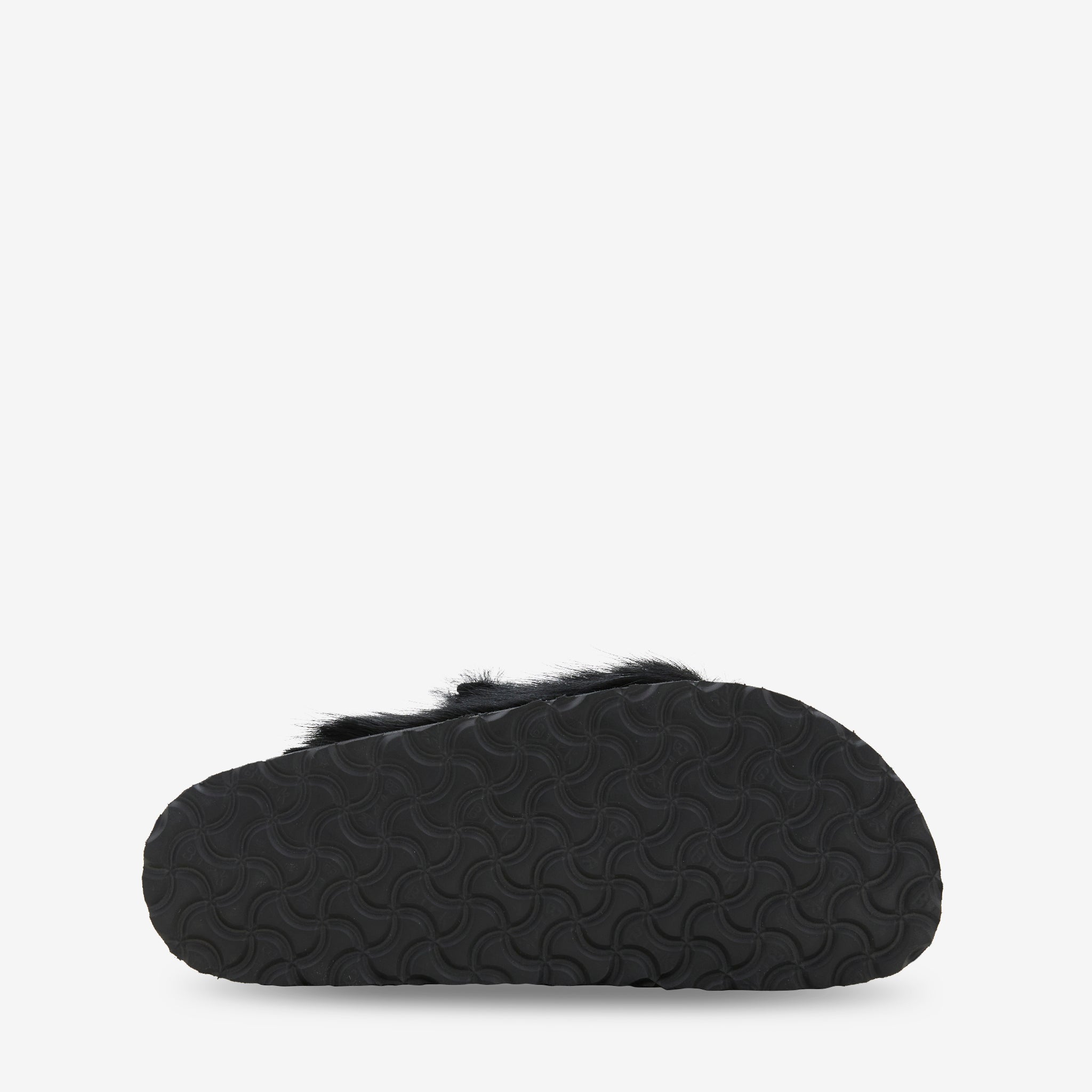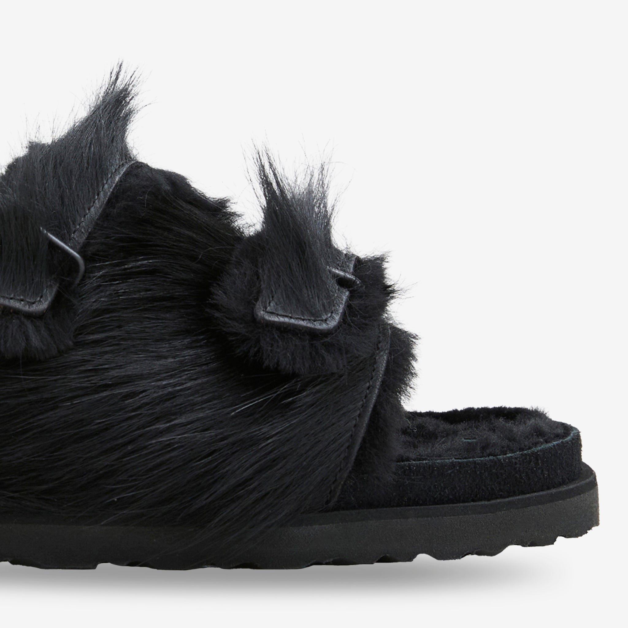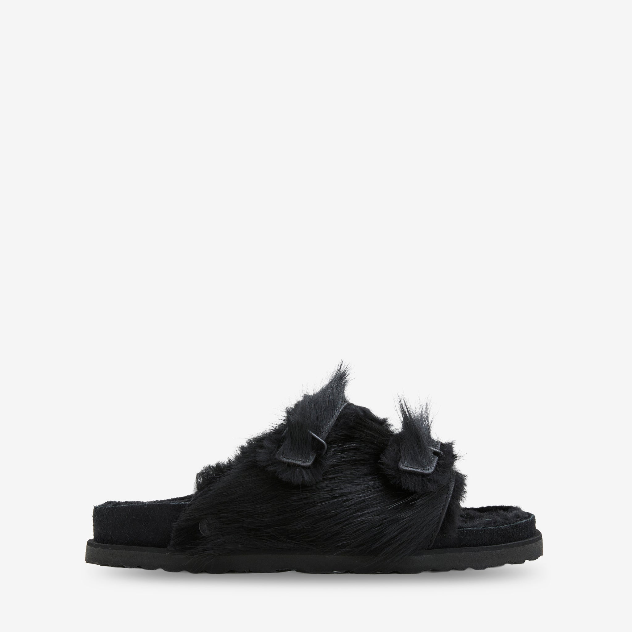 Unisex Zürich 1774 Pony Shearling Regular in Black from Birkenstock 1774. Slip on design with cowhide leather upper featuring plush shearling lining. Adjustable tonal metal buckle at strap. Cork and rubber outsole. Signature Birkenstock moulded footbead with woven branded label.
