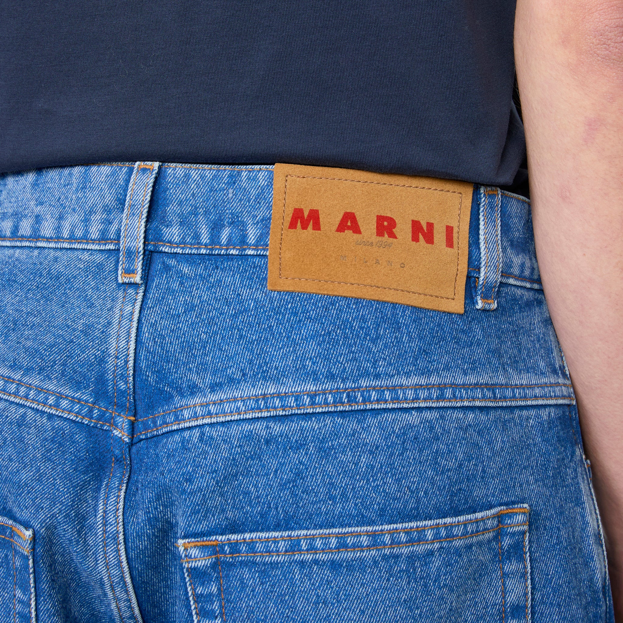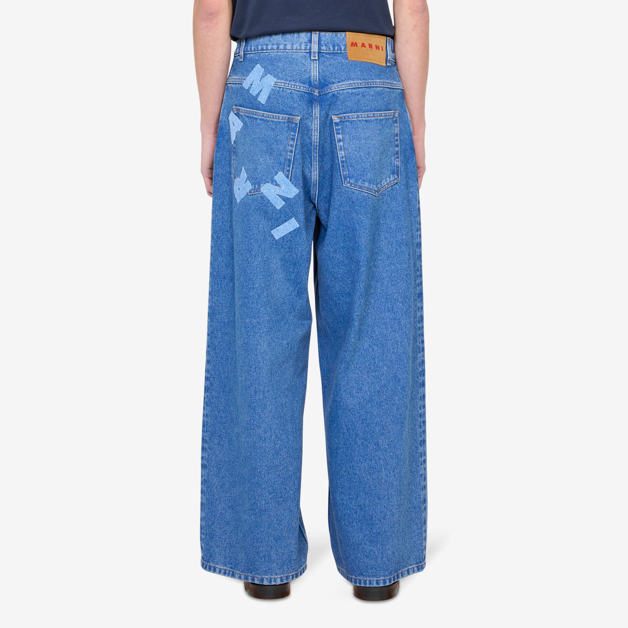 Applique Jeans in Ocean from Marni. Relaxed fit jeans in a wide-leg silhouette with a belt loop waistband and 5-pocket construction. Crafted from premium denim with a branded leather jacron at the rear waistband. Finished with applique patchwork branding at the rear left pocket.