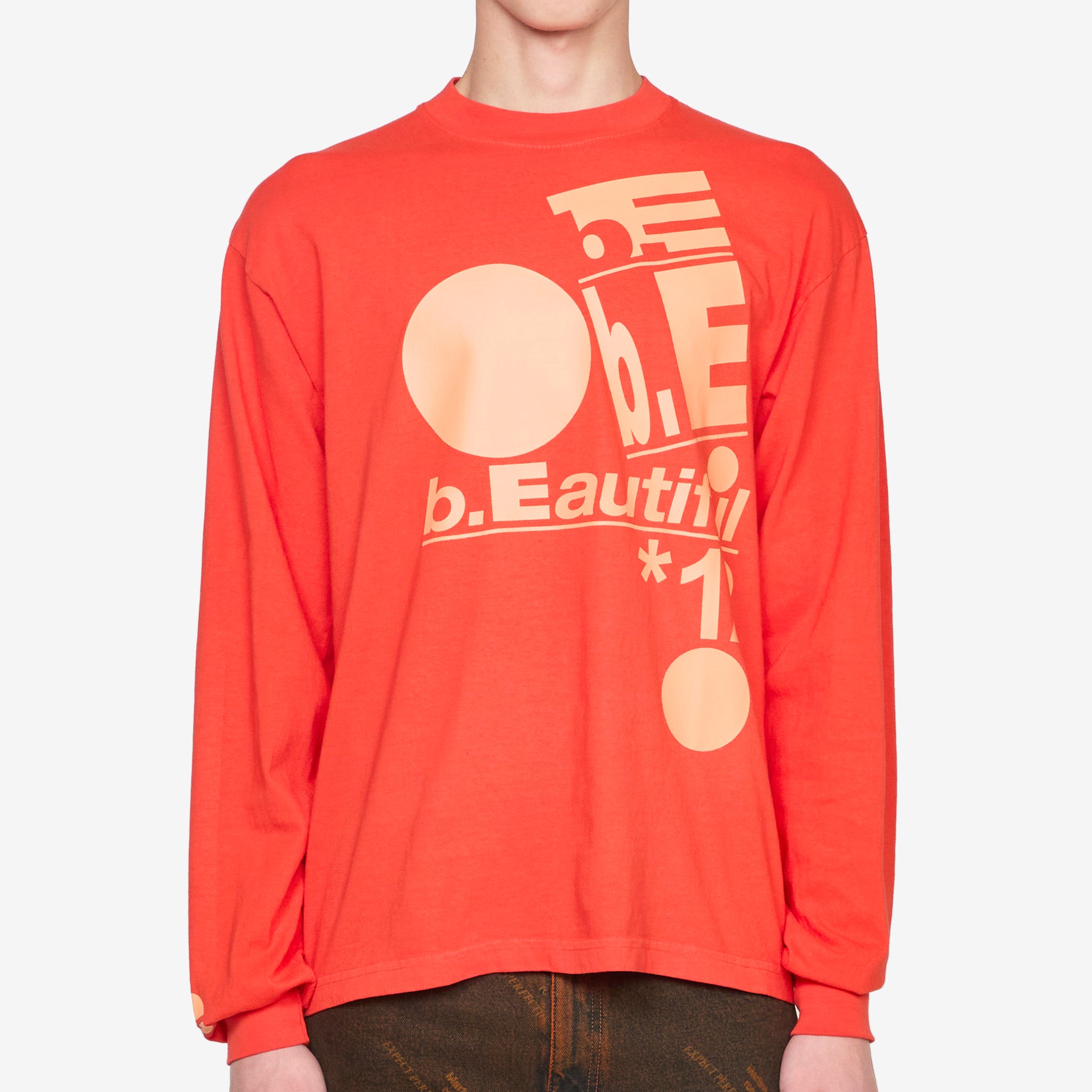 Balance Logo Longsleeve T-Shirt in Tomato from b.Eautiful. Regular fit longsleeve t-shirt with a ribbed crew neckline and cuffed sleeves. Crafted from a garment dyed 6.5oz cotton and finished with a printed graphic across the chest and sleeve.