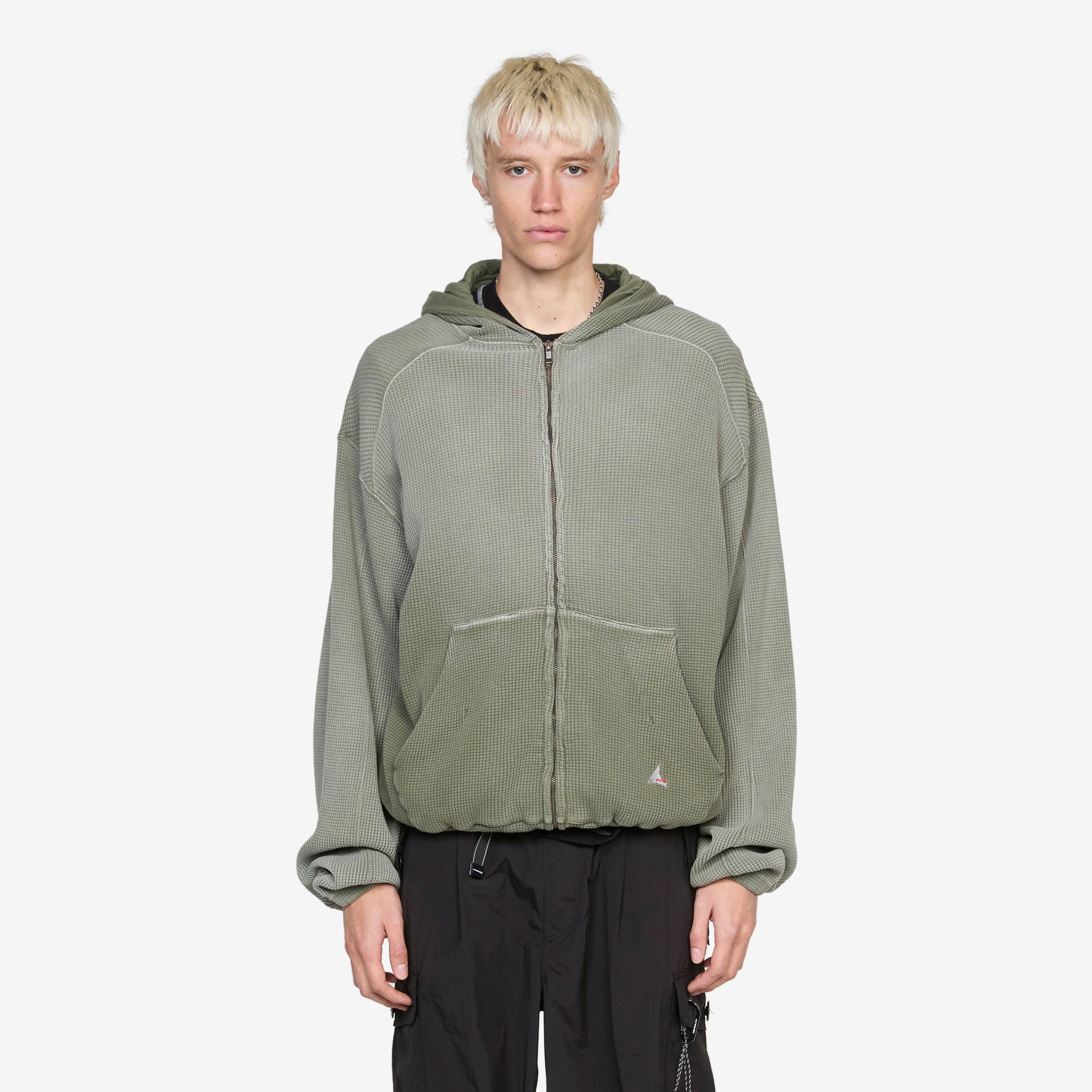 Bee Sun Faded Waffle Zip Up Hoodie in Olive from ROA. Relaxed fit hoodie with full-zip closure, front kangaroo pockets and elasticated trims. Crafted from heavy waffle cotton jersey in a sun faded finish. Completed with branded embroidery at the front pocket.