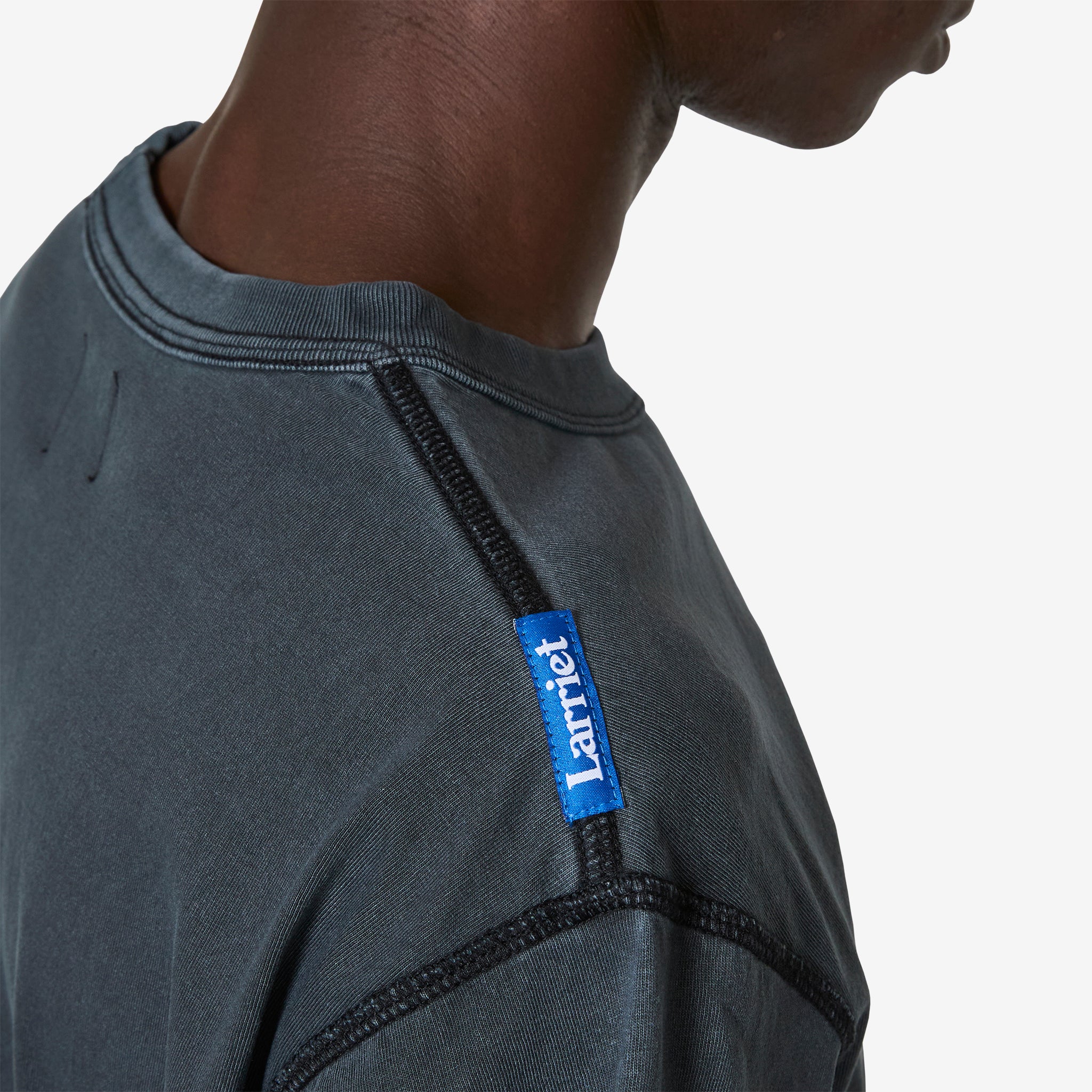 Blind T-Shirt in Used Black from Larriet. Relaxed fit t-shirt with a ribbed crew neckline and inside out construction with exposed seams. Crafted from a cotton jersey which has been pre-shrunk to maintain it's shape. Finished with a woven brand label on the right shoulder seam.