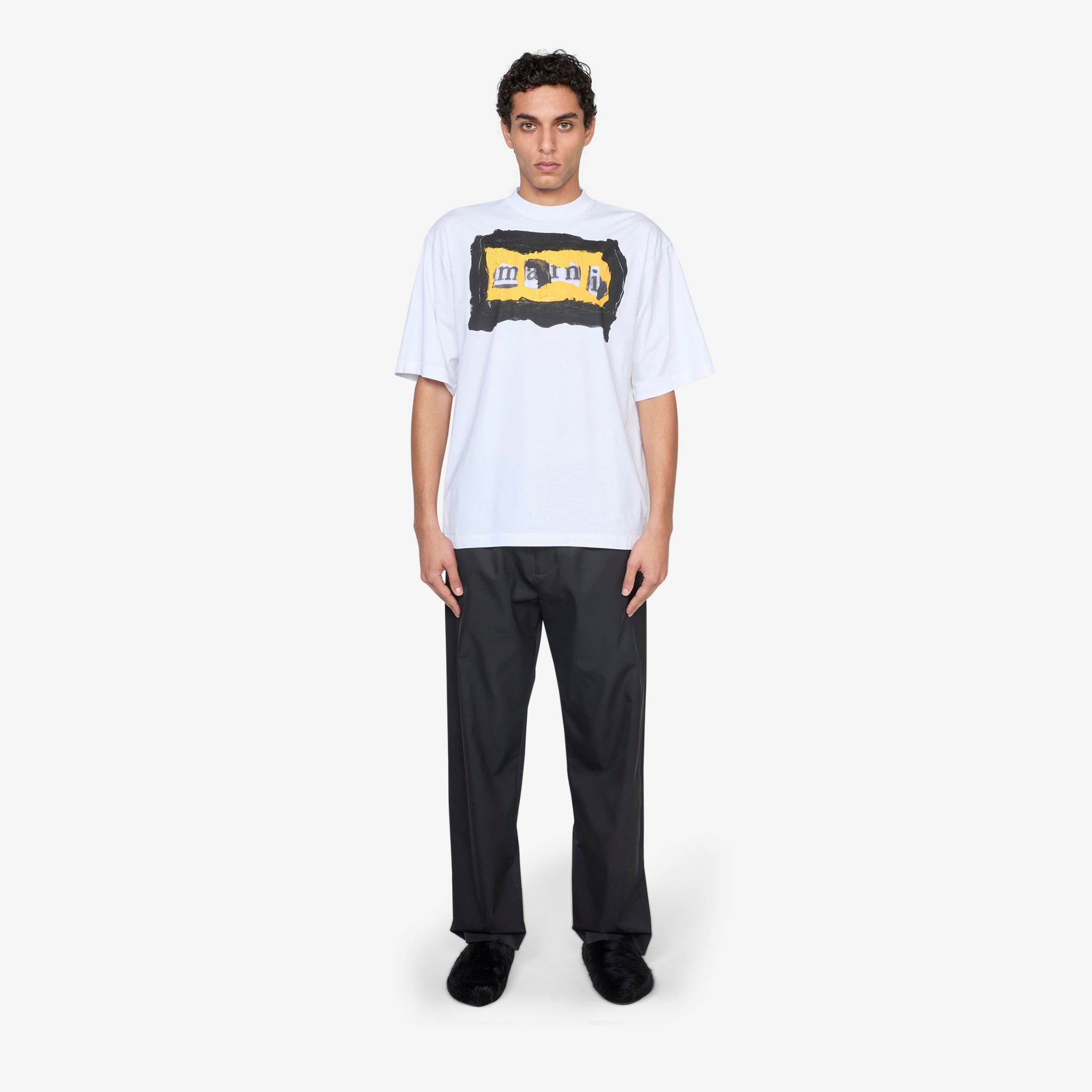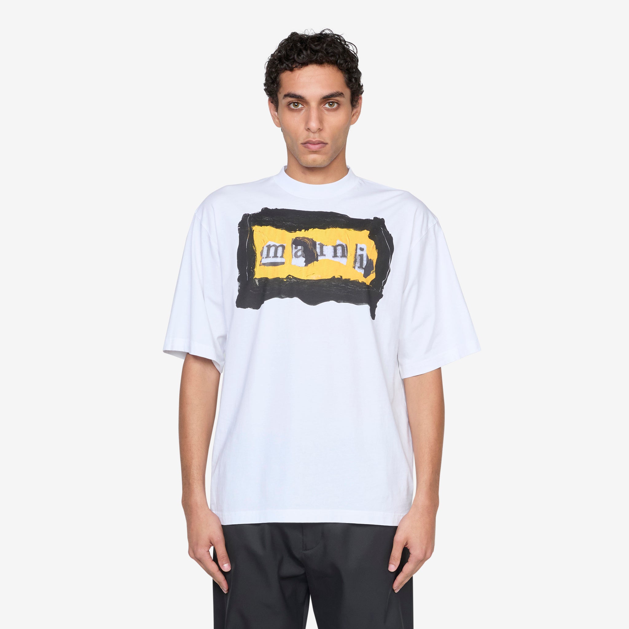 Collage Logo T-Shirt in Lily White from Marni. Cut from soft cotton jersey in Lily White, the tee features a deconstructed collage-style logo across the chest. Finished with ribbed neck trim and made in Italy