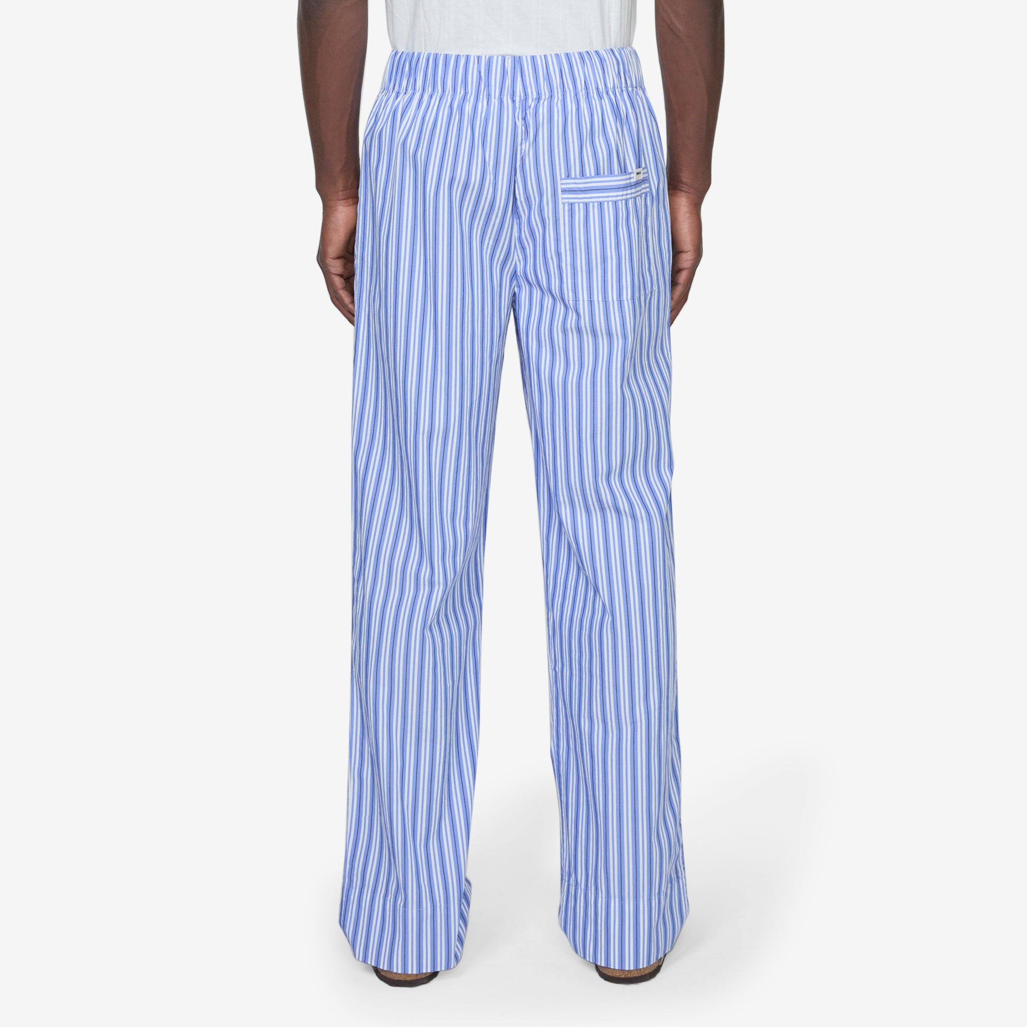 Unisex Cotton Poplin Pyjama Pant in Penny Stripes from Tekla. Oversized, straight leg fit pyjama pant with a drawstring waistband, button fly and inseam pockets. Crafted from tightly woven cotton poplin which has been stone-washed for a smooth and soft hand feel. Features french seams for a clean finish and the use of extra-long yarns to prevent pilling and guarantee a deep, pure colour.