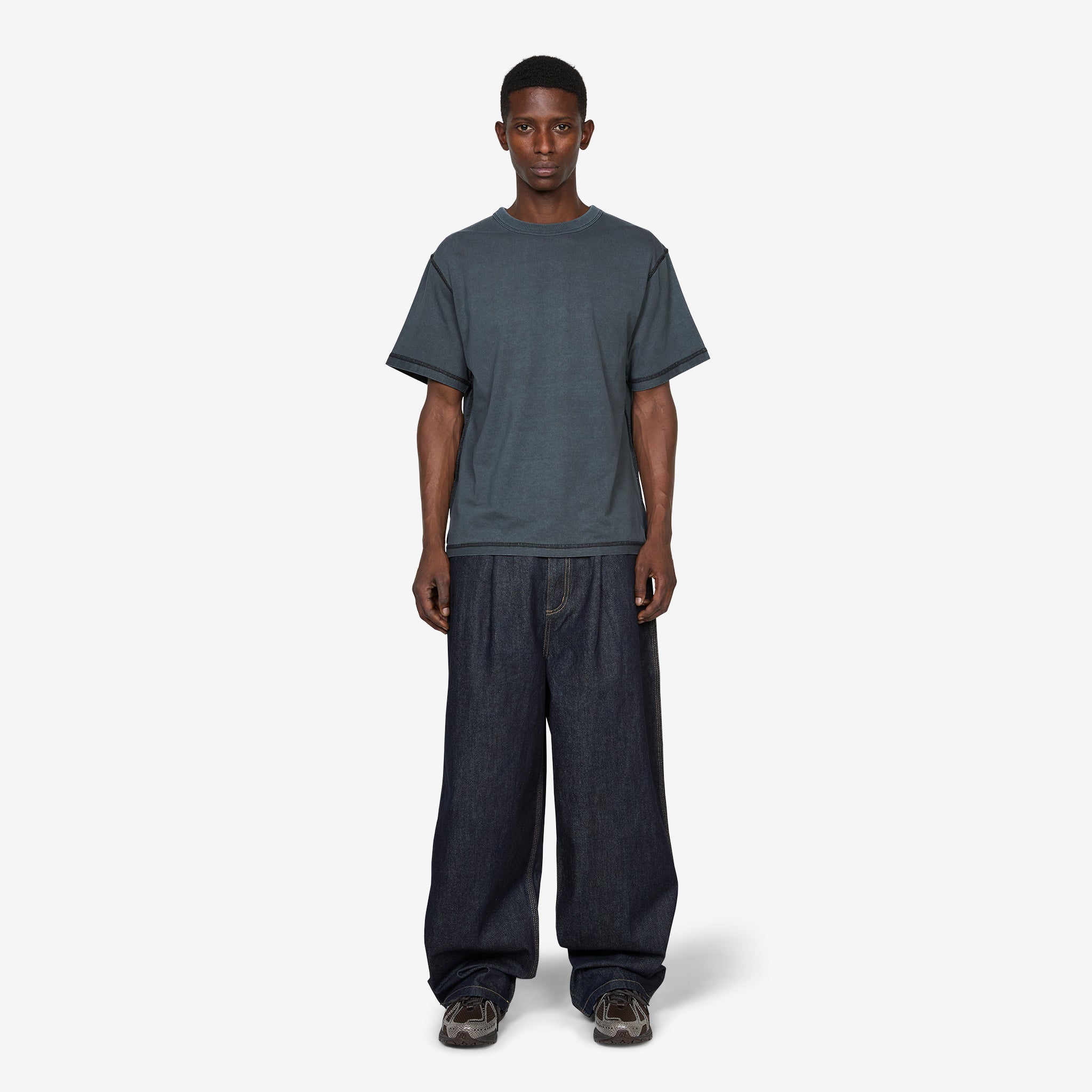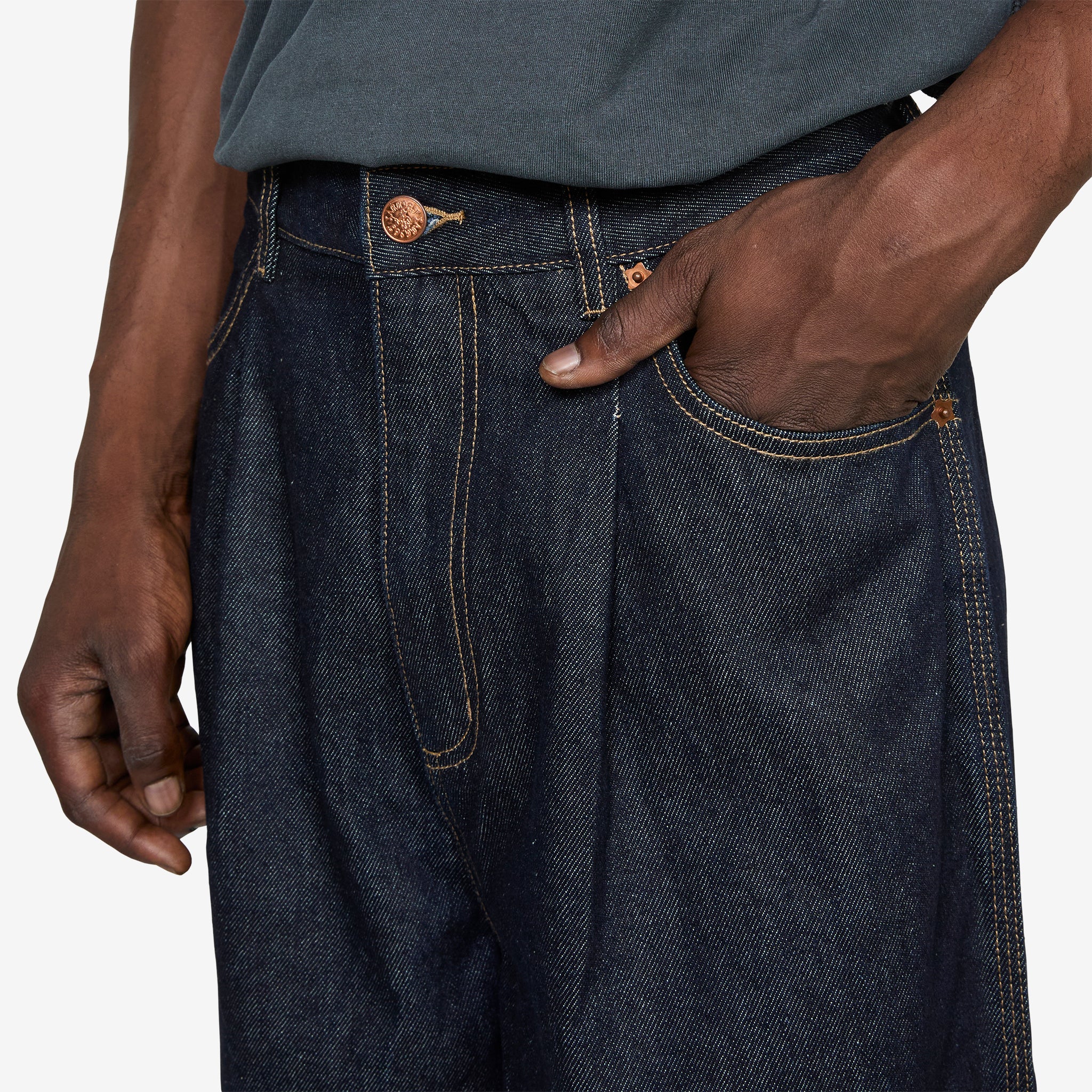 Frederick Pant in Indigo Denim from Larriet. Wide fit pants with a reinforced belt loop waistband, front rounded pockets, rear welt pockets and pleating at the front waist inner knee. Crafted from a cotton indigo denim with contrast tobacco stitching and triple-stitched leg seams for enhanced durability. Finished with metal star rivet detailing and a subtle woven brand label at the rear pocket.
