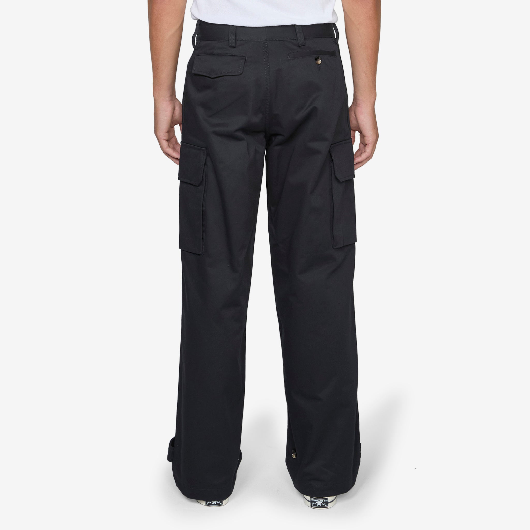 Gabardine Cargo Trousers in Black from Marni. Relaxed fit trousers with a belt loop waistband, zip and horn button closure, side welt pockets, flap and button closure pockets at the rear and cargo-style patch pockets at the thigh. Crafted from an organic cotton gabardine and finished with adjustable button-closure straps at the ankle.