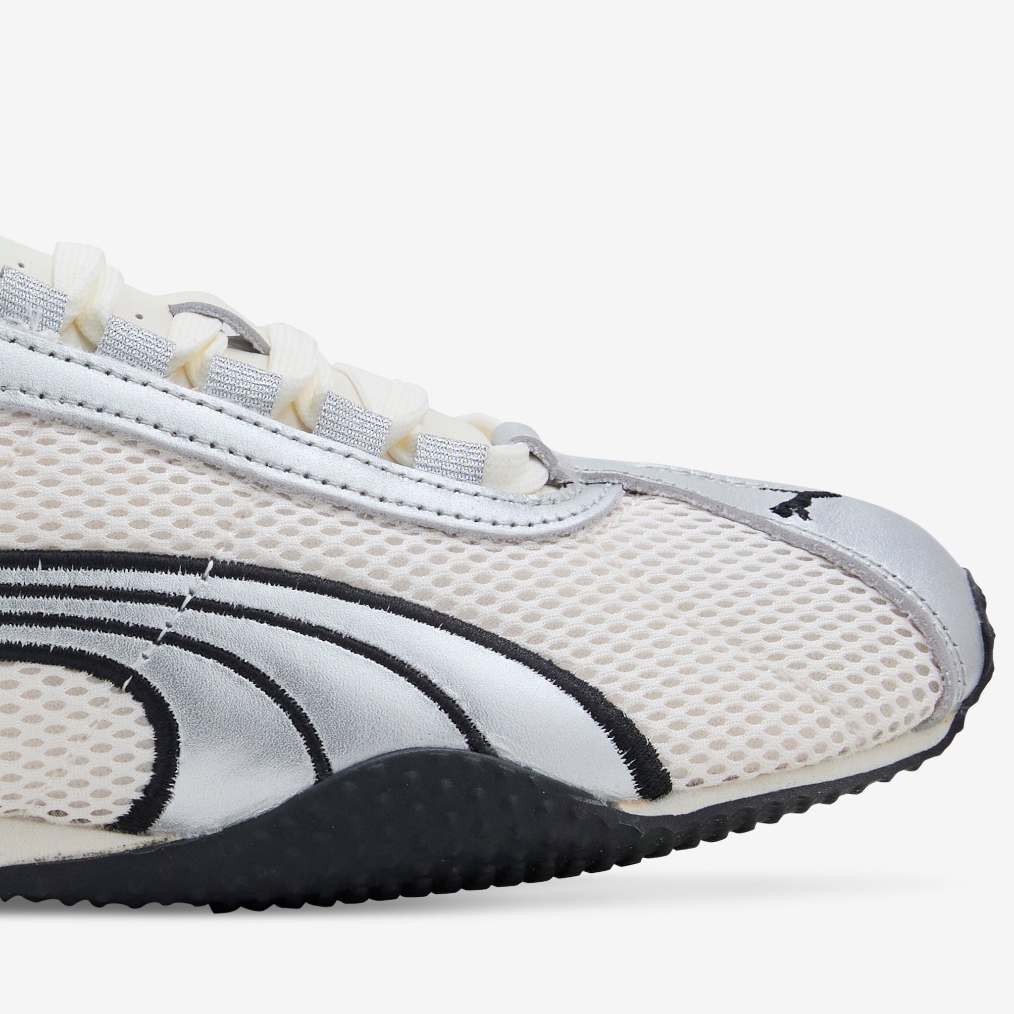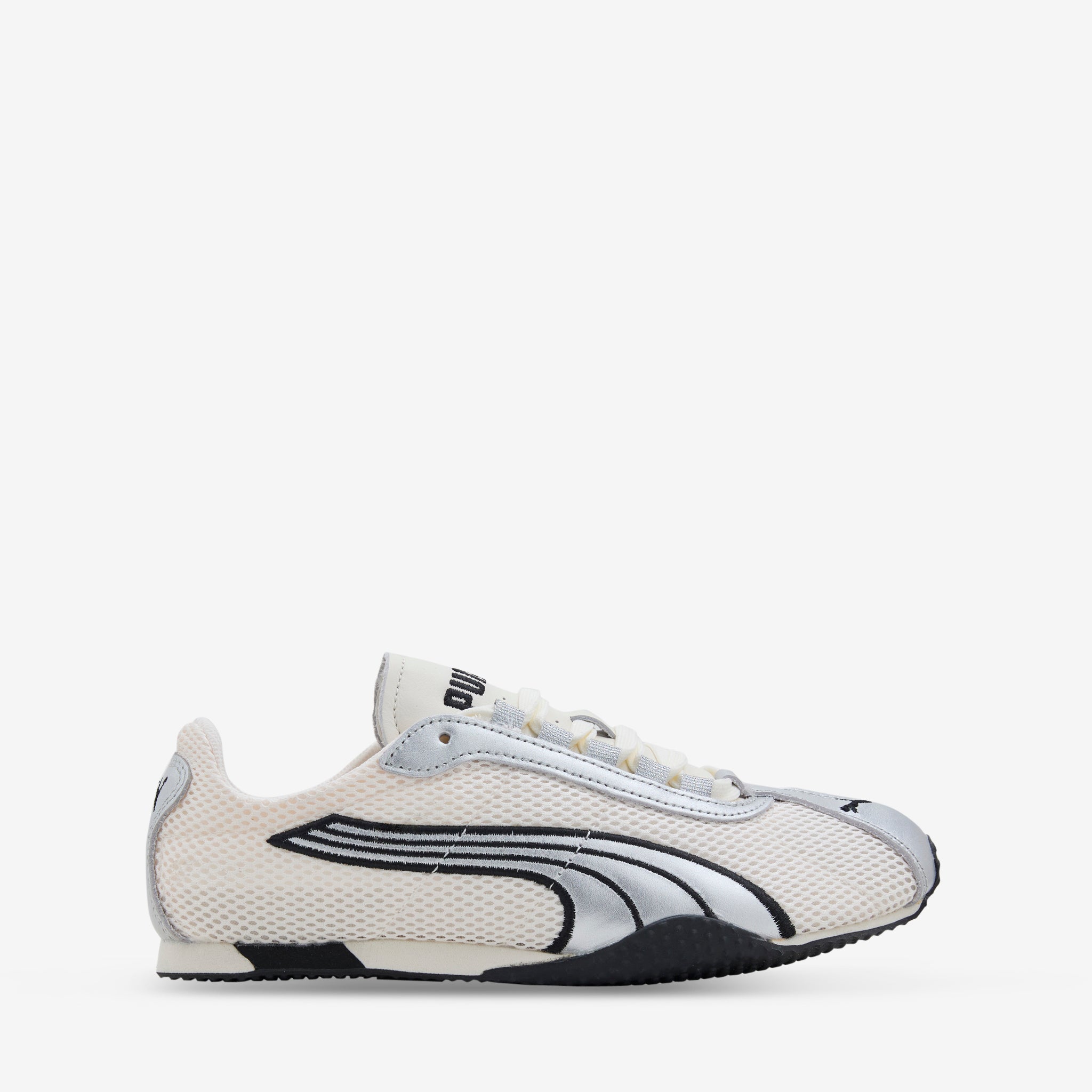 Unisex H-Street OG in Frosted Ivory and PUMA Silver from Puma. Inspired by the 2000s Puma Harambe running spike, the H-Street OG fuses sprinting heritage with street DNA. Featuring a lightweight mesh upper with metallic synthetic overlays and textile lining. Cushioned EVA midsole provides all-day support while the moulded footbed and rubbed outsole offer durable stability. Finished with embroidered branding throughout.