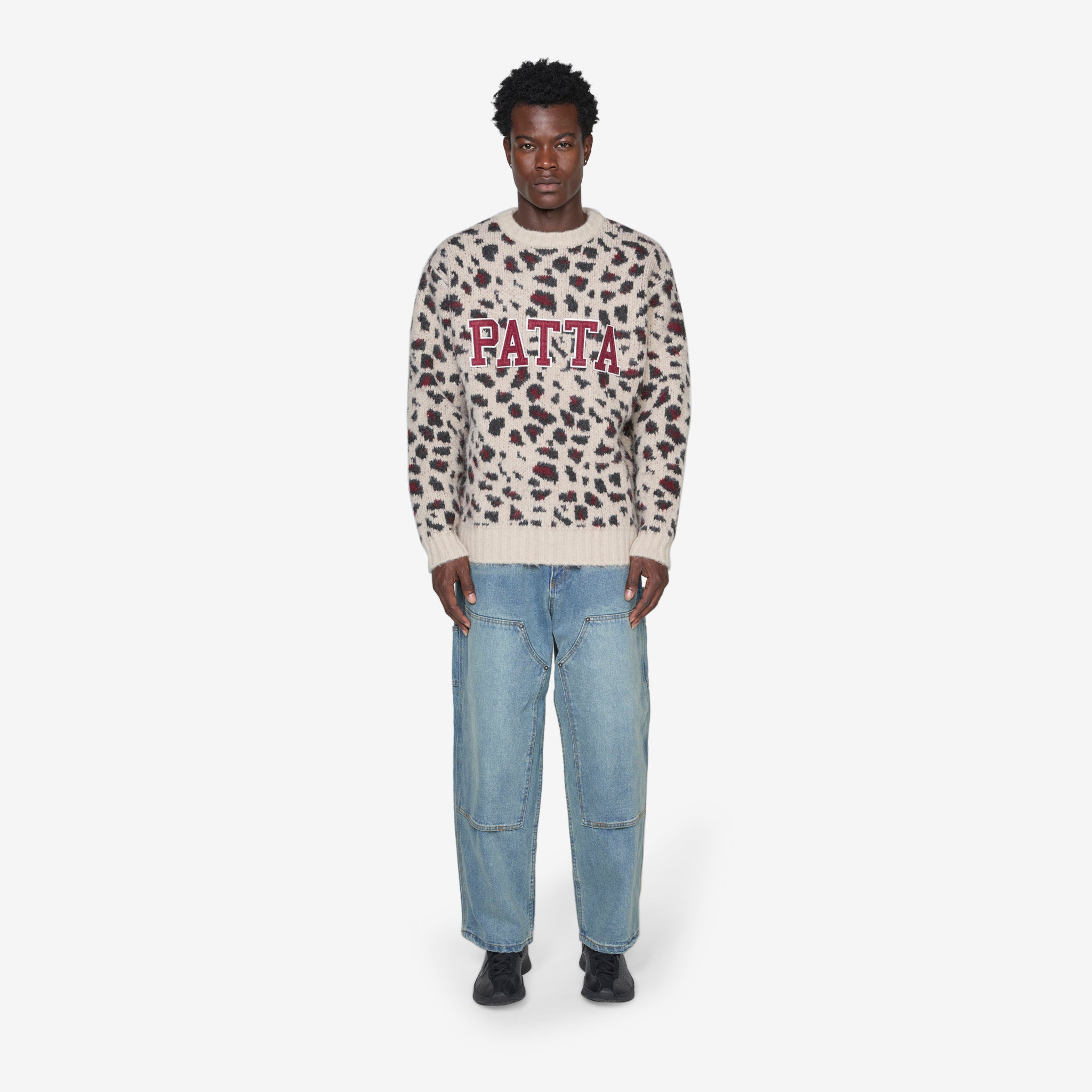 Leopard Brushed Knitted Sweater in Multi from Patta. Relaxed fit hooded pullover knitted sweater, with a jacquard leopard print, ribbed trims and centered applique branding. Crafted from 450gsm soft brushed back cotton blend fabric which has been acid-washed. Finished with screen-printed branding on the chest.