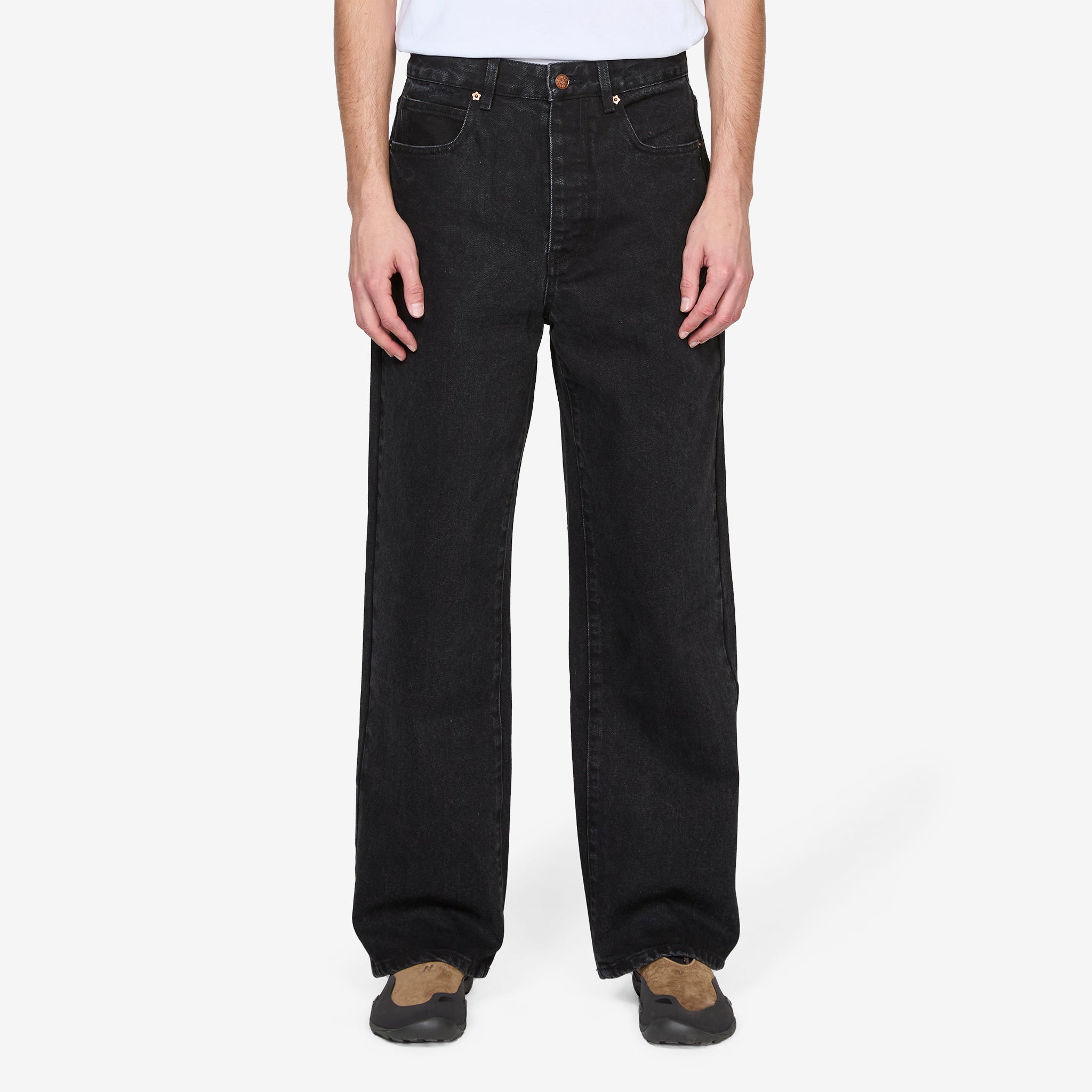 Walé Jeans in Used Black from Larriet. Wide fit jeans with a button fly and Larriet shanks for secure closure and classic 5-pocket construction. Crafted from heavyweight, enzyme-washed 12.5oz denim. Finished with cowboy hat embroidery on the rear pocket and a branded embroidered paper label on the waistband.