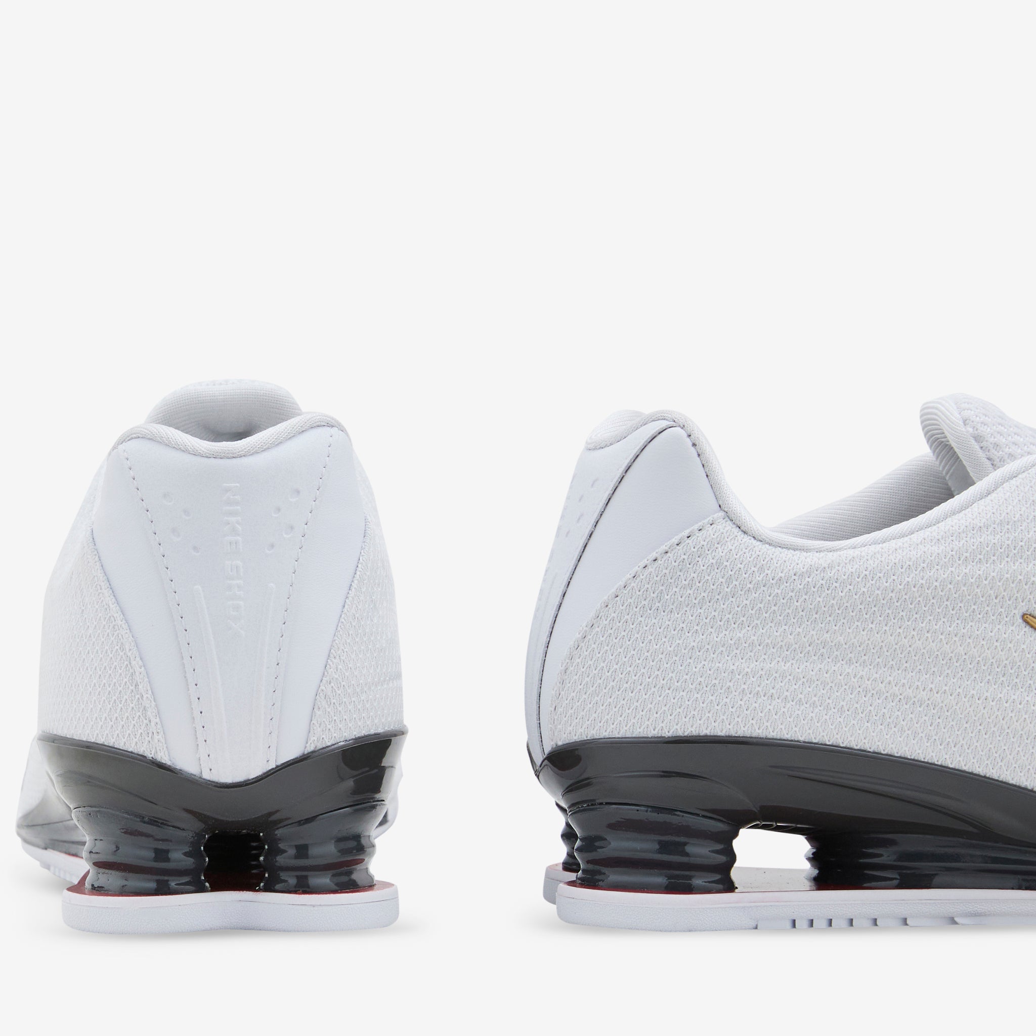 Women's Shox Z in White, Metallic Gold and Varsity Red from Nike. Low-profile take on the Shox silhouette featuring a breathable textile upper with synthetic leather accents and shiny finishes. Foam midsole and Nike Shox columns provide resilient cushioning. Finished with a modified, circular Waffle outsole for durable traction.