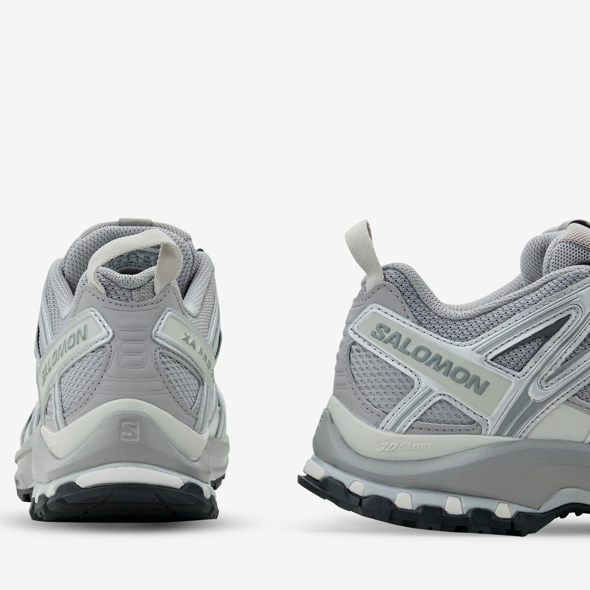 Men's XA Pro 3D in Alloy, Footwear Silver and Lunar Rock from Salomon. A tribute to one of Salomon's best-selling trail running shoes, this revamp features a 3D mesh upper with synthetic overlays and signature quickLACE™ closure.  Molded OrthoLite® sockliner and sensiFIT™ cage create a secure foothold while the 3D Advanced Chassis™ offers maximum stability. Finished with an All Terrain Contagrip® outsole for traction across wet and dry surfaces.