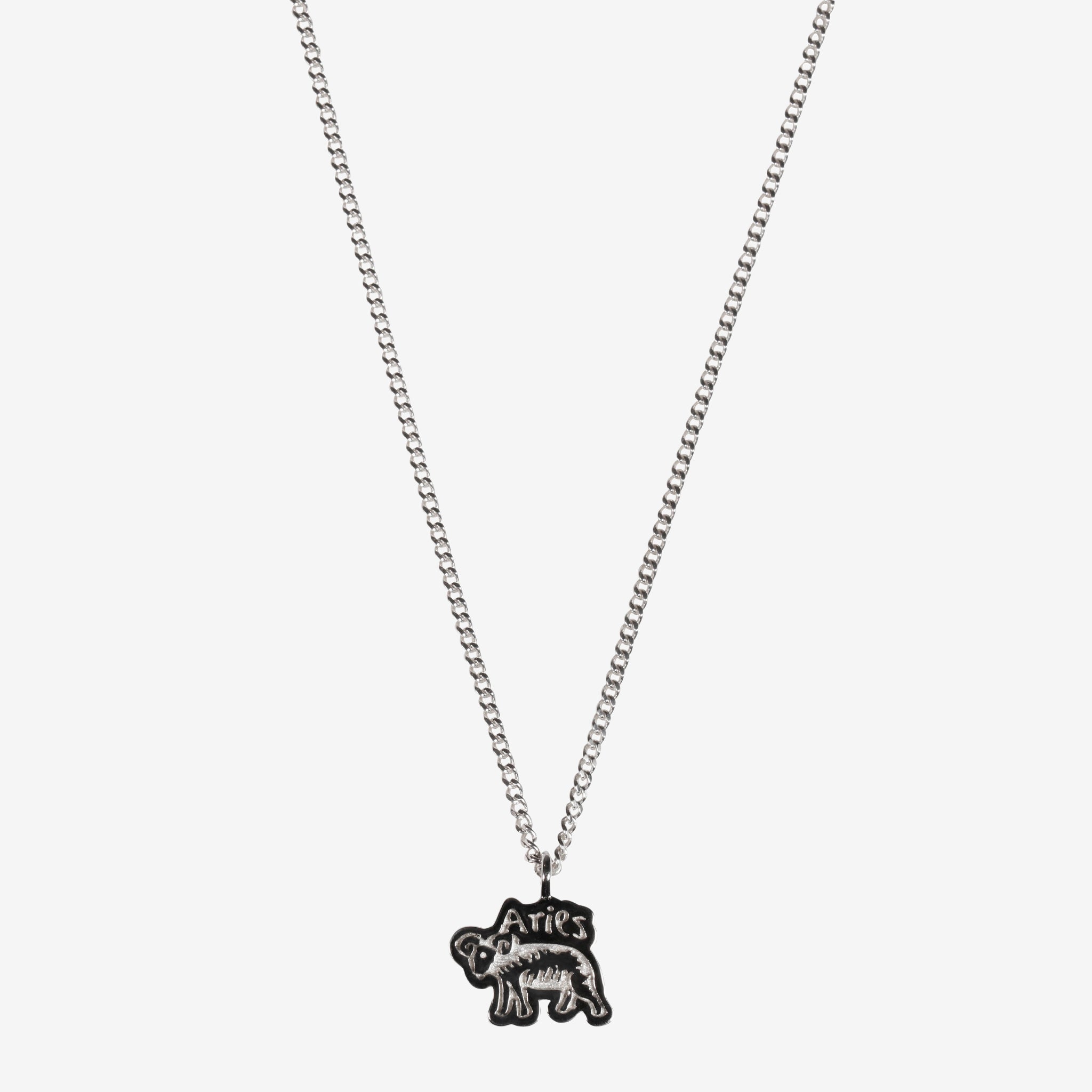 Aries Pendant in Silver from Cameron Studio. Fine, diamond cut curb chain necklace featuring a debossed zodiac design pendant. Crafted from solid 925 silver in a hand-filed and polished high-shine finish. Finished with engraved 925 hallmarks and branding at the back of the pendant. Accompanied by a Cameron Studio Tyvek pouch, polish cloth & care card.