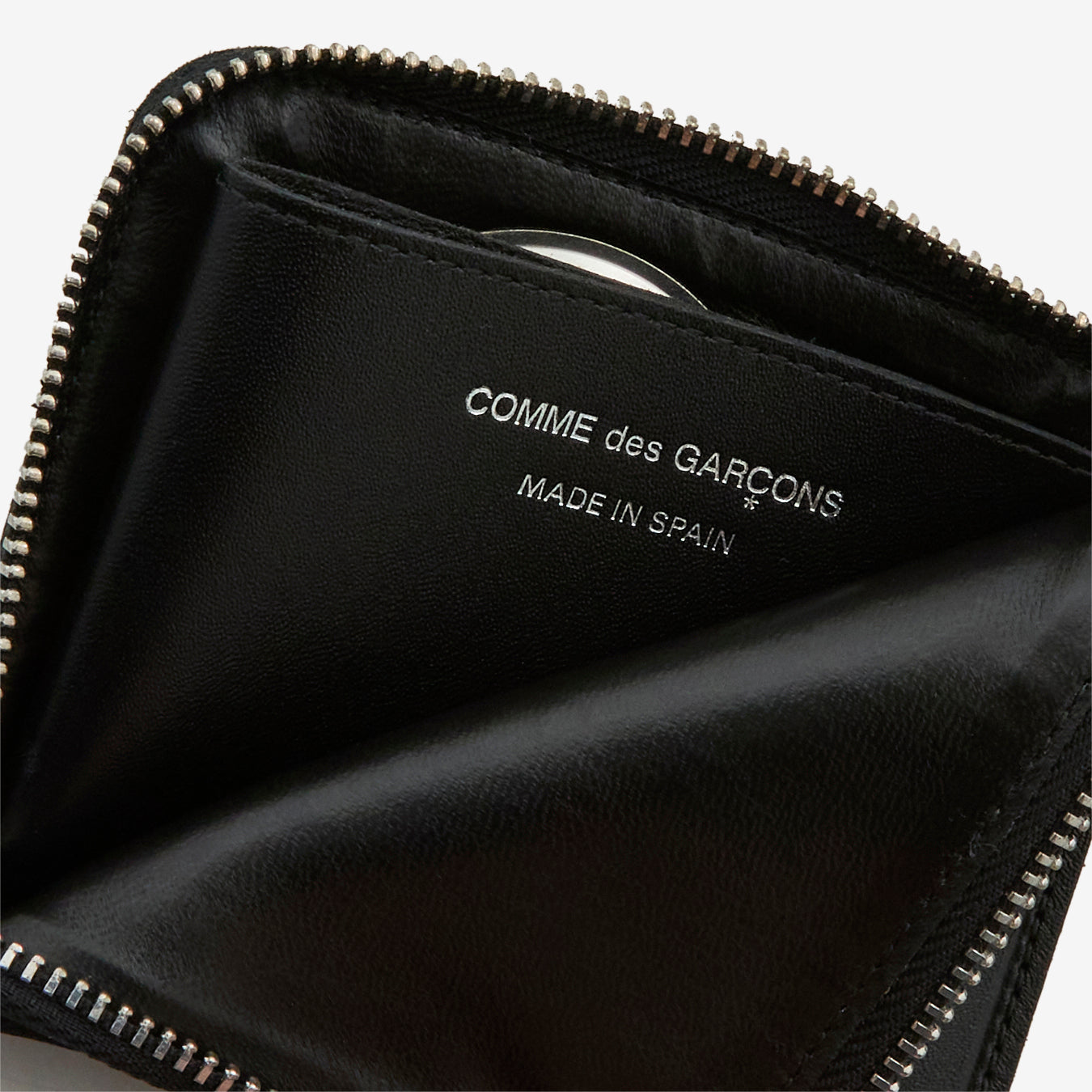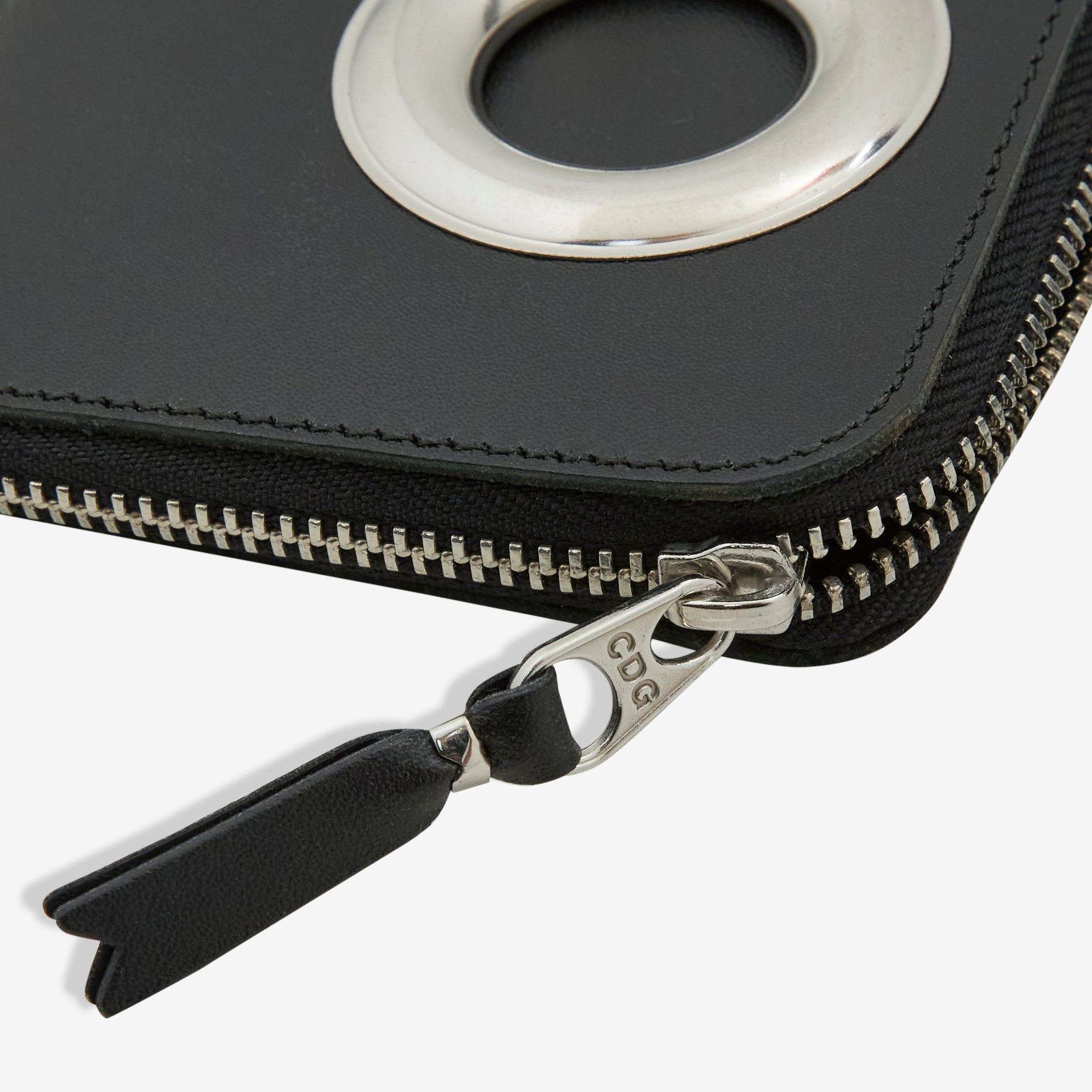 SA3100SE Silver Eyelet Wallet in Black from COMME des GARÇONS WALLET. Compact corner zip wallet with an internal coin pouch for easy organisation. Crafted from smooth bovine leather. Finished with a large eyelet on the exterior, silver hardware and silver foil Comme des Garçons branding on the interior.
