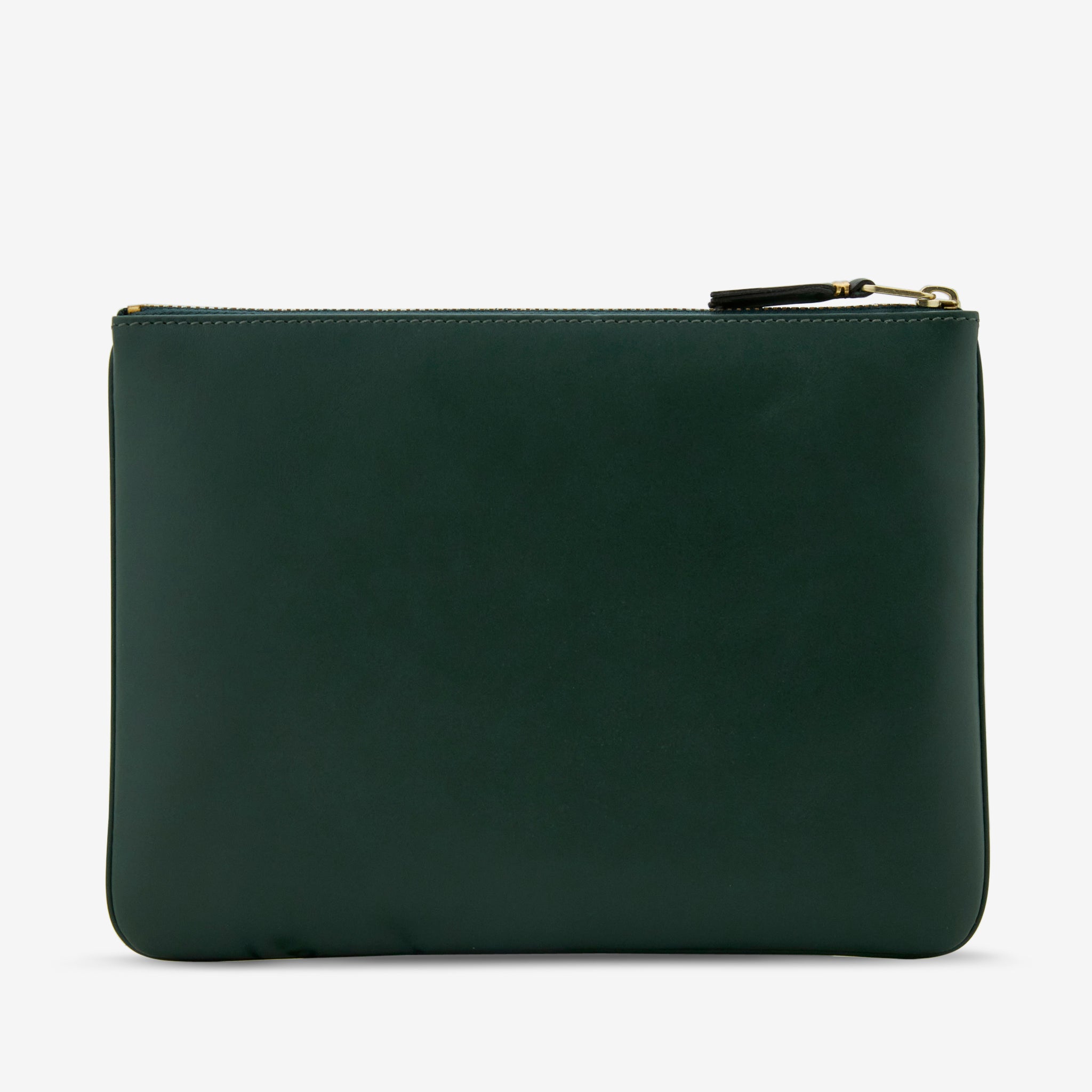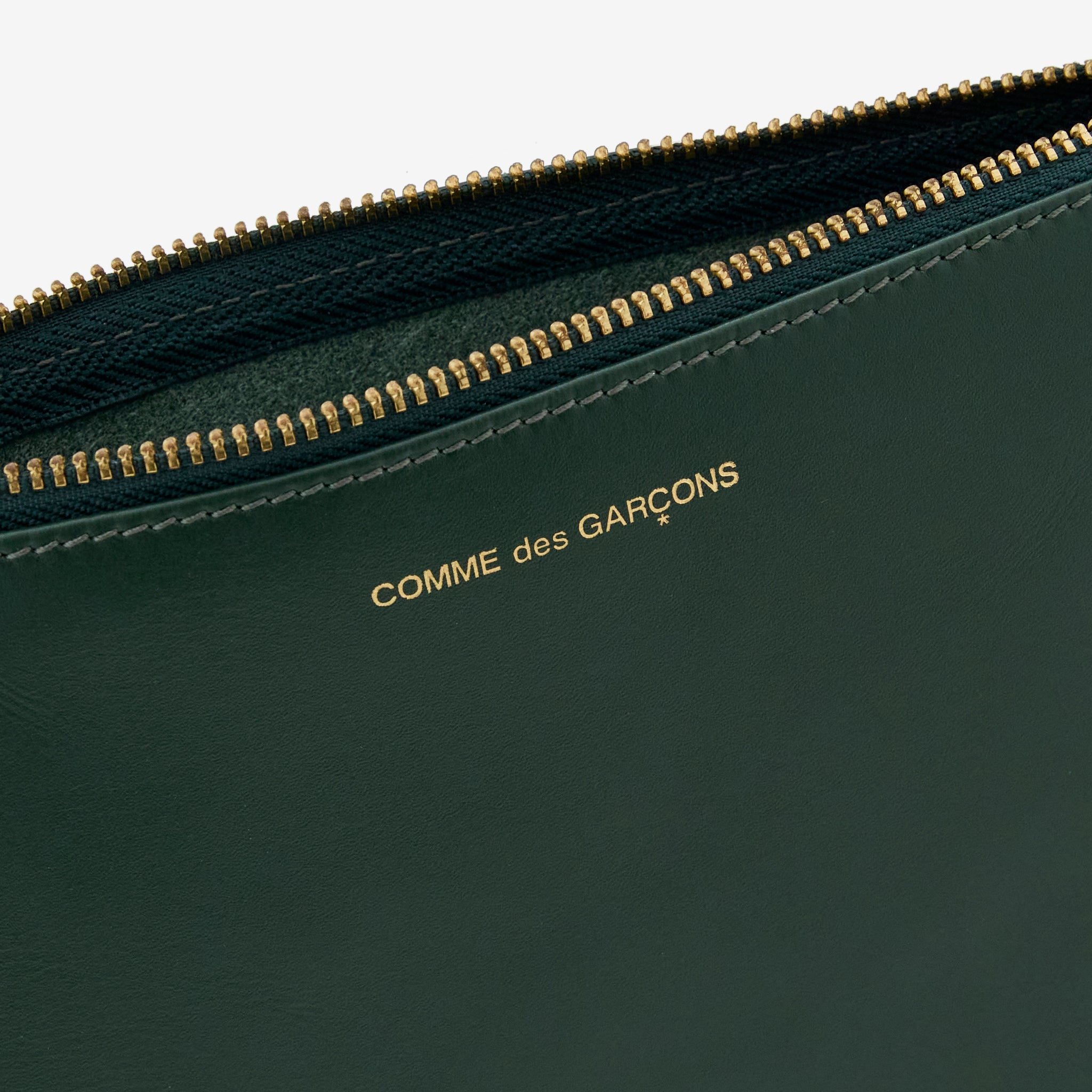 SA5100 Classic Line Wallet in Bottle Green from COMME des GARÇONS WALLET. Large-size pouch wallet with zip closure at the top. Crafted from smooth bovine leather. Finished with gold hardware and gold foil Comme des Garçons branding on the exterior.