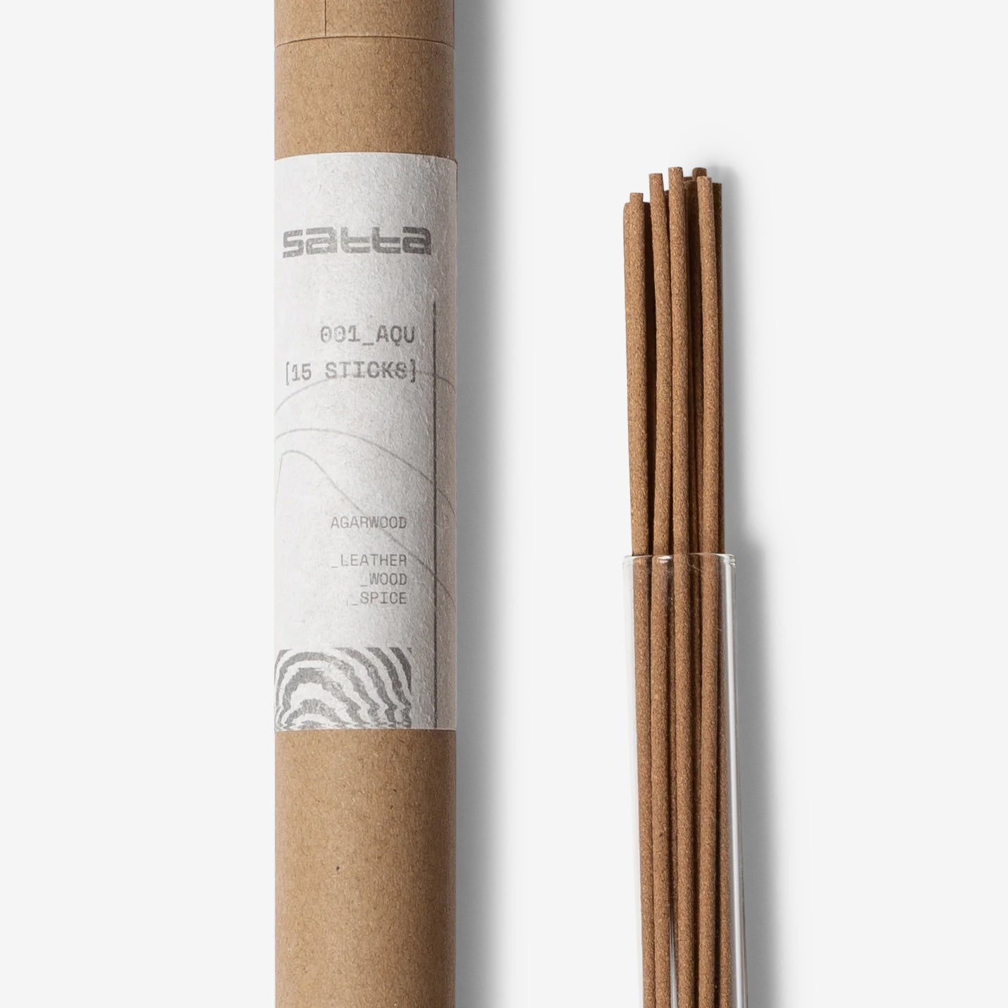 Incense 001_AQU from Satta. Cambodian Agarwood reedless Incense sticks, with fragrance notes of leather, wood & spice. Made from 100% natural plants, herbs and spices.