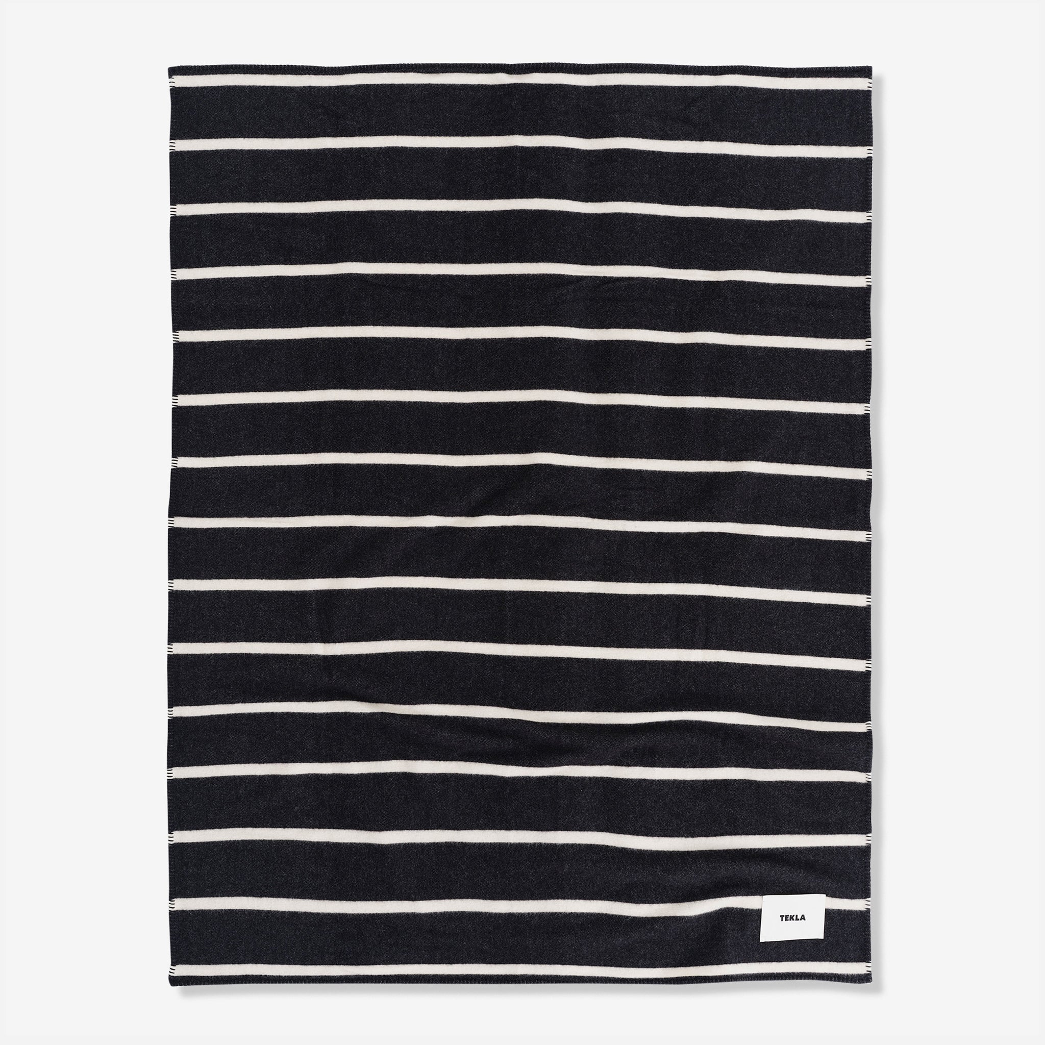 Lambswool Blanket in Starling Stripes from Tekla. Designed to perfectly balance lightness and durability. Crafted from a blend of lightly brushed responsibly sourced blend of virgin and recycled lambswool. Finished with a cotton whipstitched edge and woven brand label.