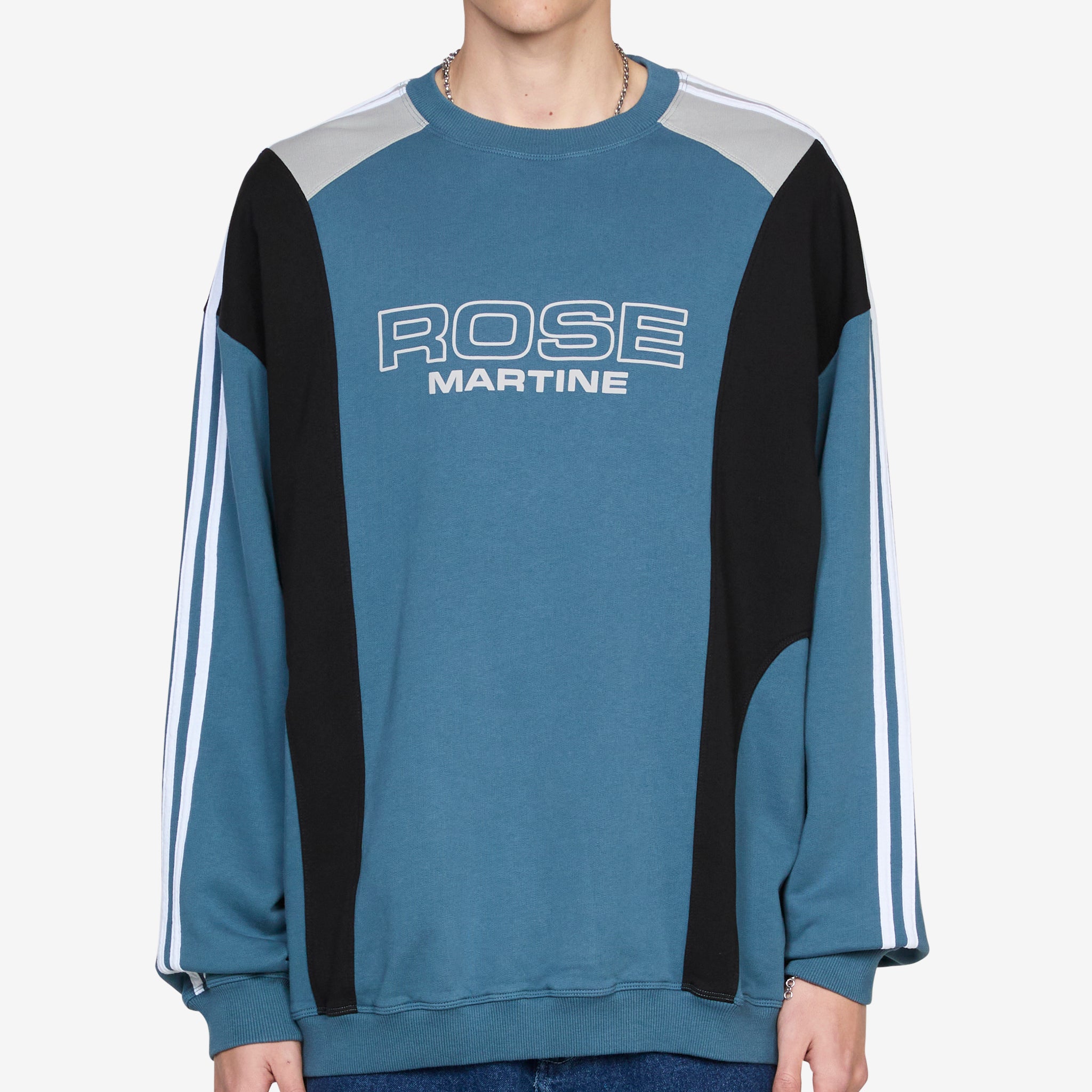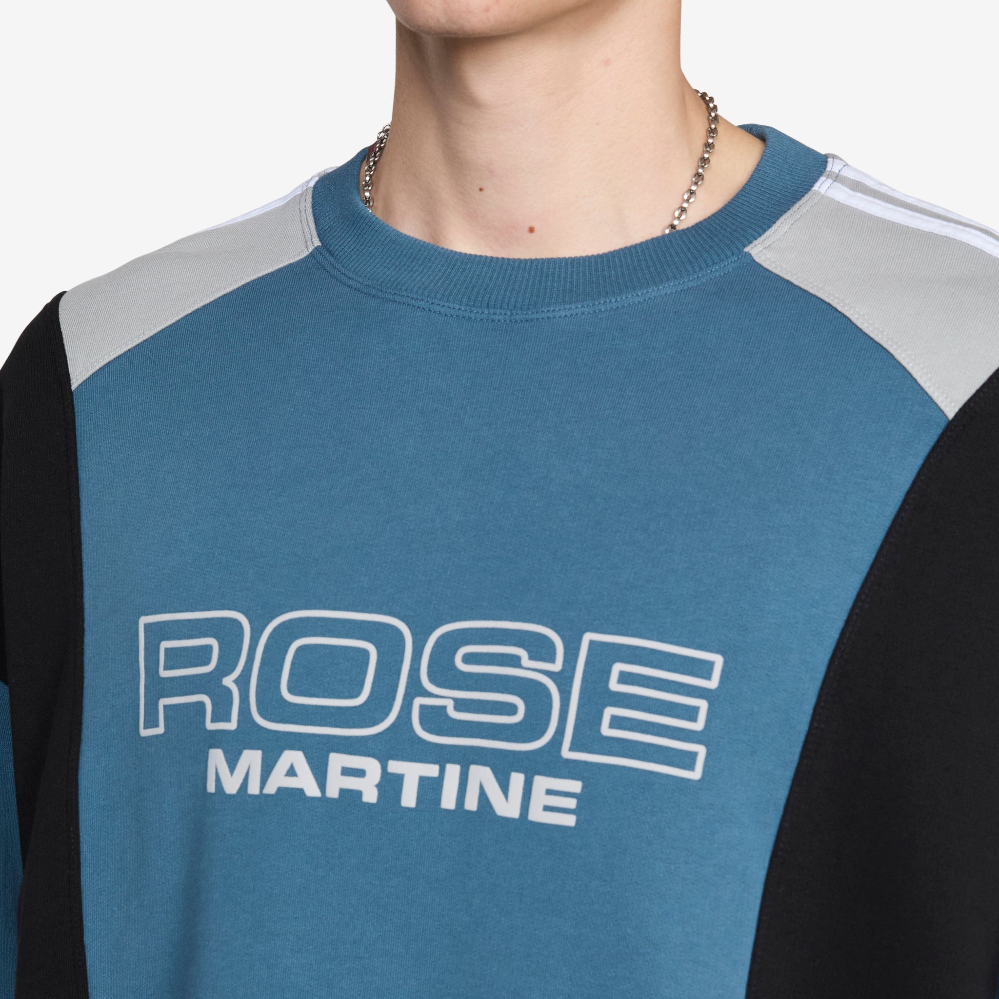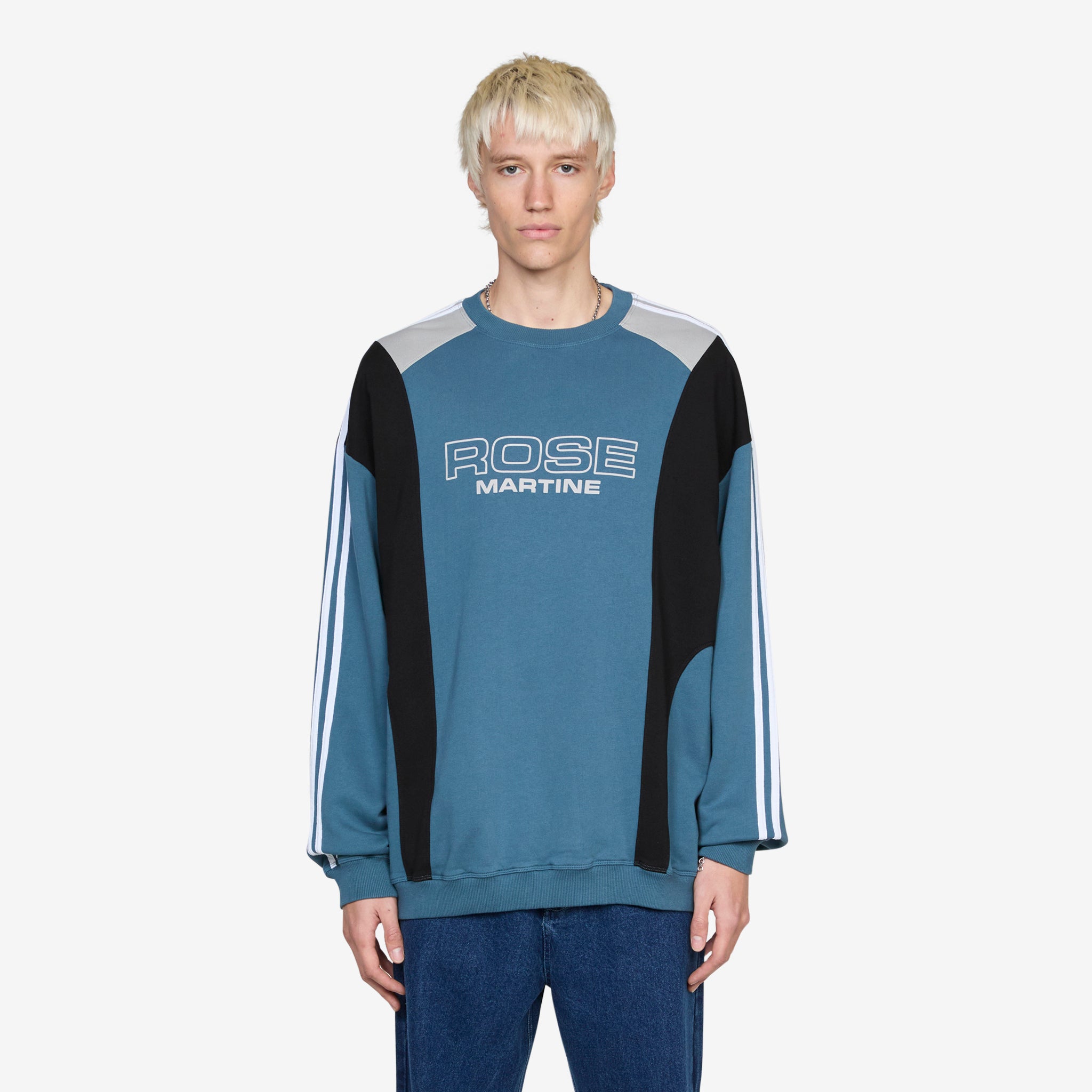 Panelled Sweatshirt in Agean Blue from Martine Rose. Oversized fit sweatshirt with a crew neckline and ribbed trims. Crafted from premium cotton with panelled construction and stripe details at the sleeves. Finished with printed branding at the chest.