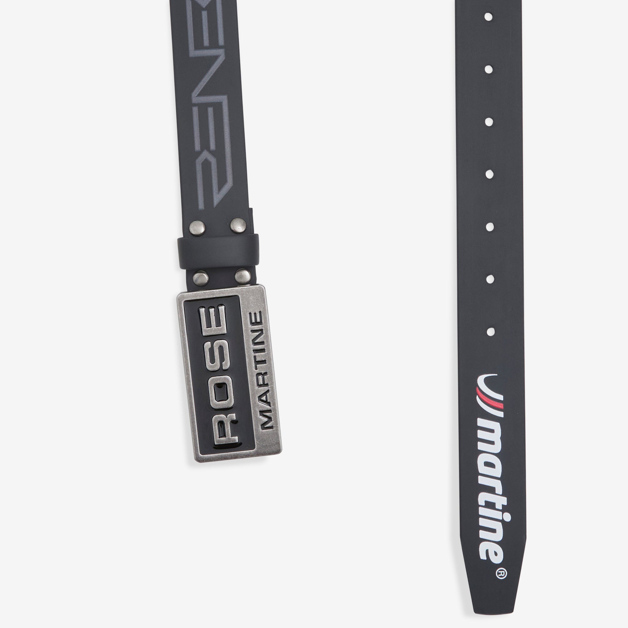Rubber Tyre Belt in Black from Martine Rose. Rubber belt with a branded silver alloy buckle. Crafted from durable rubber with tonal resin graphics and branding printed throughout.