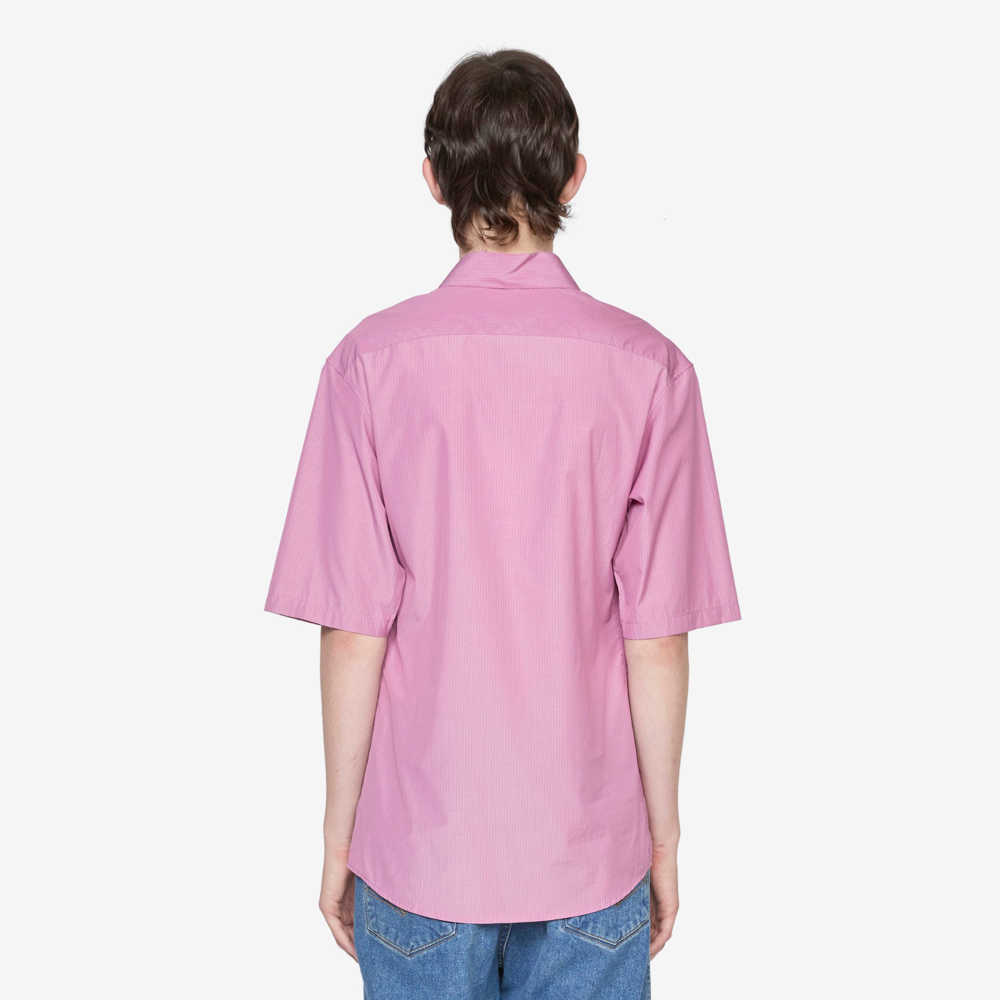 Shortsleeve Casual Shirt in Purple and Black Stripe from Martine Rose. Oversized fit shirt with a button-down classic collar, tonal full-button closure and slightly dropped shoulders. Crafted from a lightweight cotton in a subtle stripe. Finished with a woven brand label on the placket.