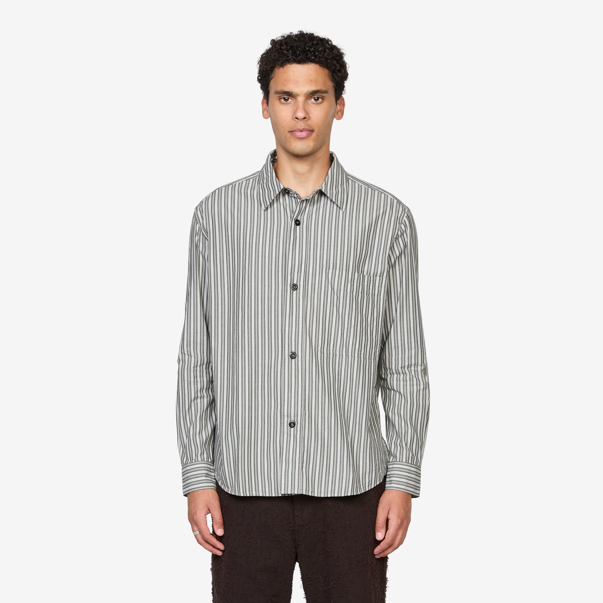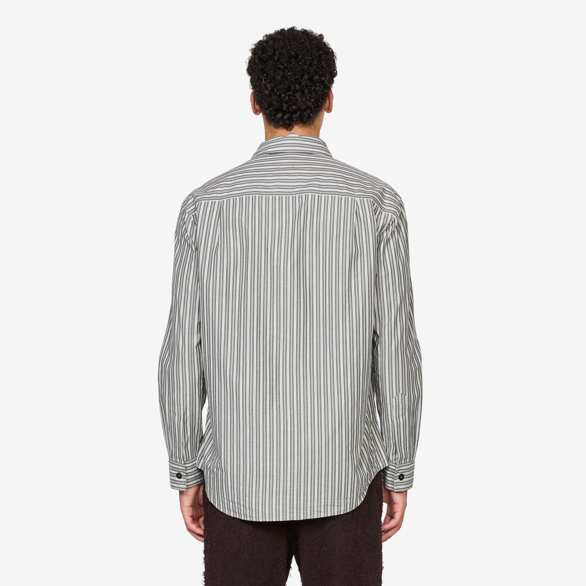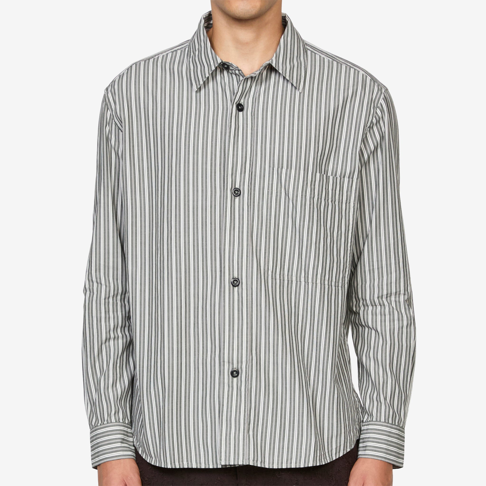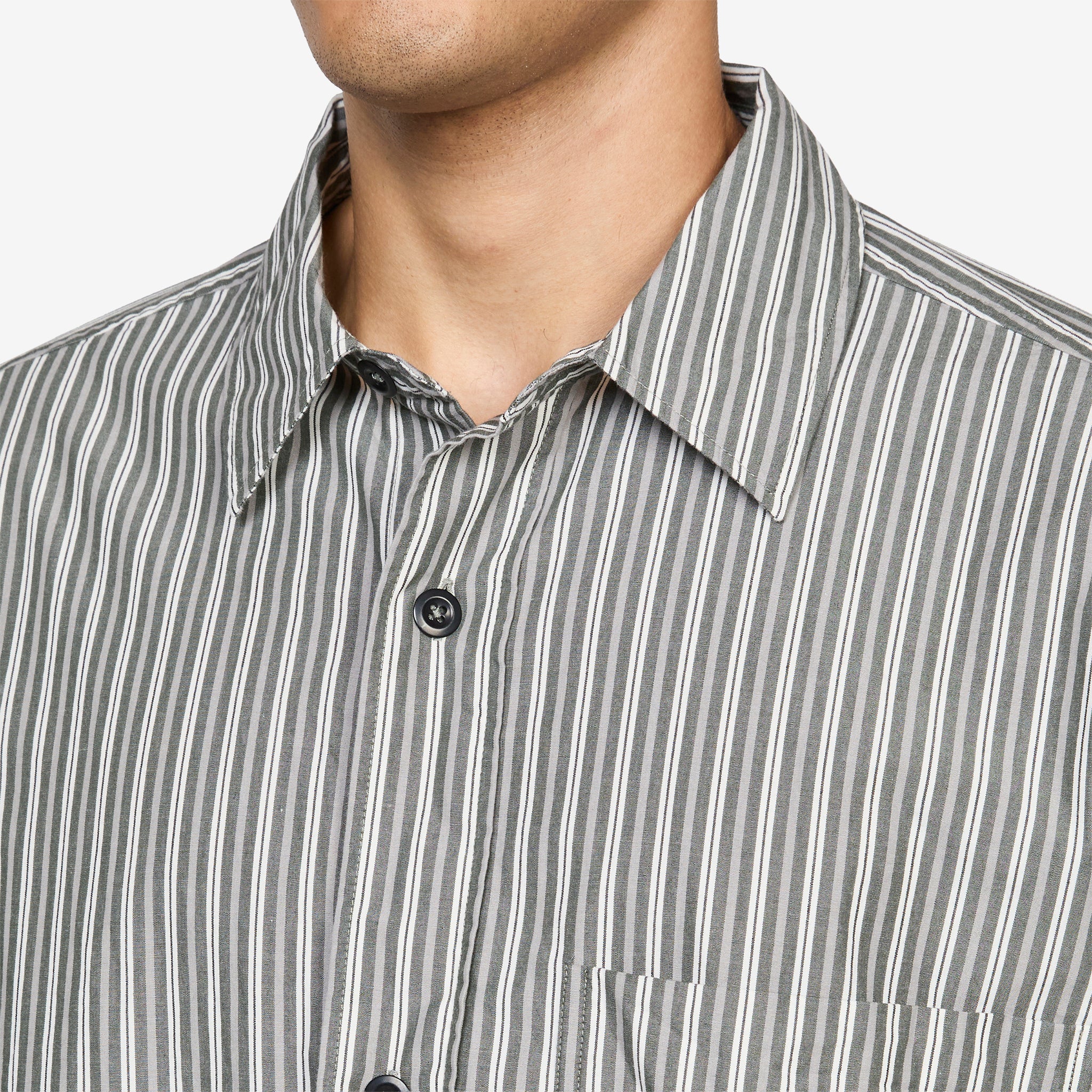 Basic Shirt in Forest, Grey and Off White from MHL. by Margaret Howell. Relaxed fit shirt with a classic collar, corozo brace buton closure and side gusset stitch detailing. Crafted from dense cotton plainweave in a two-tone stripe. Finished with a large chest pocket and pleated back yoke.