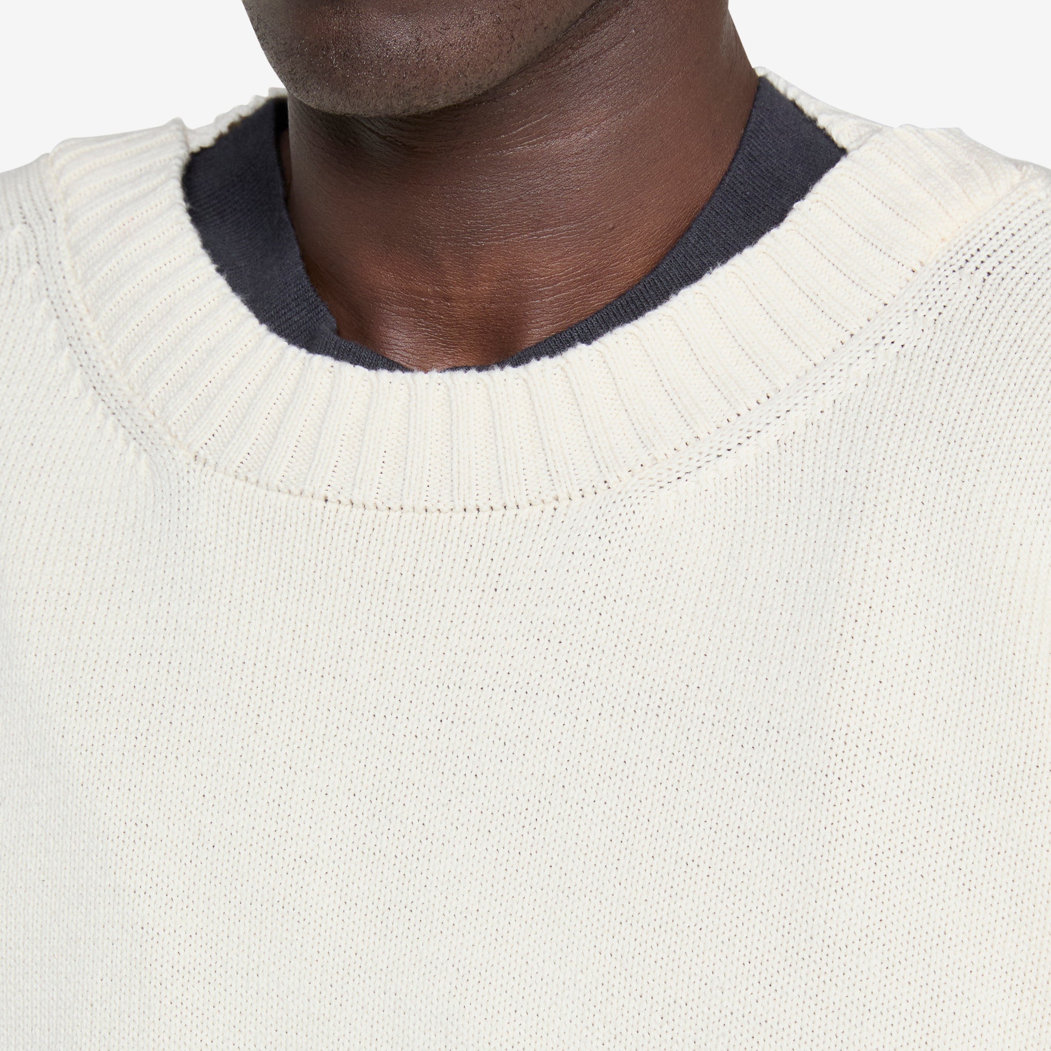 Cross Over Crew in Ecru from MHL. by Margaret Howell. Relaxed fit sweater with a crew neckline, dropped shoulders and thick-ribbed trims. Crafted from a dry Scottish cotton and finished with flatlock stitch seam detailing.