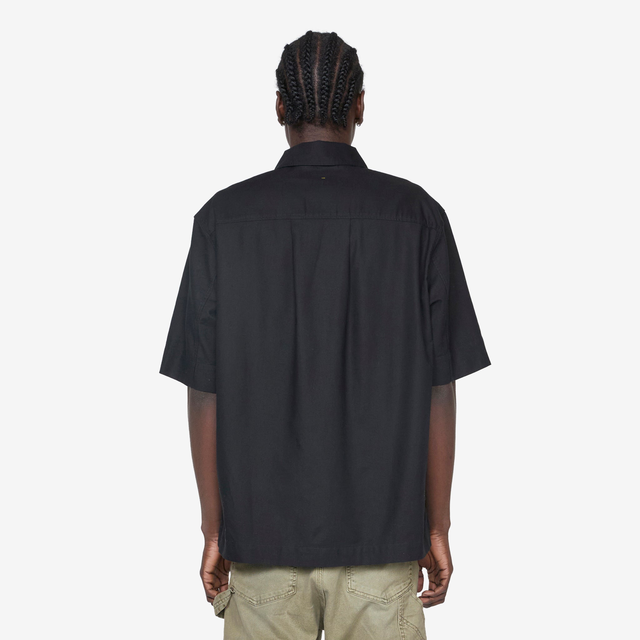 Half Zip Pull On Shirt in Black from MHL. by Margaret Howell. Relaxed fit shirt with a spread collar, herringbone detail zip-closure placket and side split hem. Crafted from Japanese panama weave cotton with an elongated back and box pleat on the back yoke. Finished with a large patch pocket at the chest.
