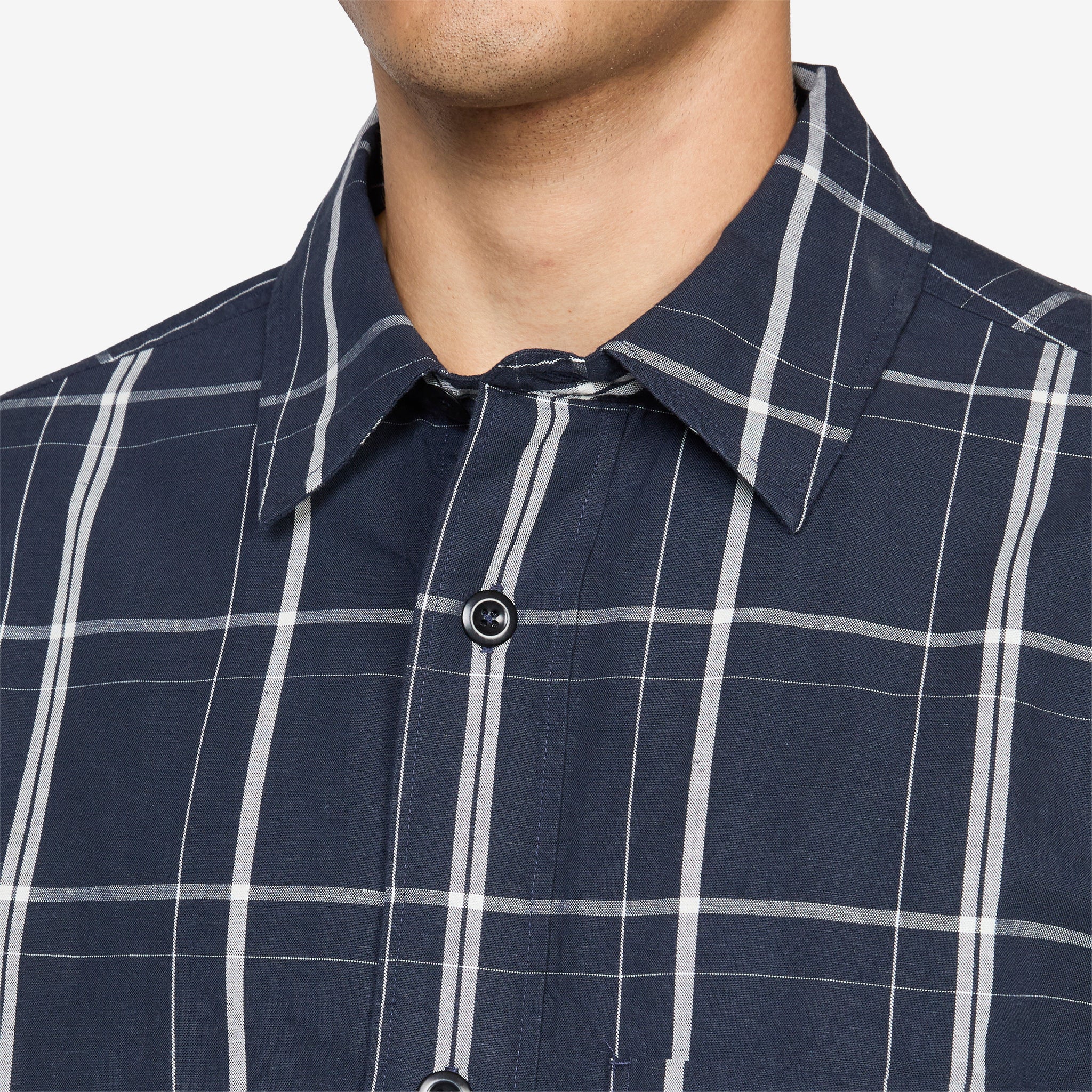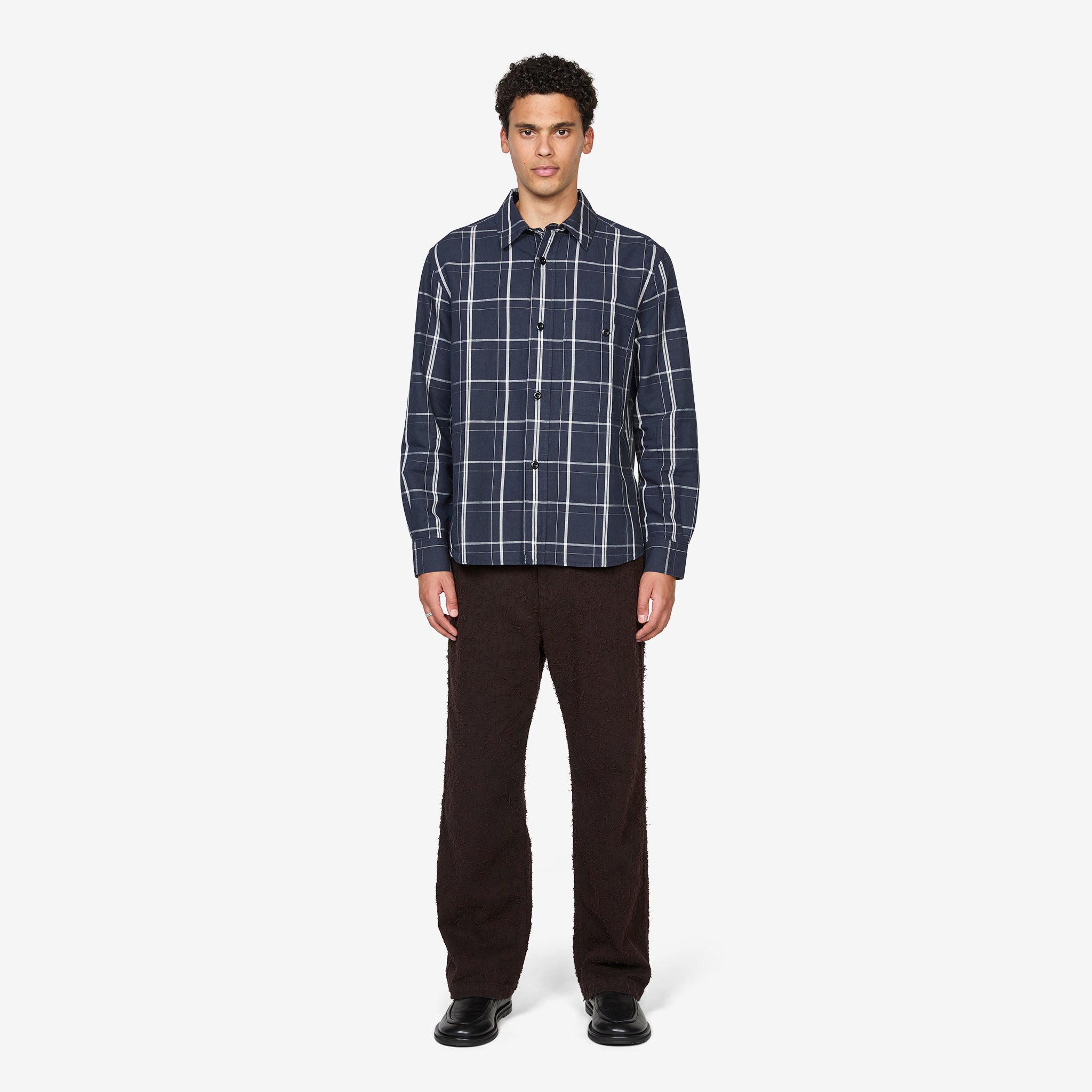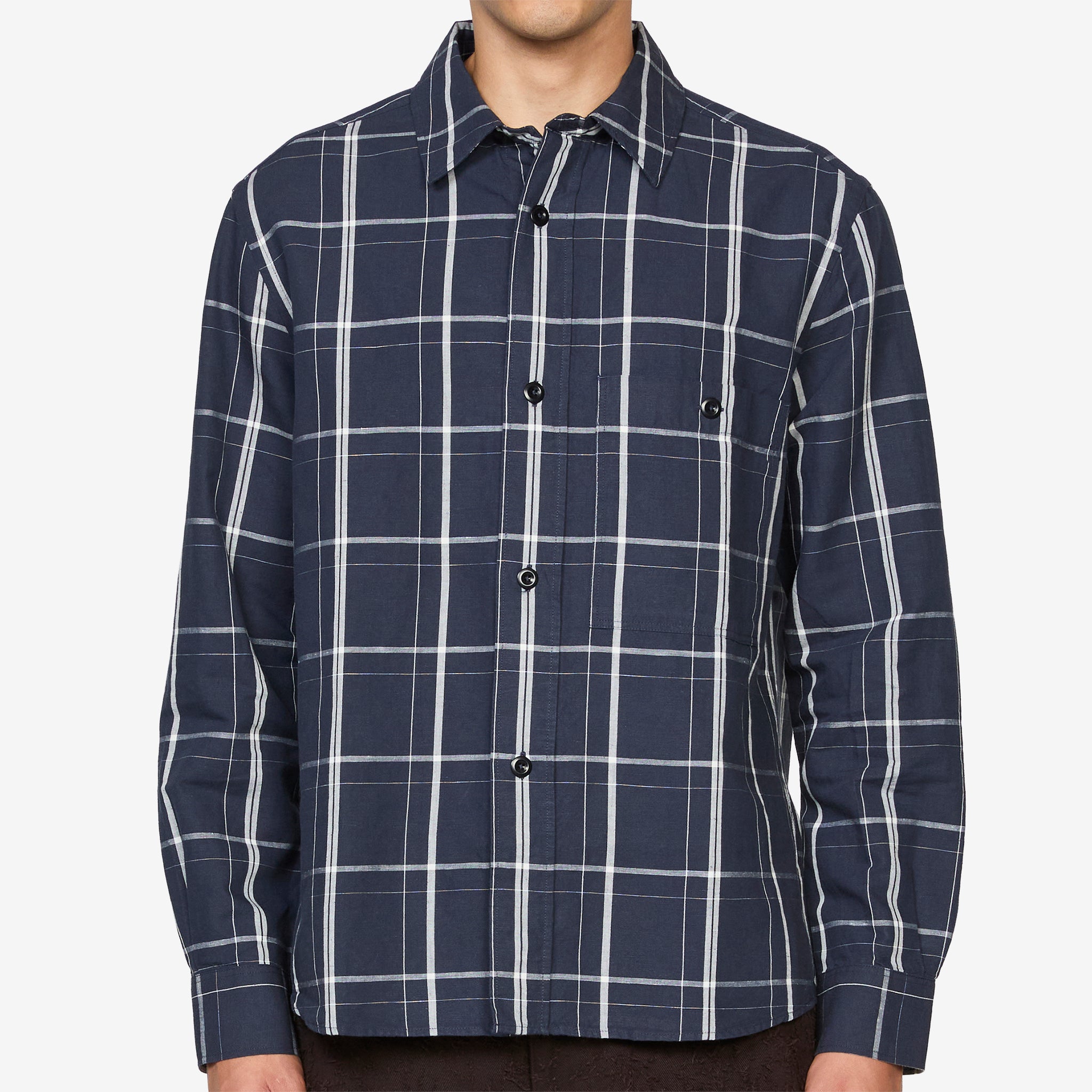 Overall Shirt in Slate Blue and Off White from MHL. by Margaret Howell. Regular fit shirt with a boxy silhouette, classic collar, corozo brace buton closure and side gusset stitch detailing. Crafted from midweight cotton linen plainweave in a graphic check. Finished with a patch chest pocket and pleated back yoke.