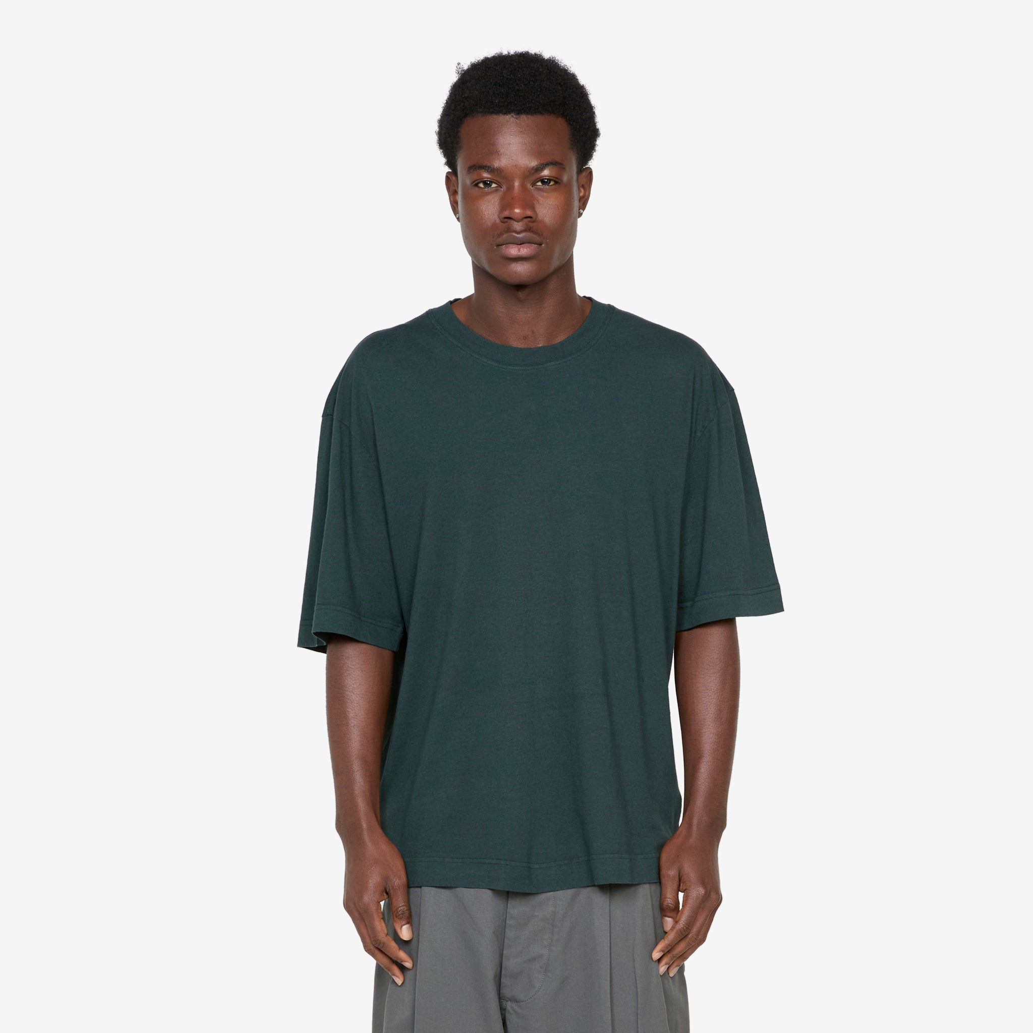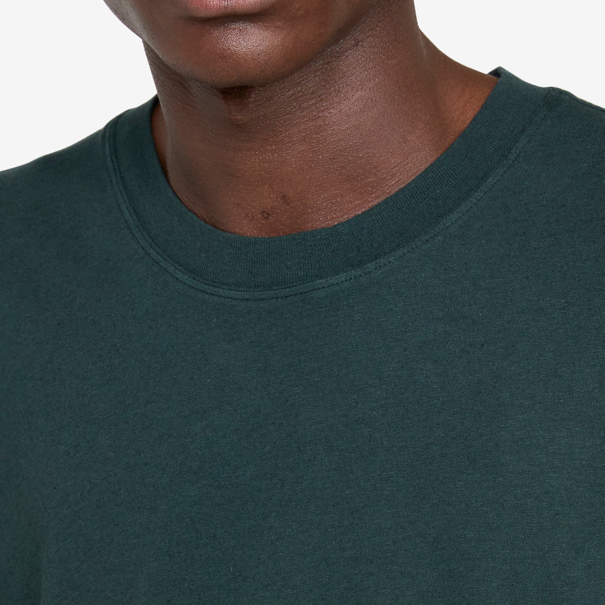 Simple T-Shirt in Algae from MHL. by Margaret Howell. Relaxed, boxy cut t-shirt in lightweight cotton linen jersey. Vent split hem. Herringbone tape detailing inside the neck.