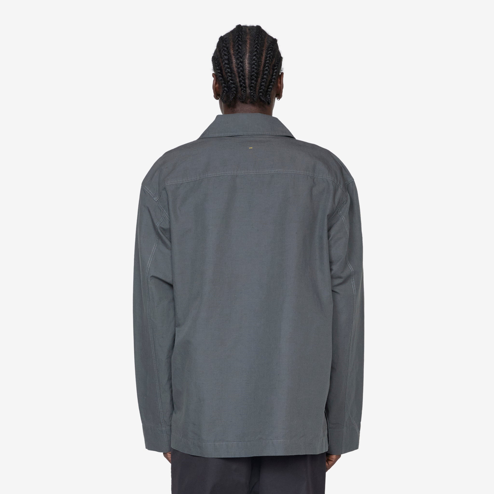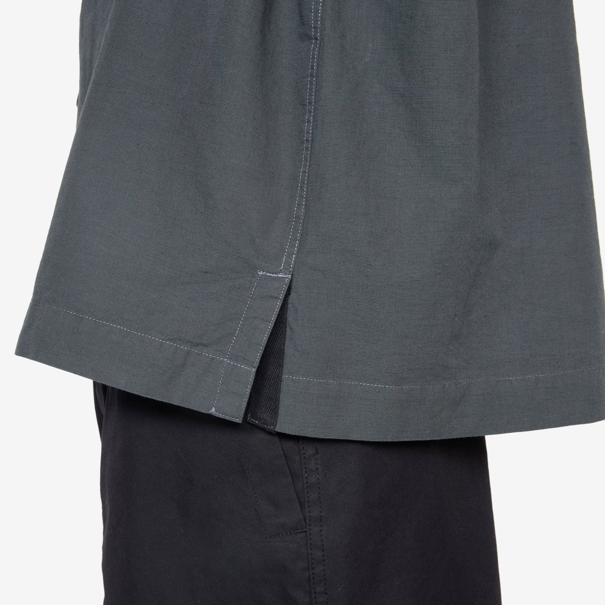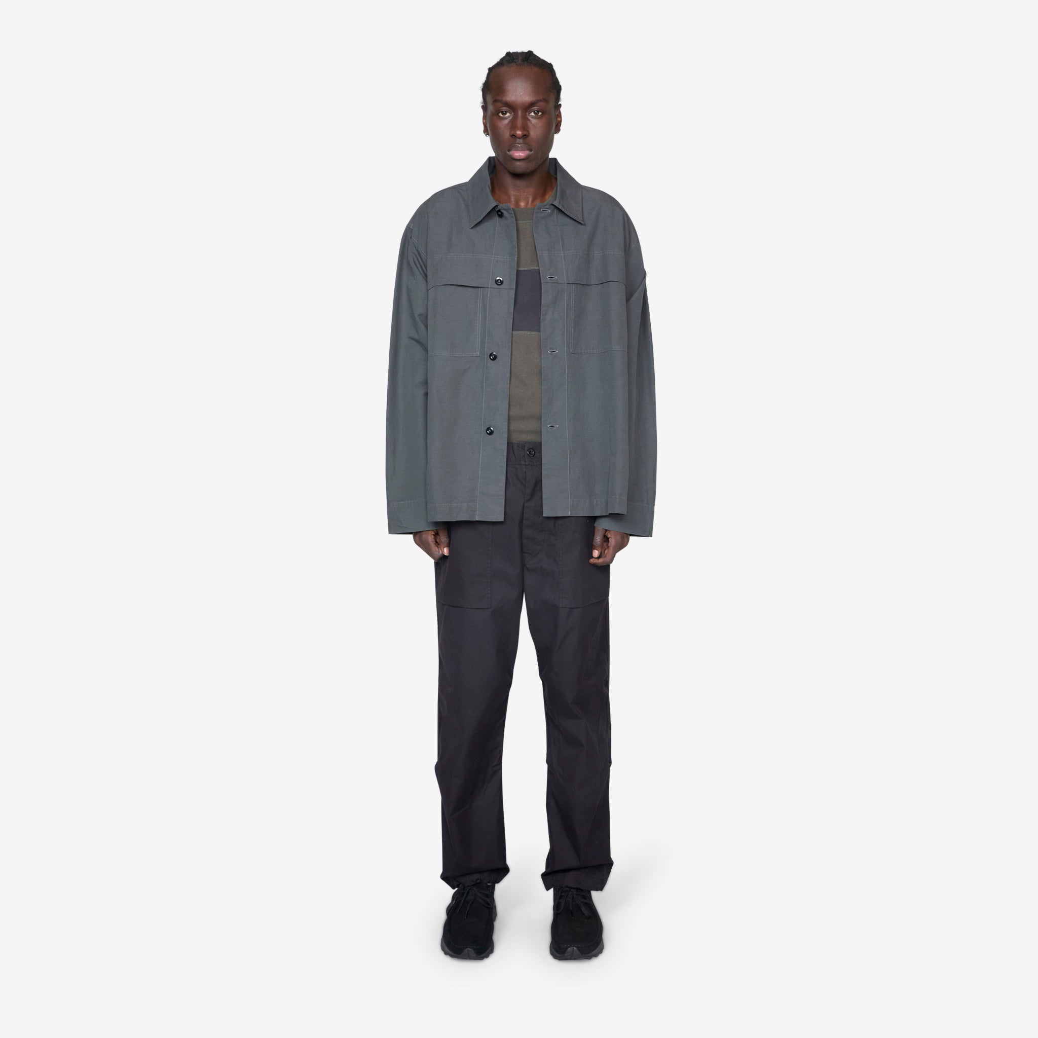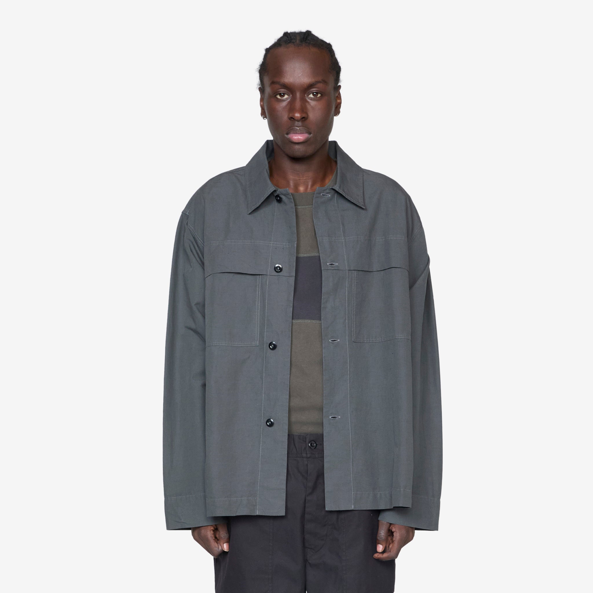 Storm Flap Shirt in Carbon from MHL. by Margaret Howell. Relaxed fit overshirt with a classic collar, corozo brace button closure and a side split hem. Crafted from a plainweave cotton and linen blend with herringbone tape detailing. Finished with large storm flap patch pockets at the chest.