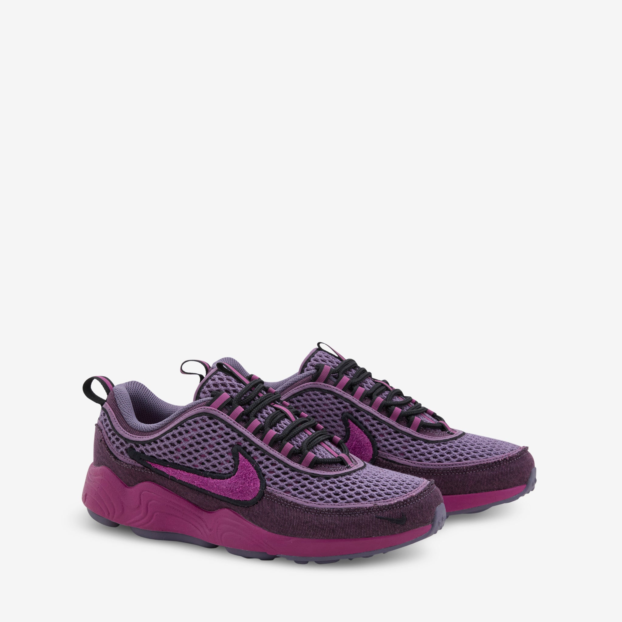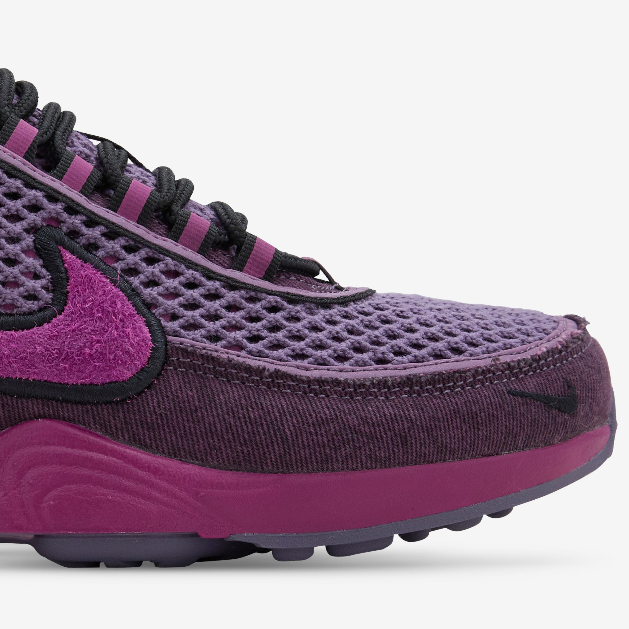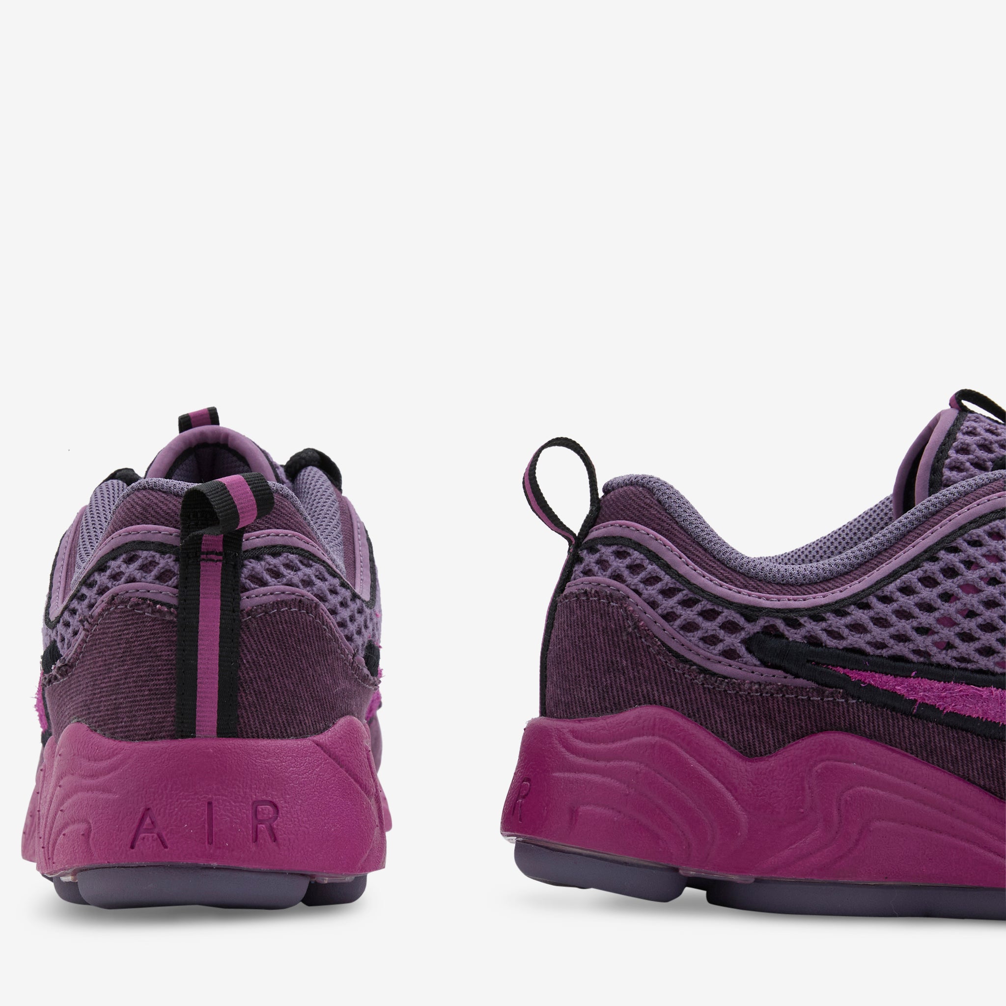 Men's Air Zoom Spiridon PRM in Hot Fuchsia, Viotech, Black and Canyon Purple from Nike. Originally released in 1997, the Air Zoom Spiridon returns featuring a breathable premium upper with open mesh construction and a protective denim mudguard. Zoom Air cushioned midsole offers bouncy everyday comfort whilst the sculpted rubber outsole provides classic traction. Finished with a hairy suede Swoosh.