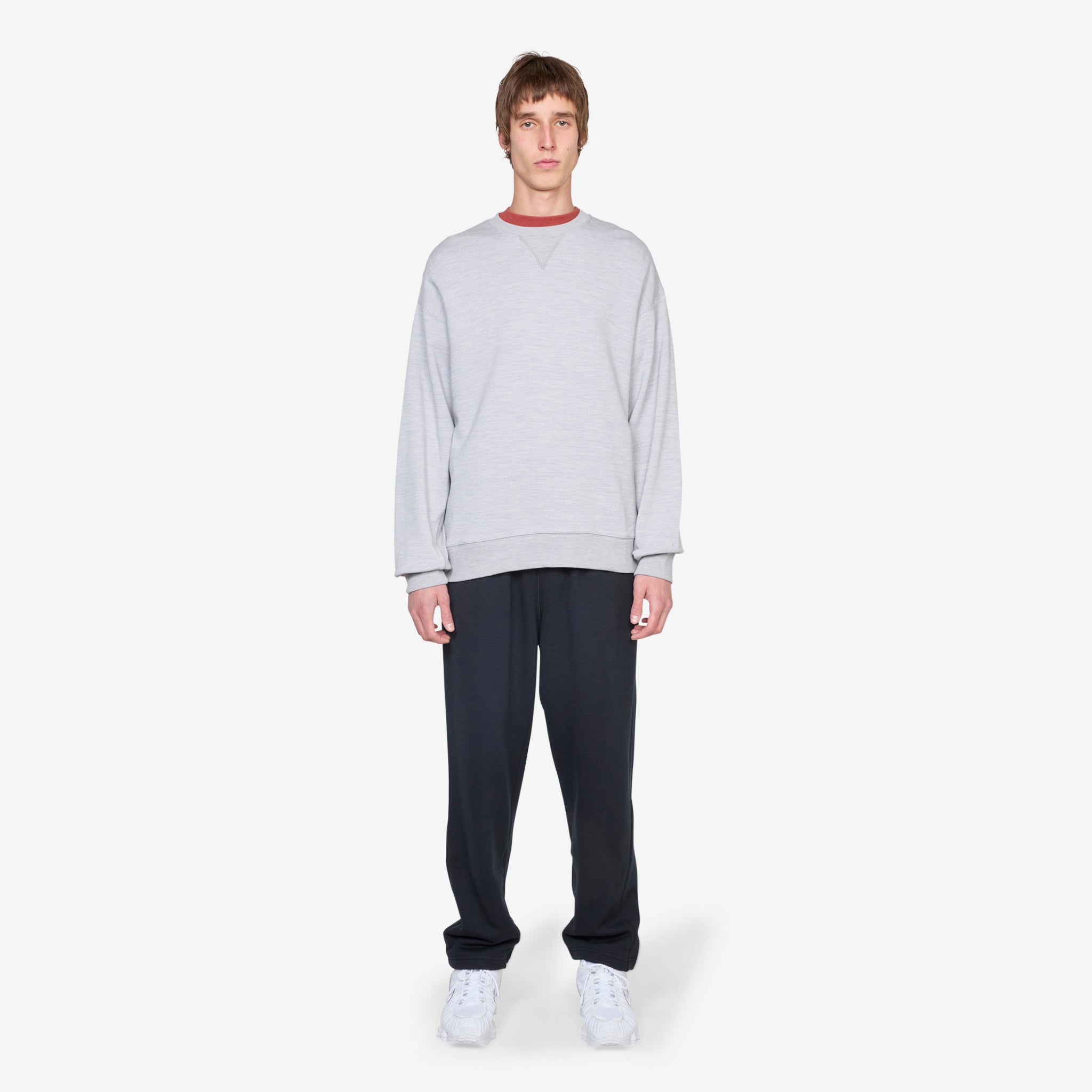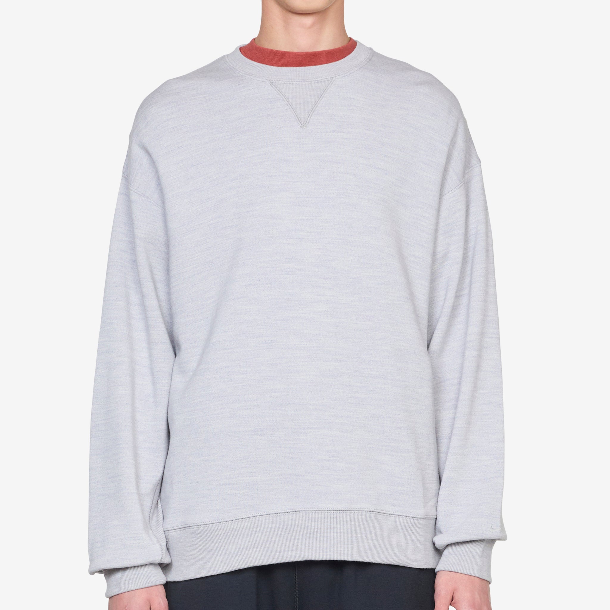 Nike Wool Classics Crew in Silver and Heather from Nike. Relaxed fit pullover sweatshirt with ribbed trims and a ribbed v-inset. Crafted from a heavyweight cotton and wool blend for breathable warmth and a plush feel. Finished with tonal embroidered branding on the left sleeve.