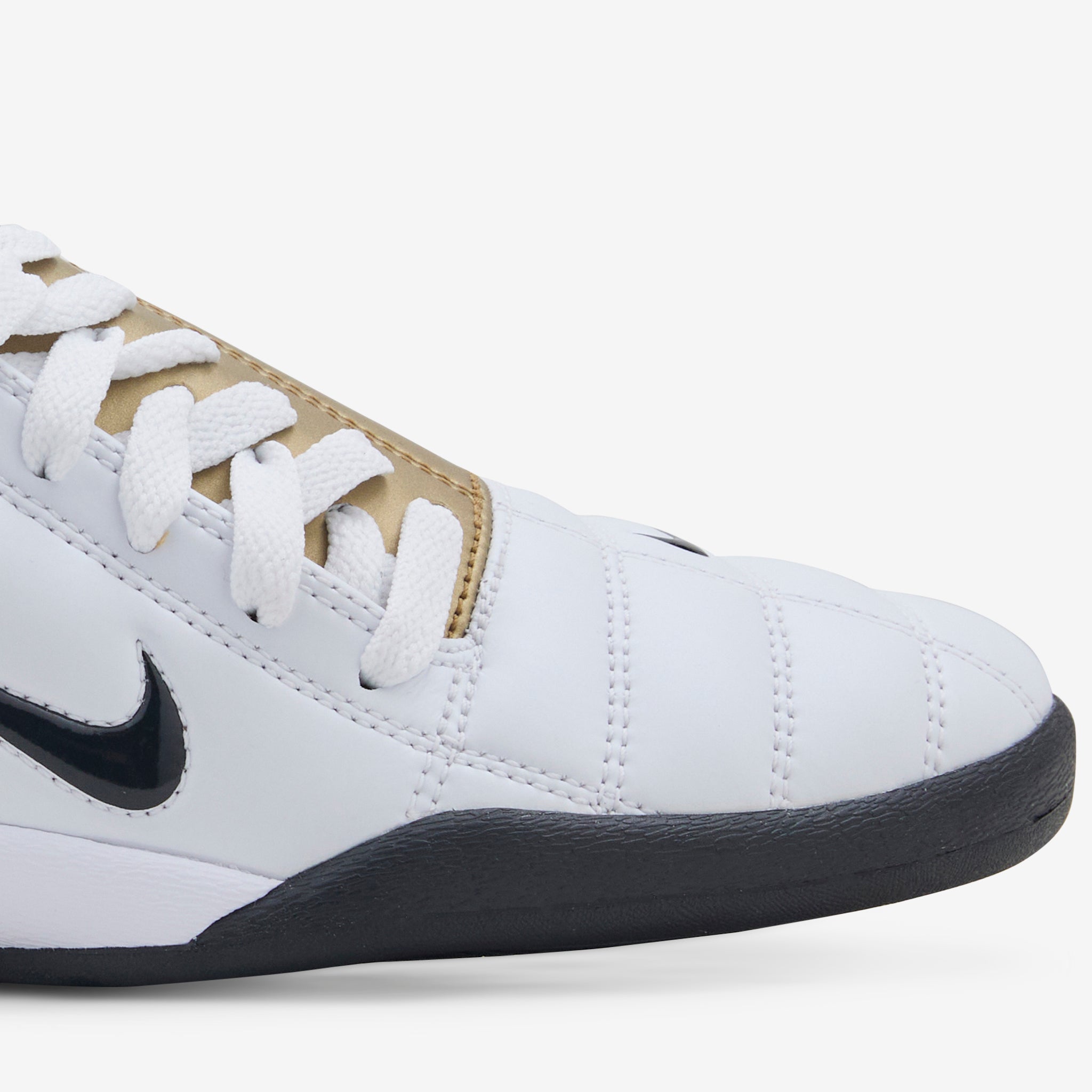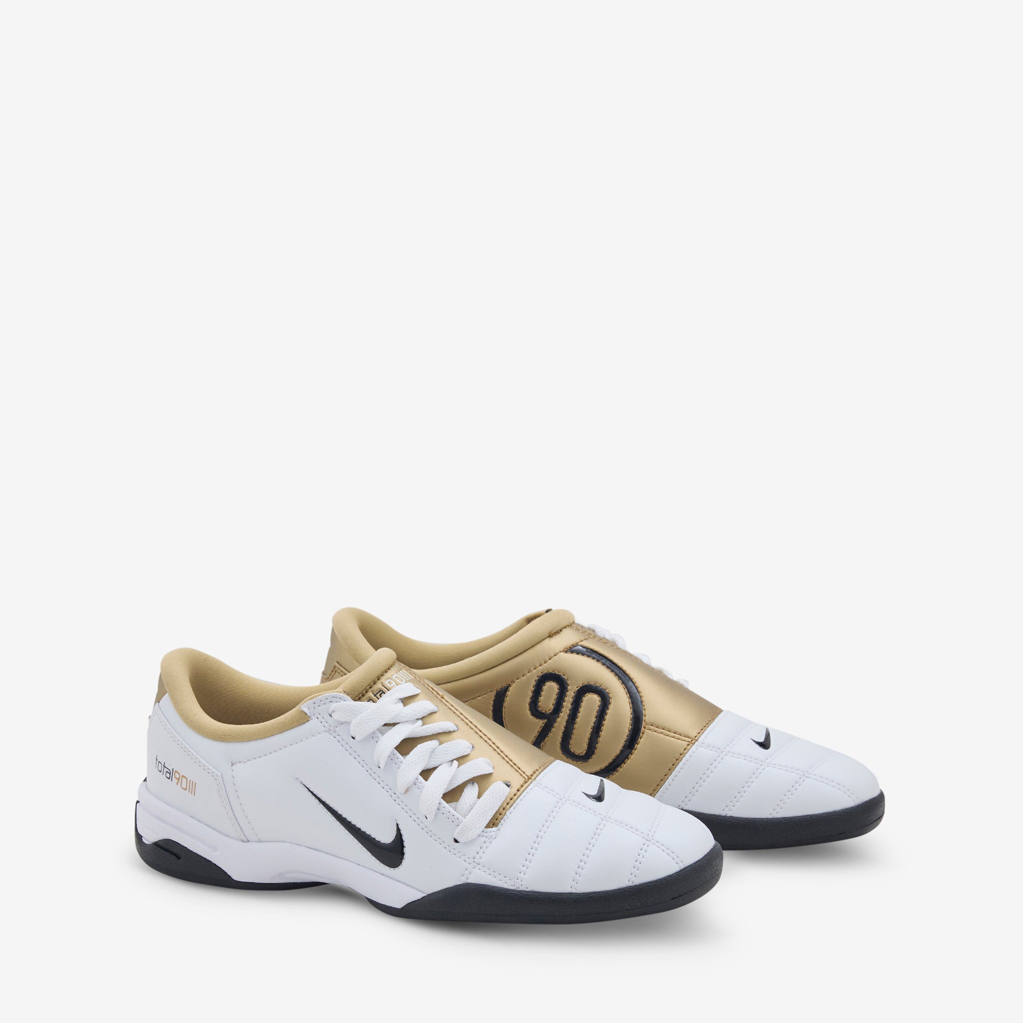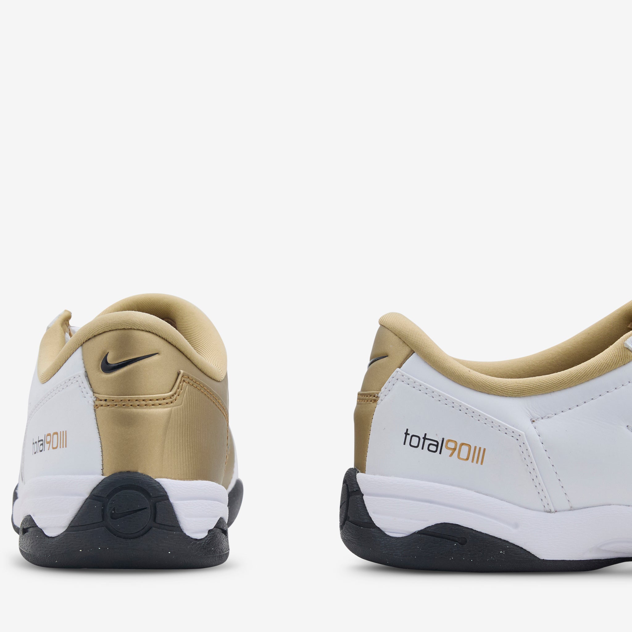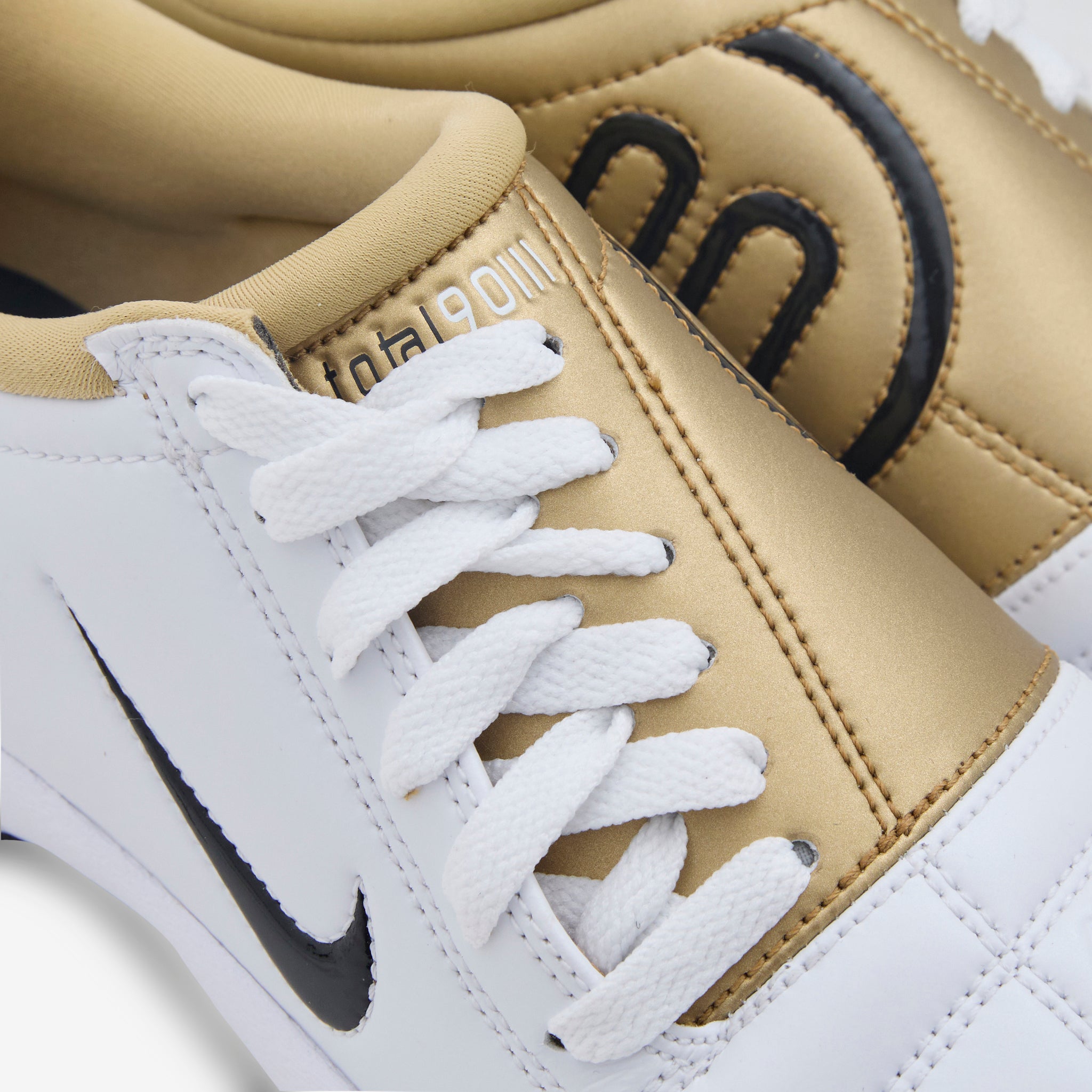 Men's Total 90 in White and Black and Metallic Gold from Nike. A reimagined football boot silhouette featuring a premium low-profile quilted upper with asymmetrical lacing. Plush padded collar provides daily comfort while the flat gum rubber outsole offers durable traction. Finished with iconic Total 90 legacy graphics and detailing throughout.
