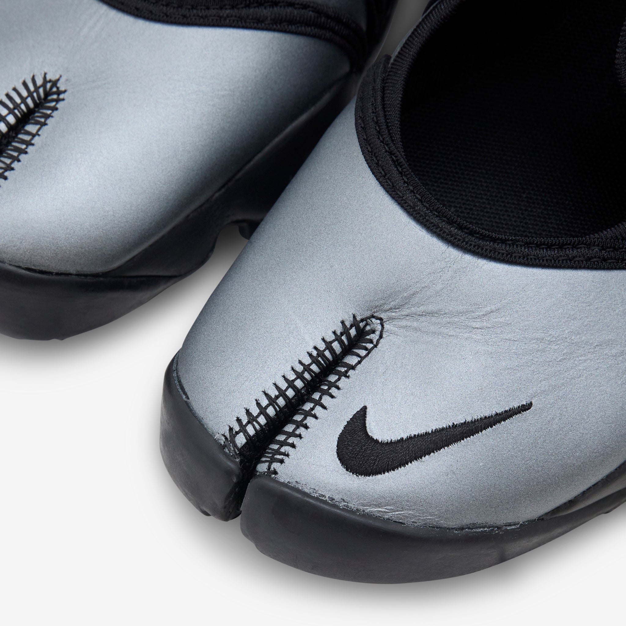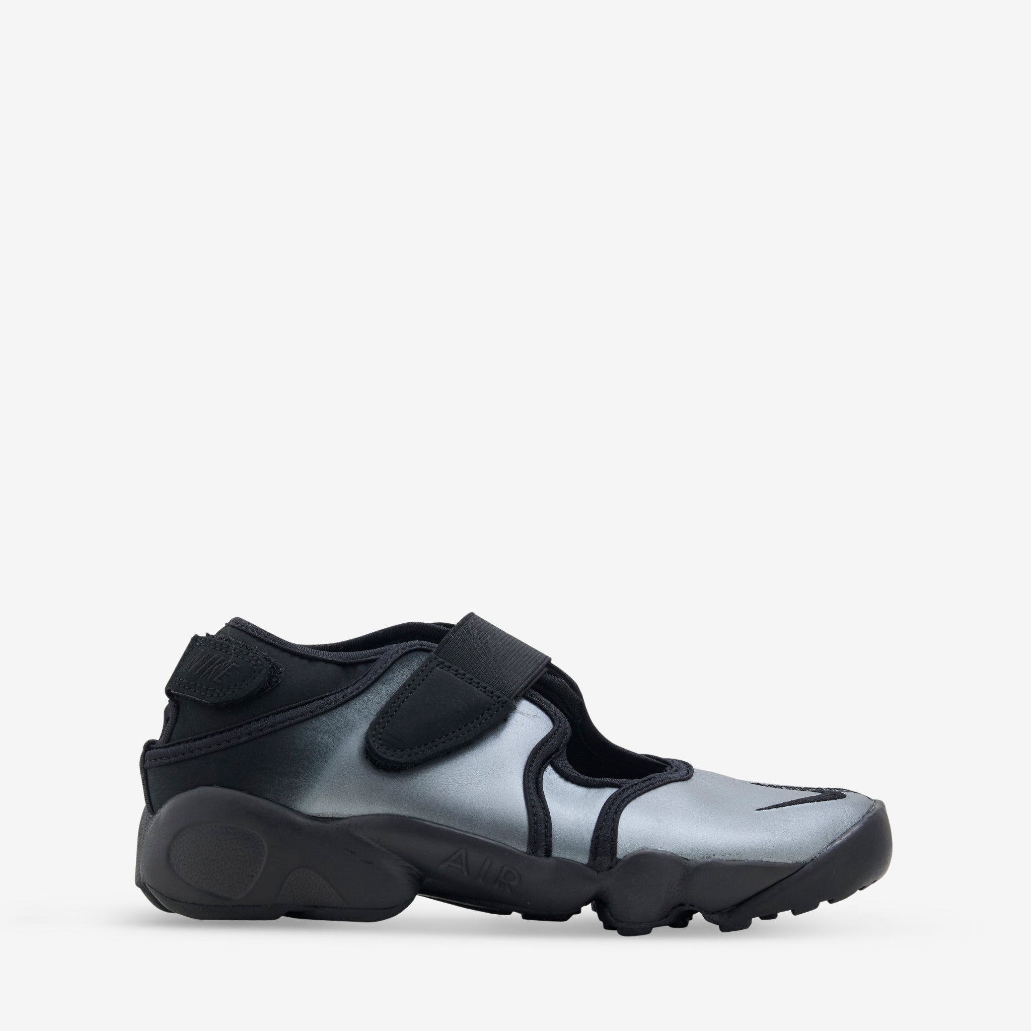 Women's Air Rift Leather in Metallic Silver and Black from Nike. Barefoot-style shoe based on the '96 original featuring a smooth leather upper, hook-and-loop straps at the midfoot and heel and a split-toe design for ultimate comfort. Plush foam midsole with a Nike Air unit heel provides a cushioned wear whilst the rubber detailed outsole offers rugged tread for added traction.
