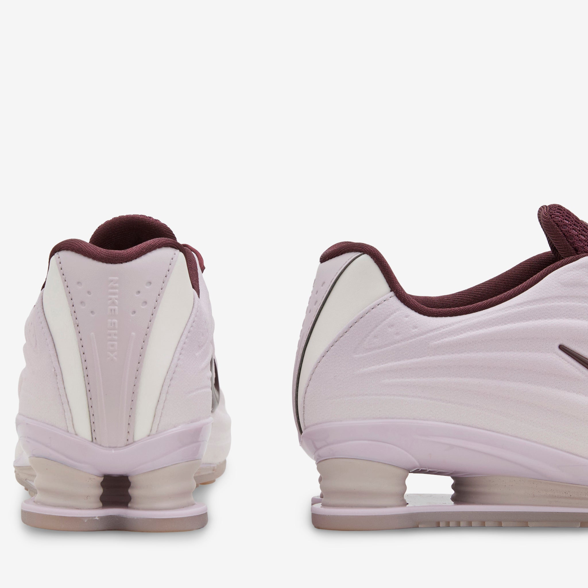 Women's Shox Z SE in Particle Rose, Burgundy Crush and Phantom from Nike. Low-profile take on the Shox silhouette featuring a breathable textile upper with synthetic leather accents and shiny finishes. Foam midsole and Nike Shox columns provide resilient cushioning. Finished with a ribbon lace closure.