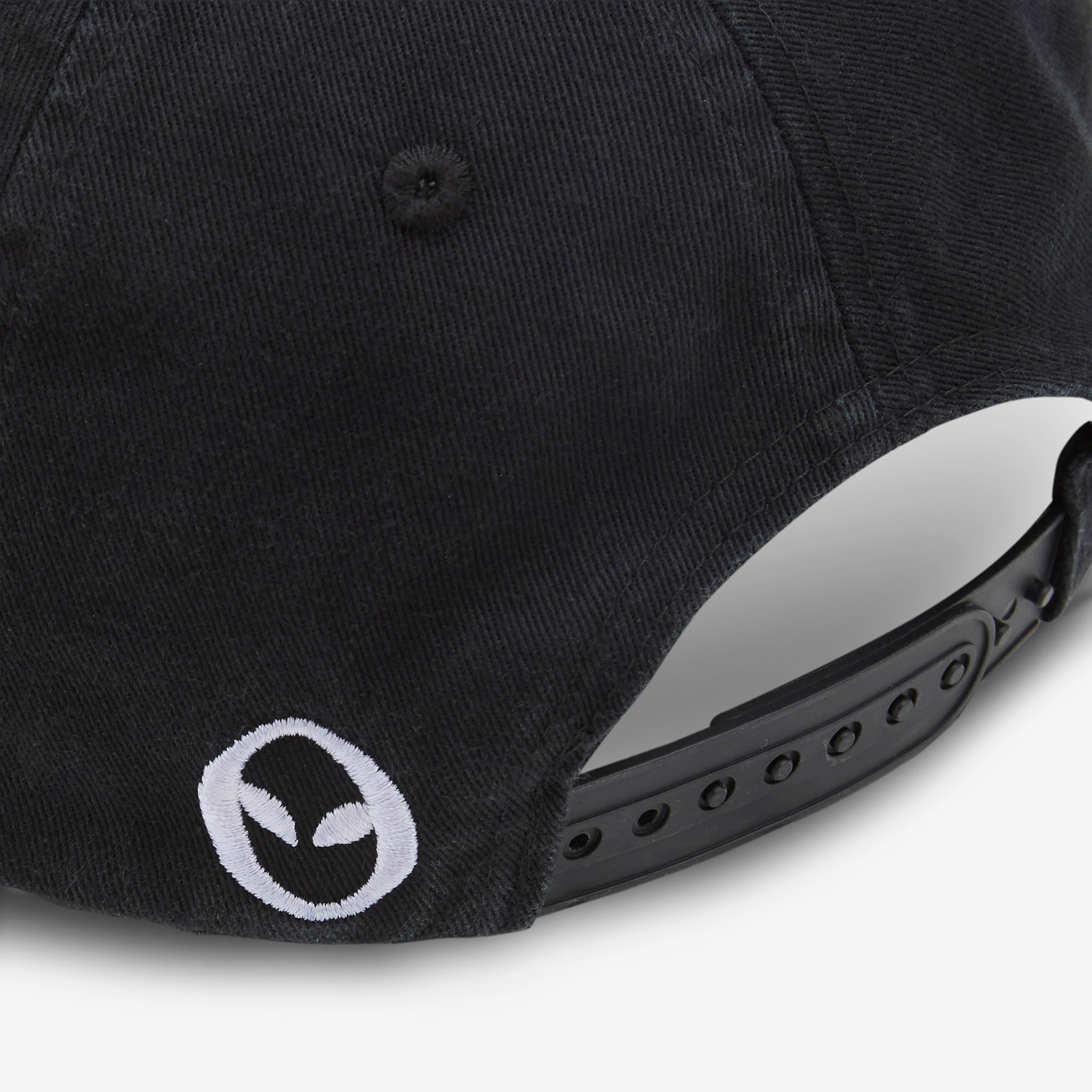 No Problemo Cap in Black from No Problemo. Structured 6-panel cap with embroidered ventilating eyelets and adjustable snapback closure. Crafted from a durable cotton fabric and finished with embroidered branding at the front and back.