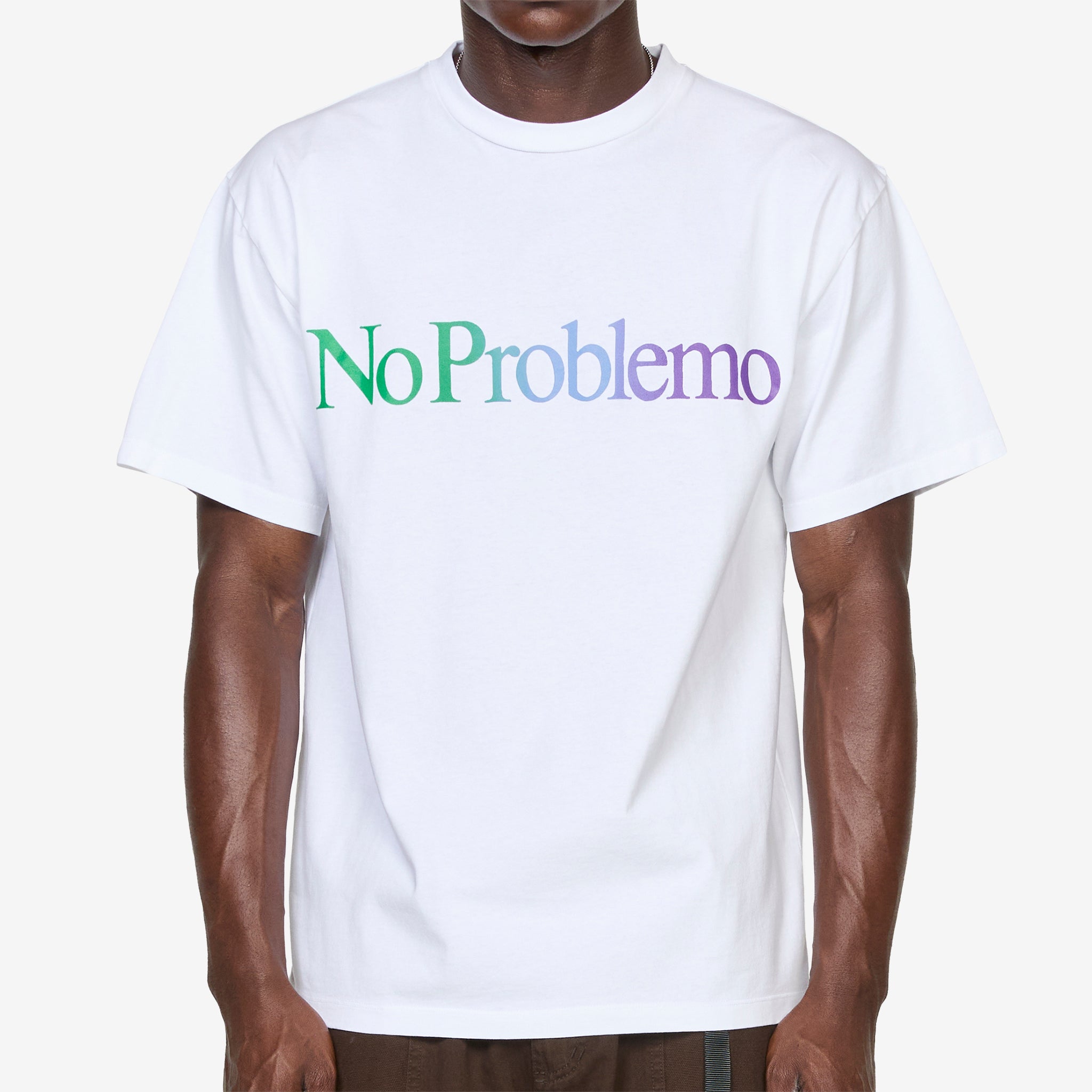 No Problemo Gradient T-Shirt in White from No Problemo. Relaxed fit t-shirt with a ribbed crew neckline. Crafted from 220gsm heavyweight cotton jersey and finished with a printed graphic across the chest.