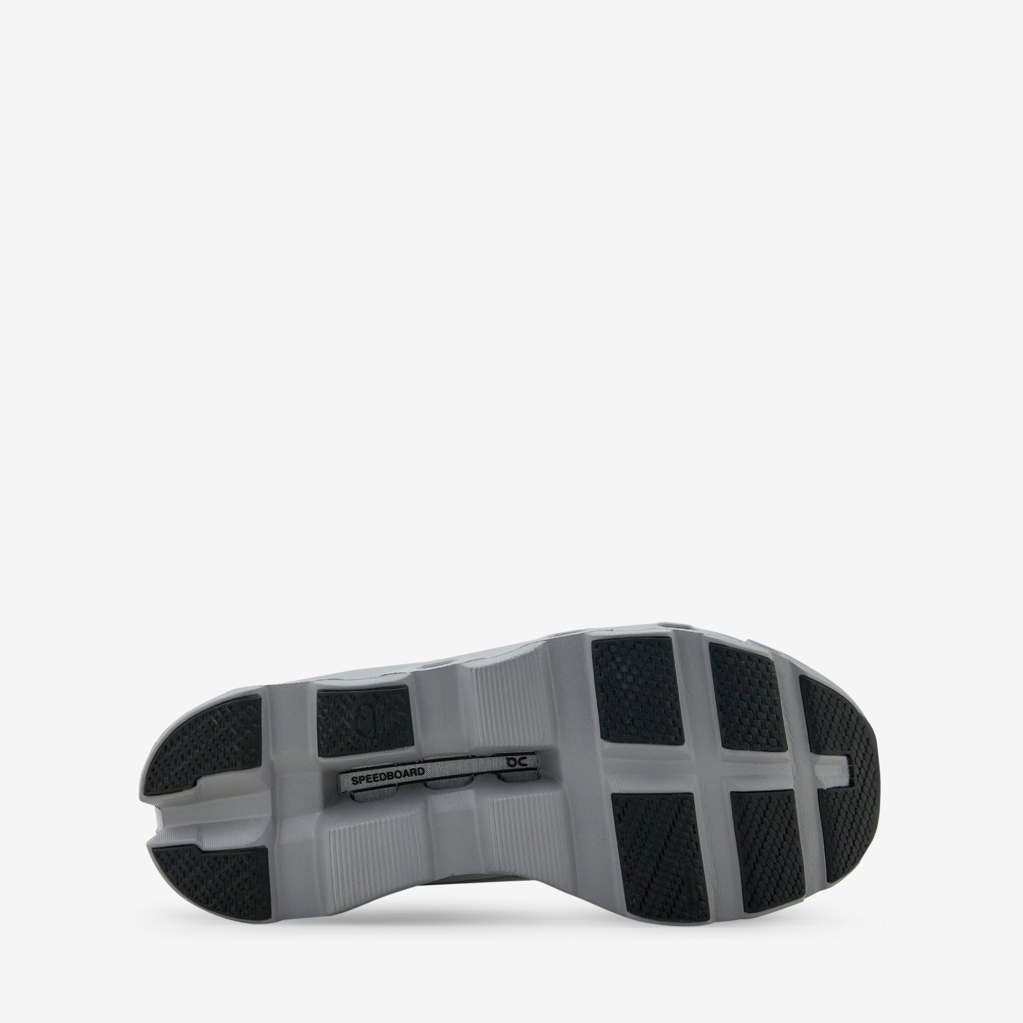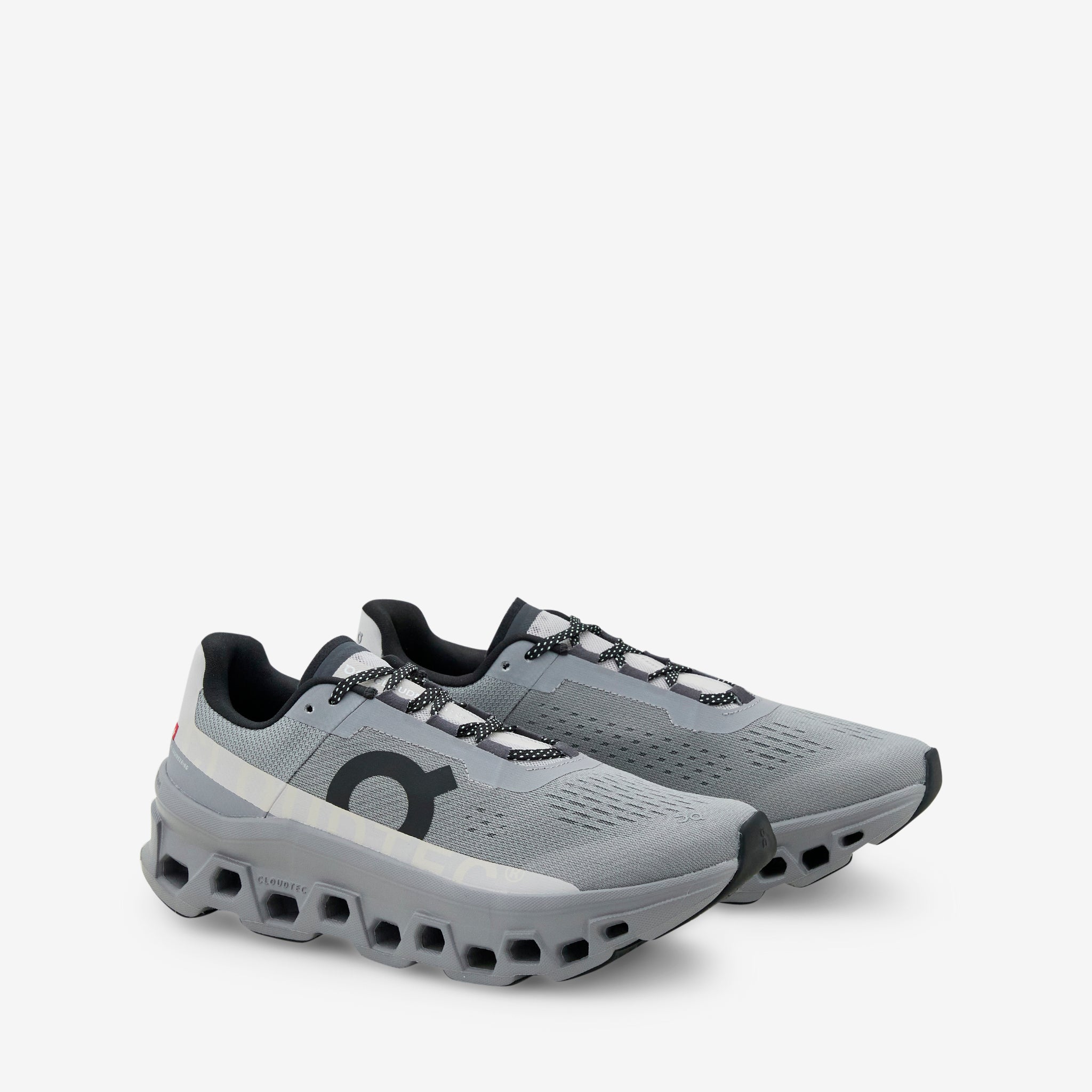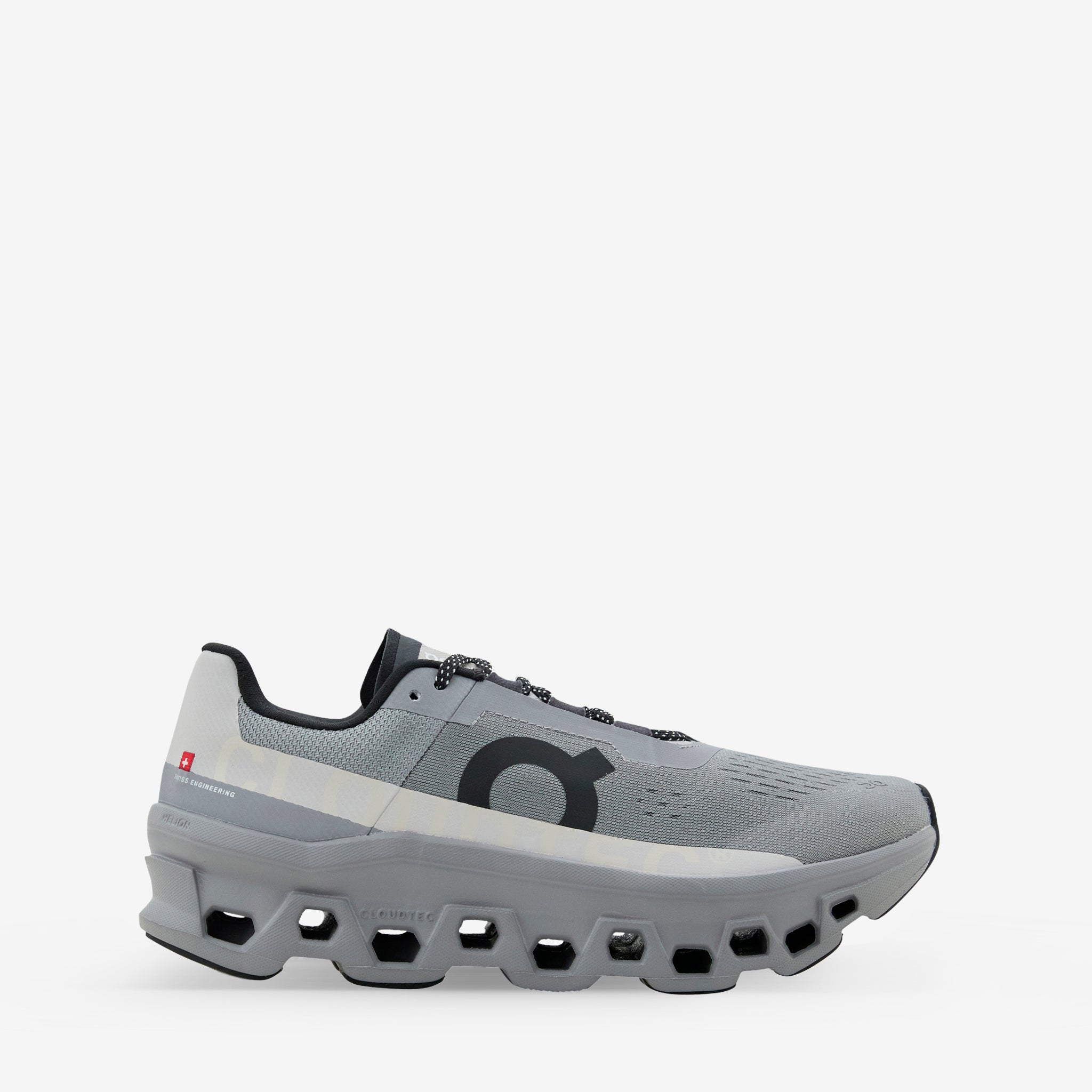 Men's Cloudmonster in Alloy and Silver from On. Lightweight forward-rolling running shoes with a recycled polyester upper. Helion™ superfoam absorbs impact on landing whilst the Snappy Speedboard® provides maximum energy return. Finished with branding on the upper.