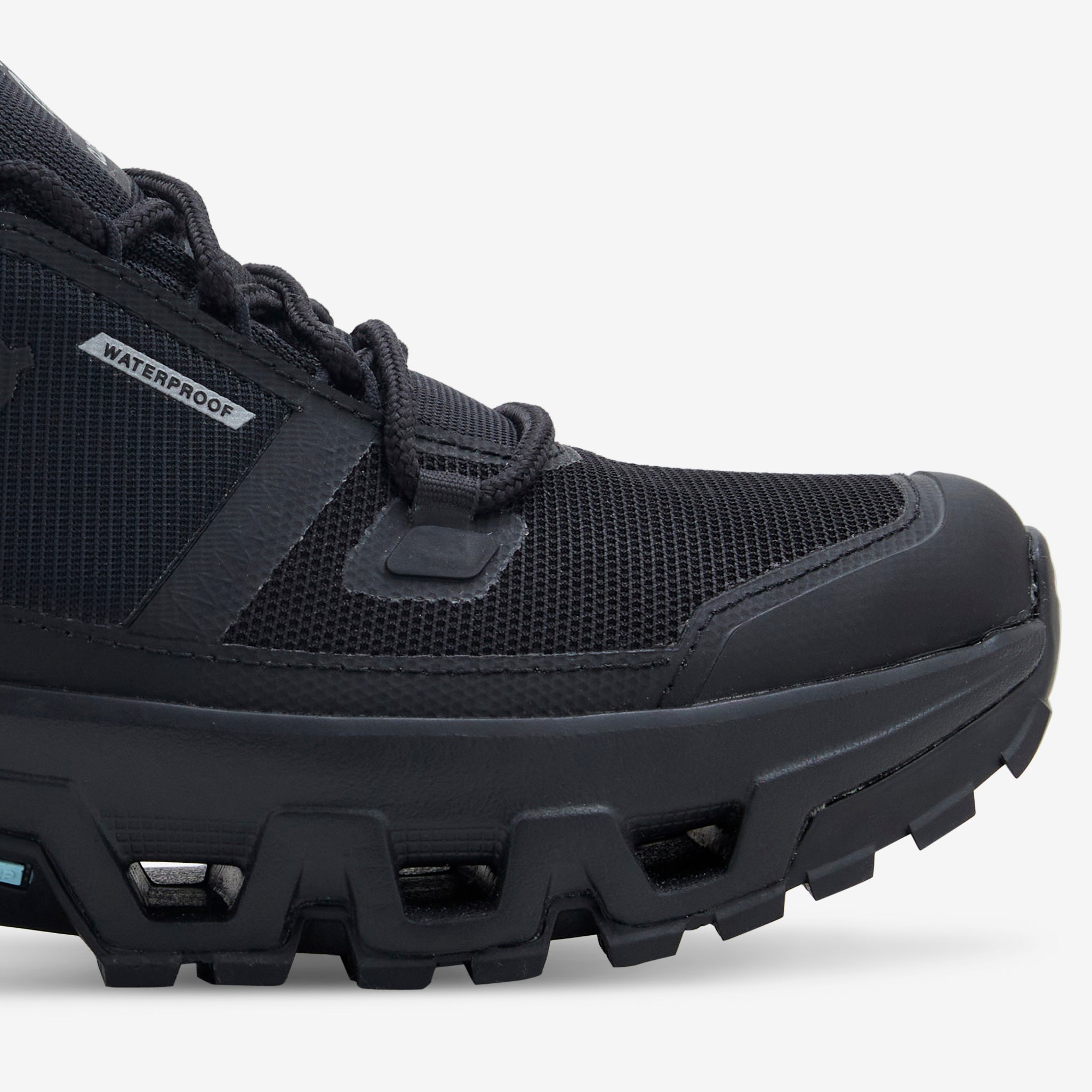 Women's Cloudrock Low Waterproof in Black from On. Waterproof all-terain upper featuring a protective toe cap and TPU mudguard. Helion™ superfoam midsole provides cushioning for every step while the X-shaped Speedboard® offers flexibility and stability. Finished with an upgraded Missiongrip™ outsole for reliable grip and traction