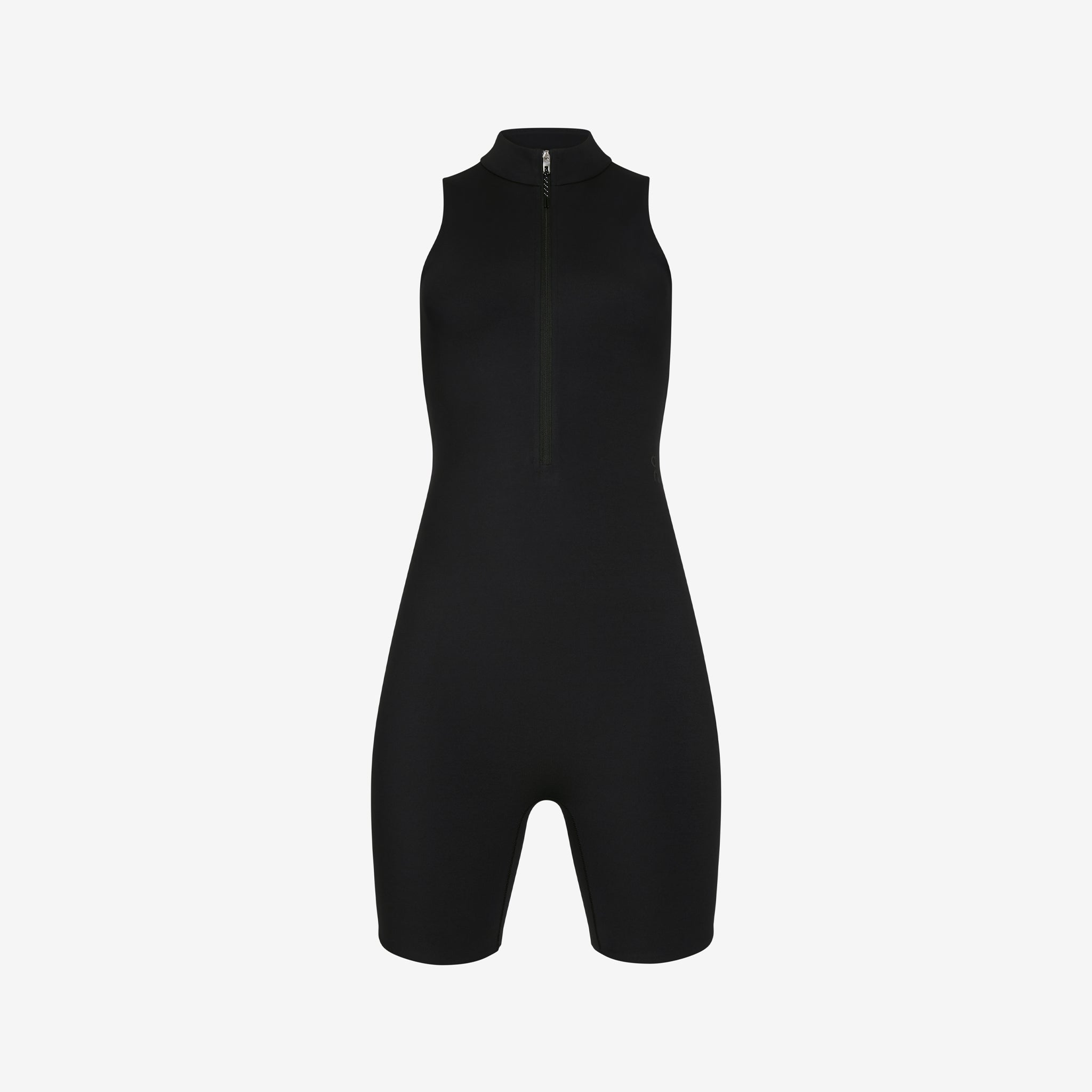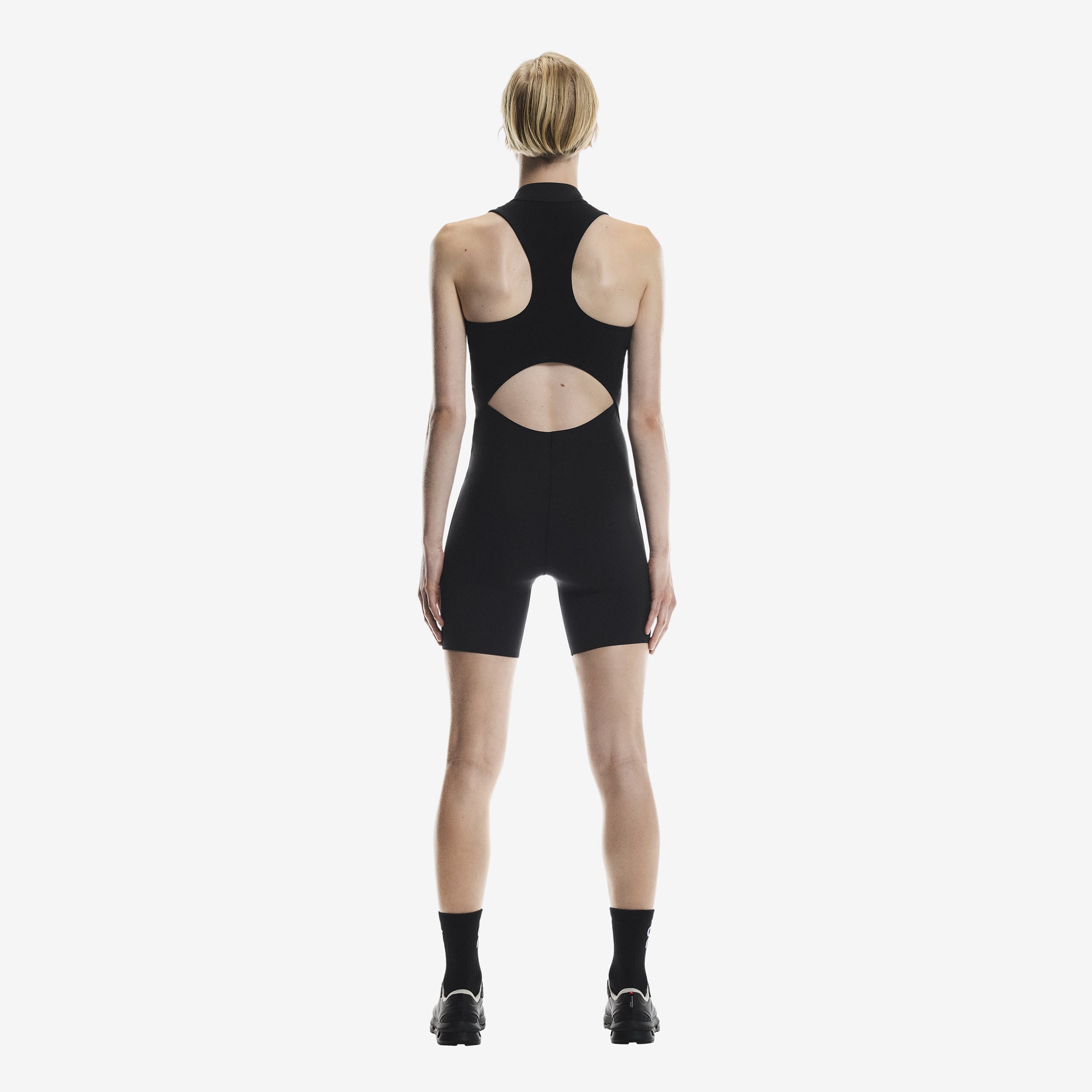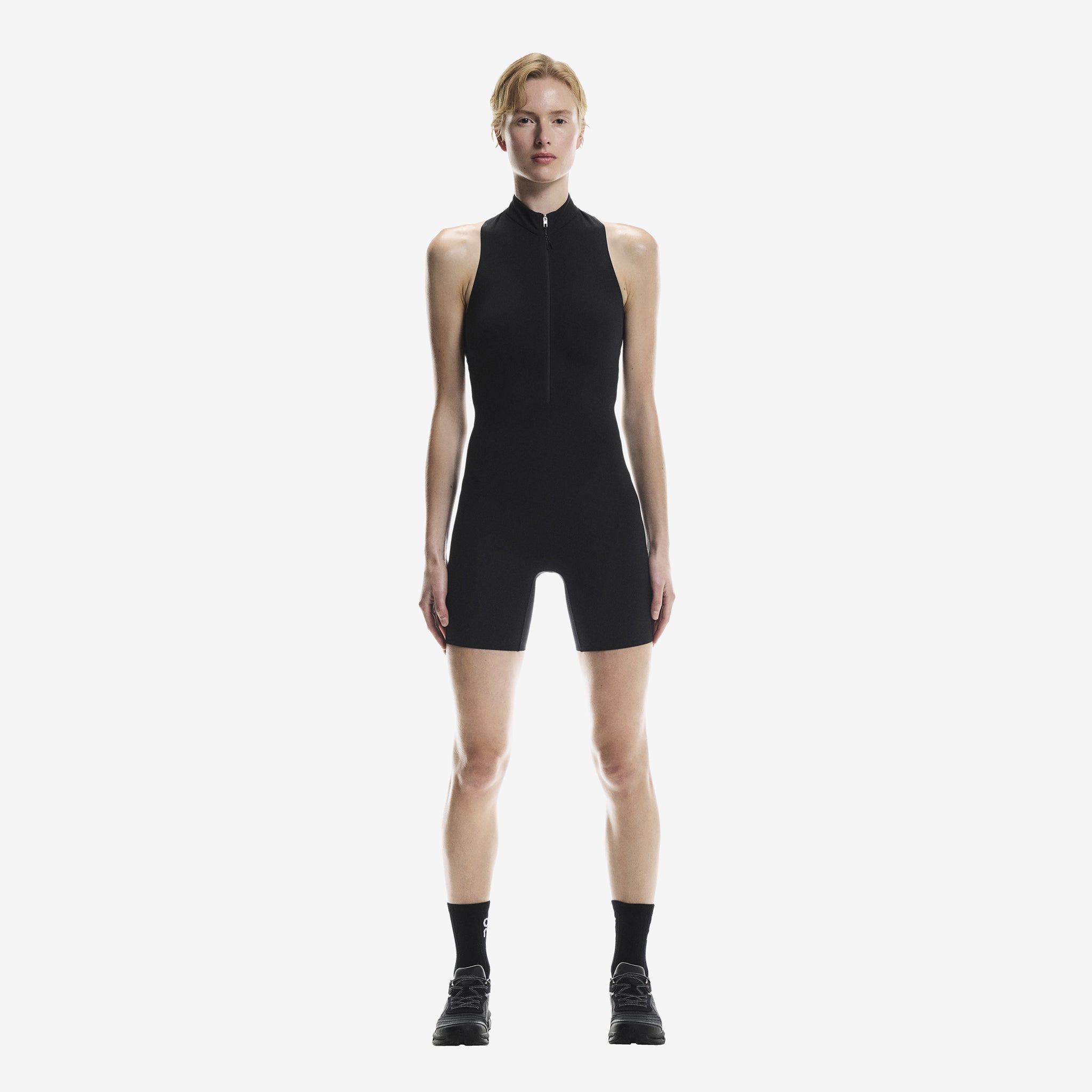 Women's Studio Bodysuit in Black from On. Fitted bodysuit with a high neckline, half-zip fastening and bonded edges for reduced friction. Crafted from a breathable, moisture wicking performance fabric. Finished with power-racer cutout at the back for optimal ventilation.